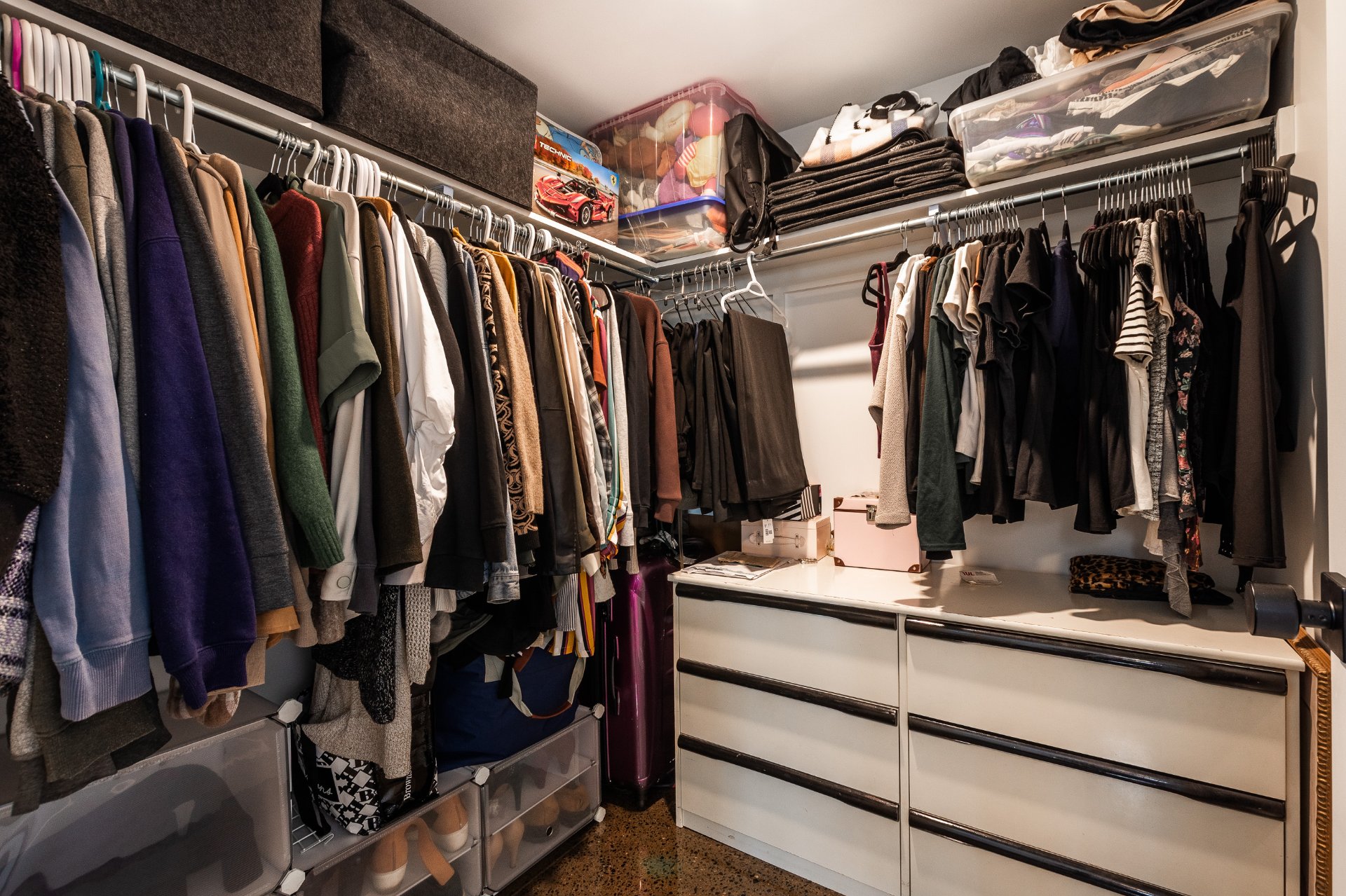 une chambre à coucher avec garde-robe walk-in ainsi qu'une