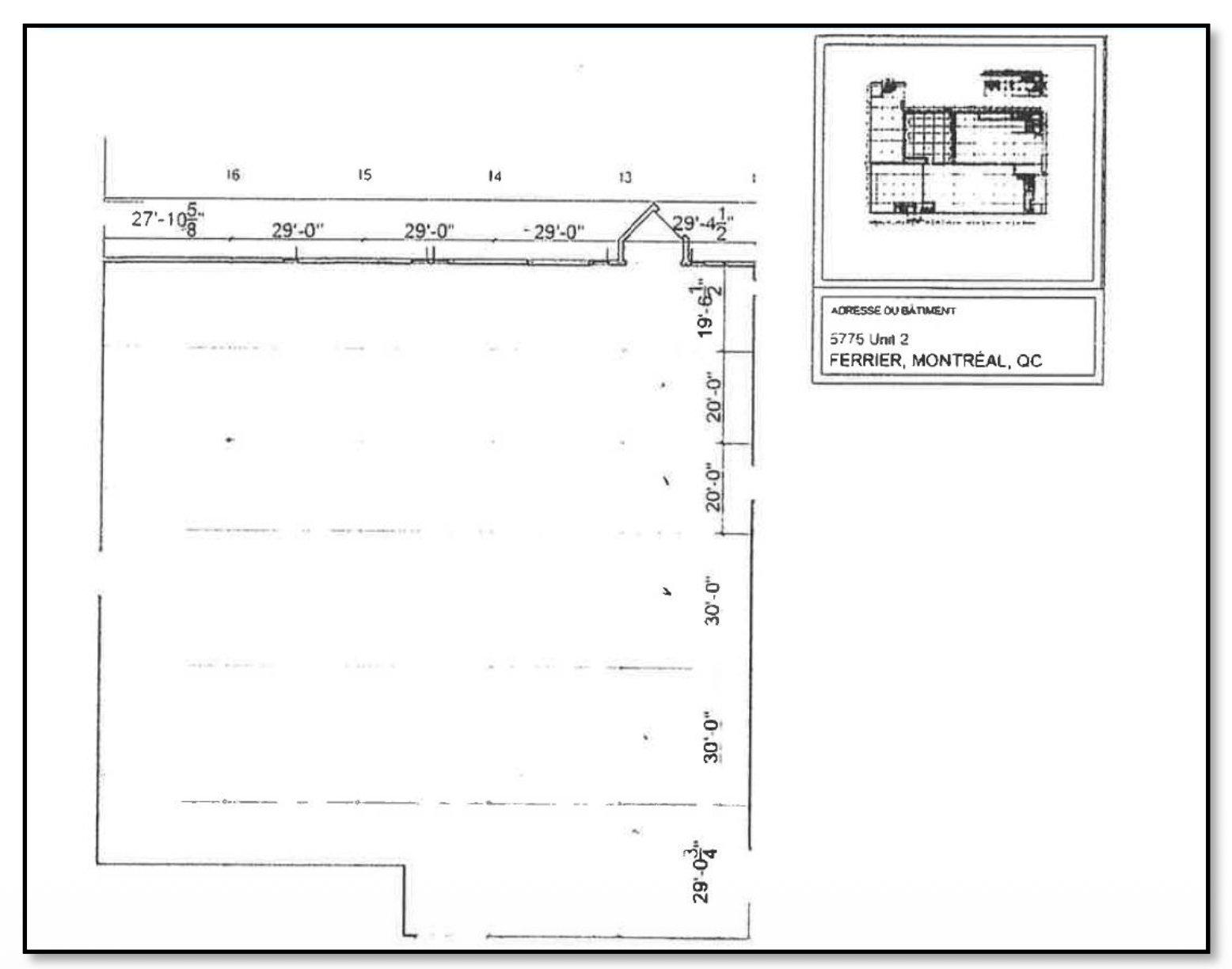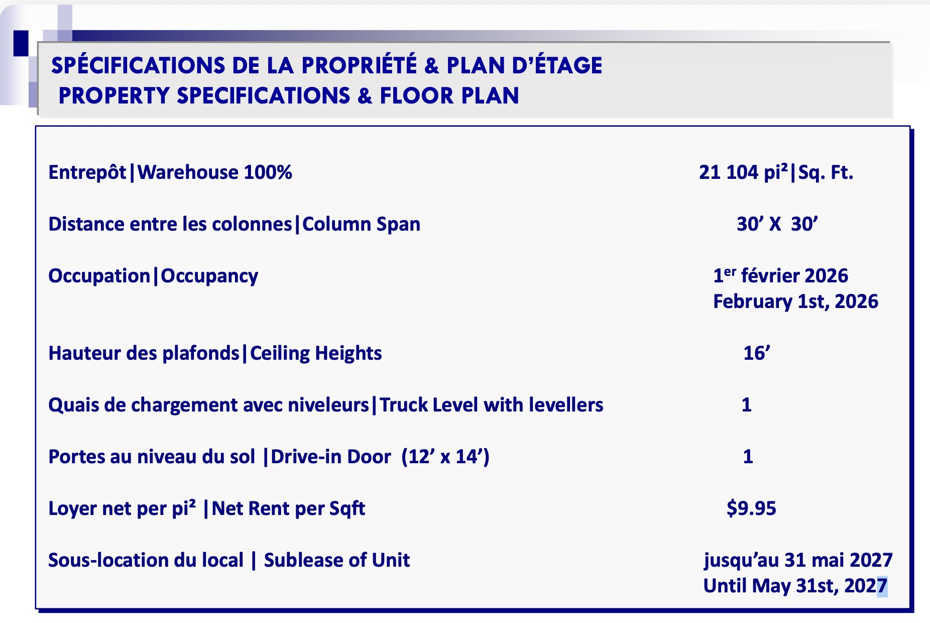 Sublet with possibility of new lease upon expiry. Occupancy beginning February 1, 2026; 21,104 square feet of warehouse space for sub-lease; 30' x 30' column span; 16' ceiling height; truck level with levellers; drive-in door (12' x 14').