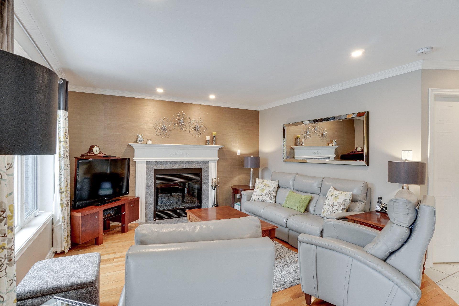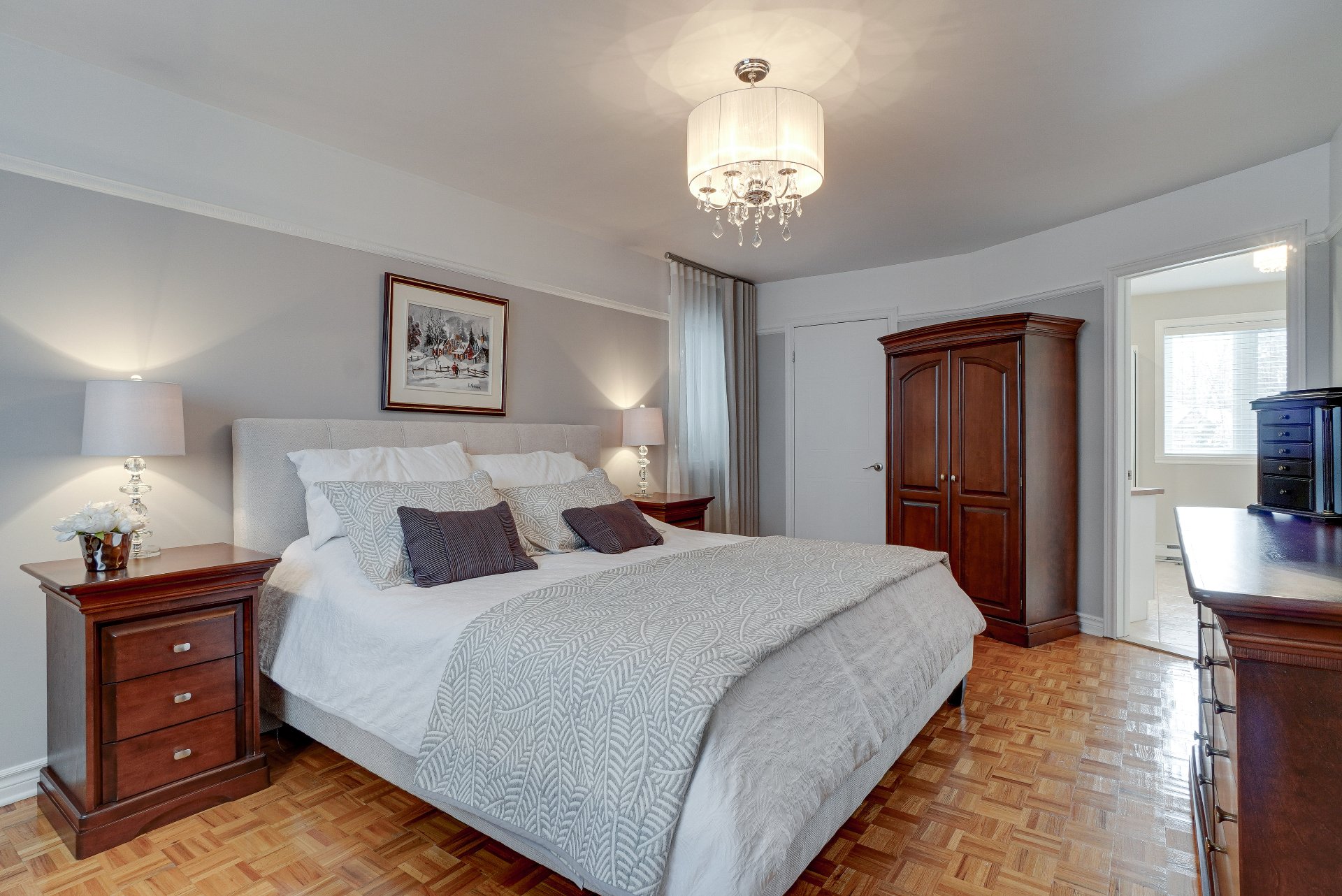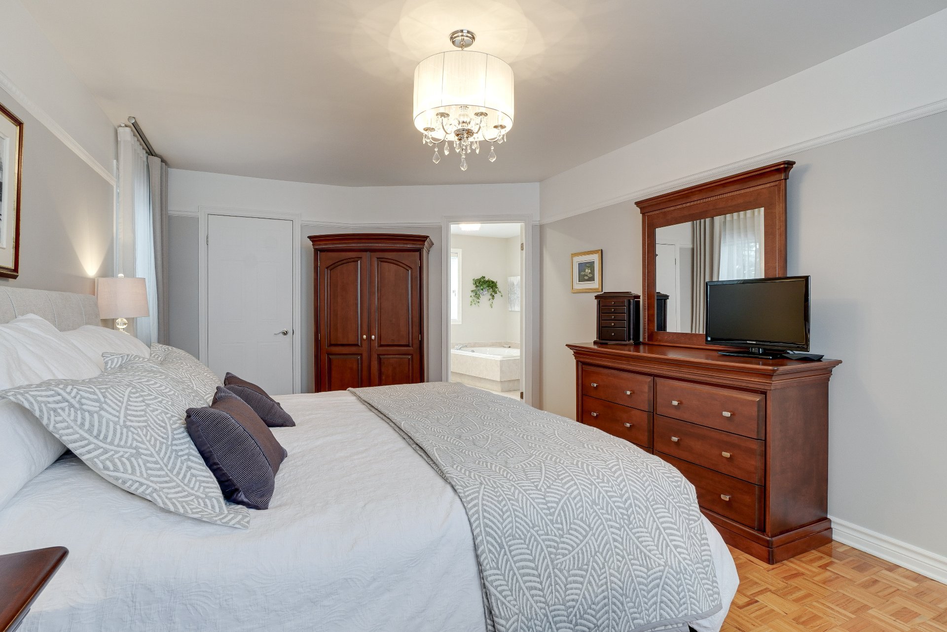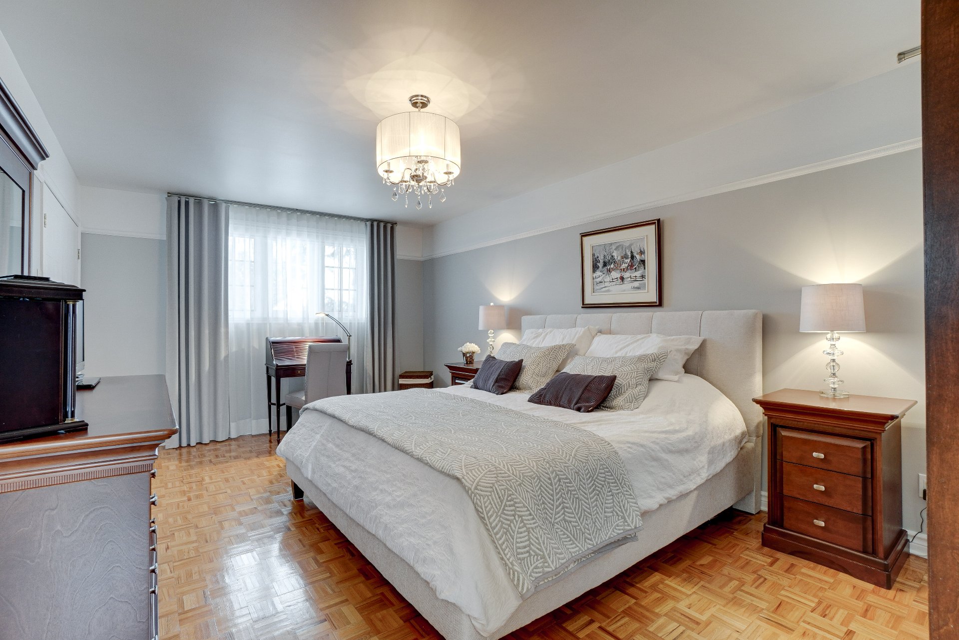 robot piscine, poles et rideaux de la porte patio et du salon arrière, lustre de la chambre principale, miroir maquillage fixé au mur chambre des maîtres