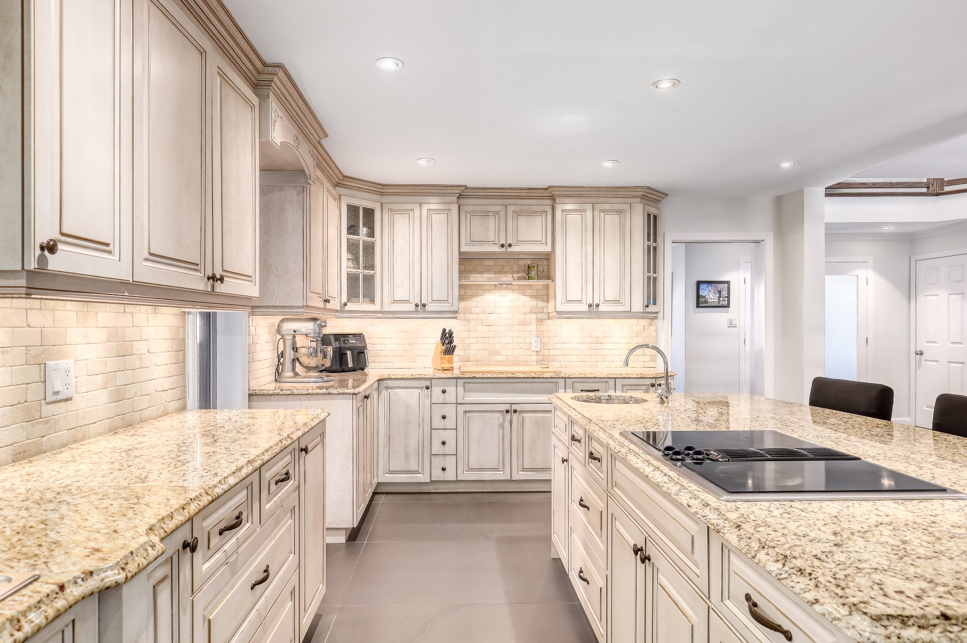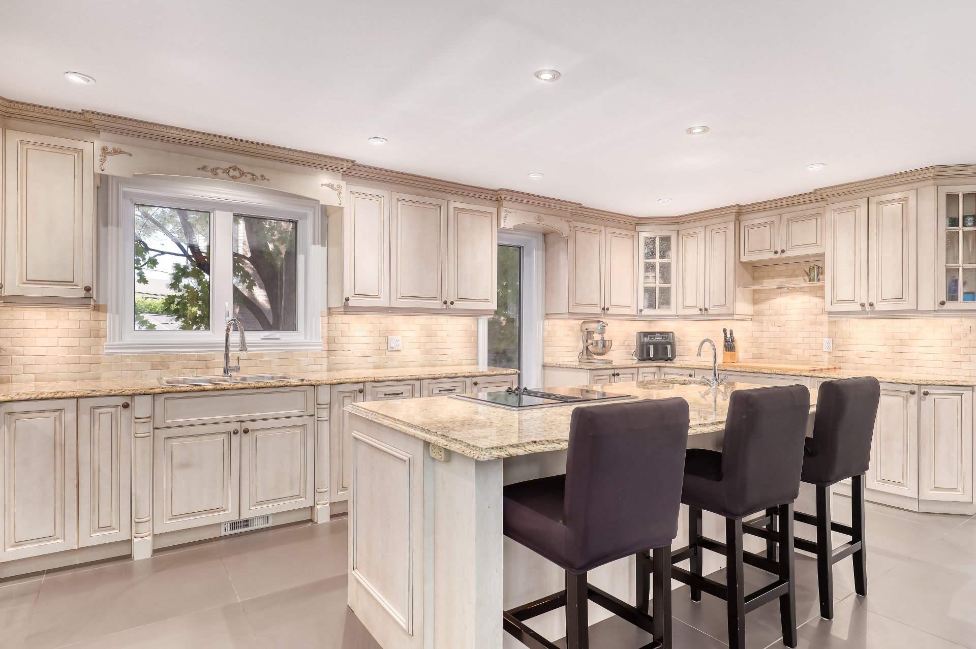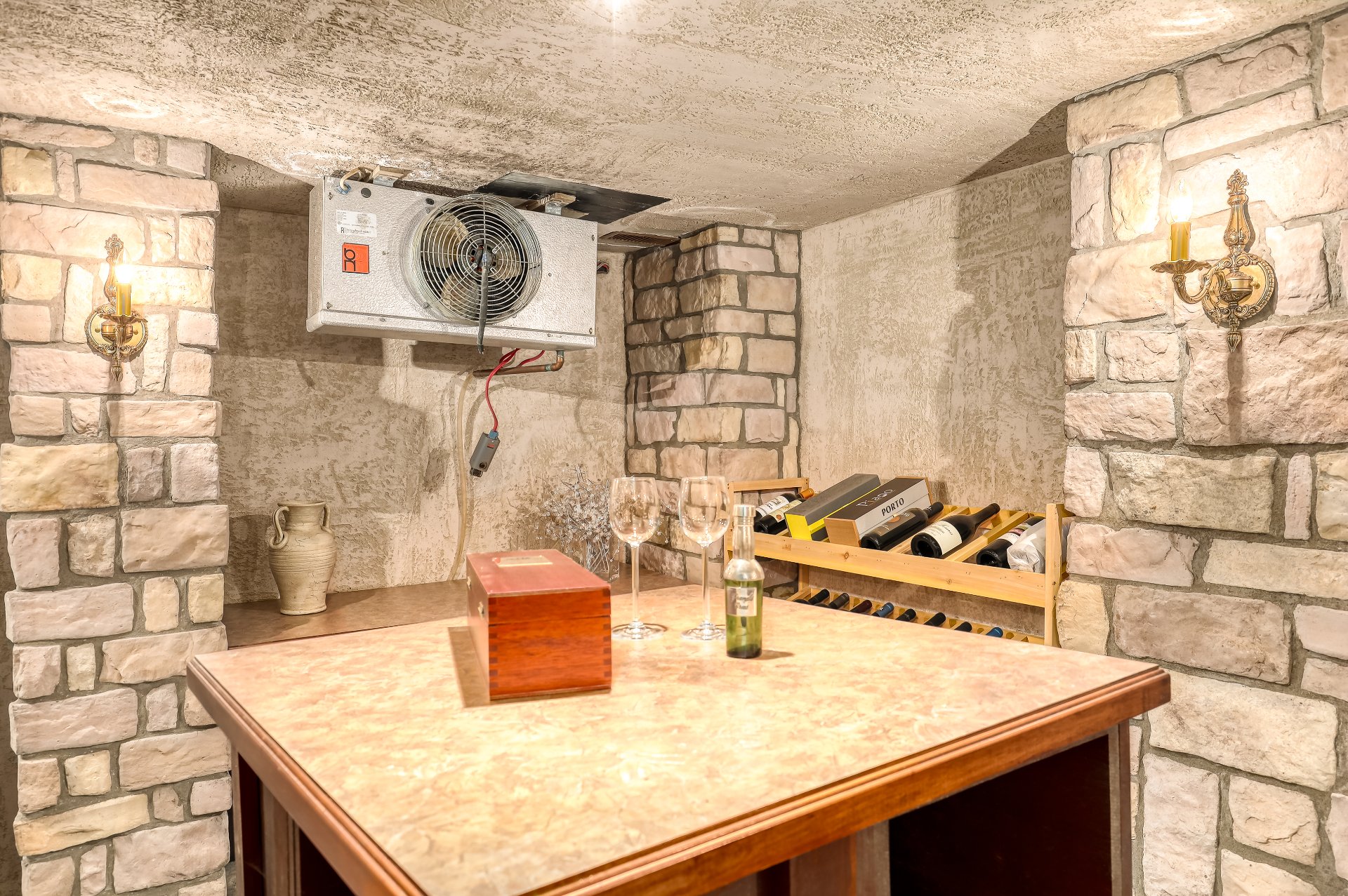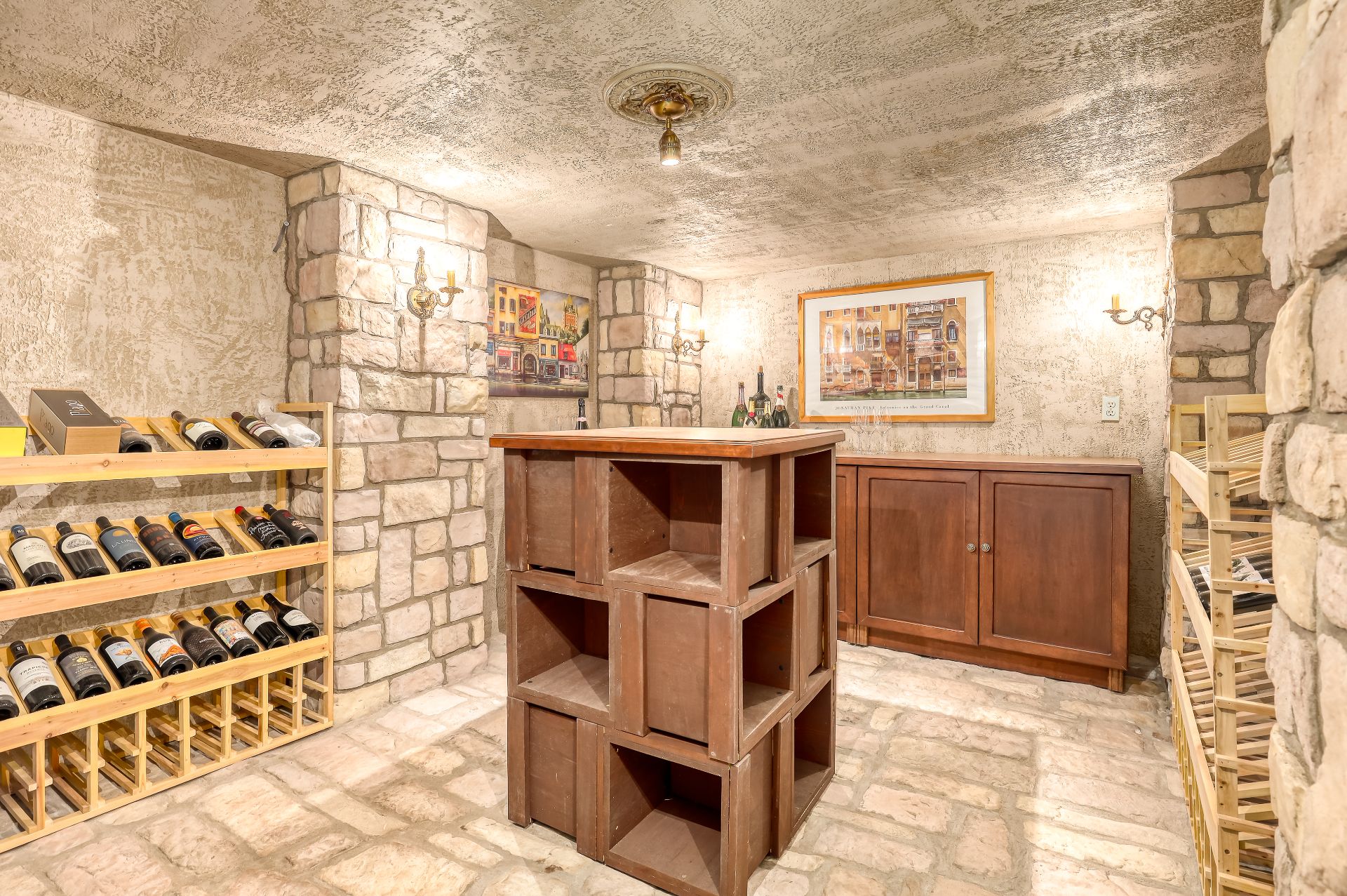 Écran et projecteur JVC du cinéma maison, Mobilier de la cave à vin, congélateur blanc de marque Kenmore su sous-sol, fauteuils blancs du sous-sol pour le cinéma maison, établi, table et 8 chaises de la salle à manger, 3 tabourets de la cuisine, lave-vaisselle de marque Bloomberg, four encastré de marque Frigidaire, plaque chauffante de marque Jenn-Air , pôles et rideaux, luminaires.