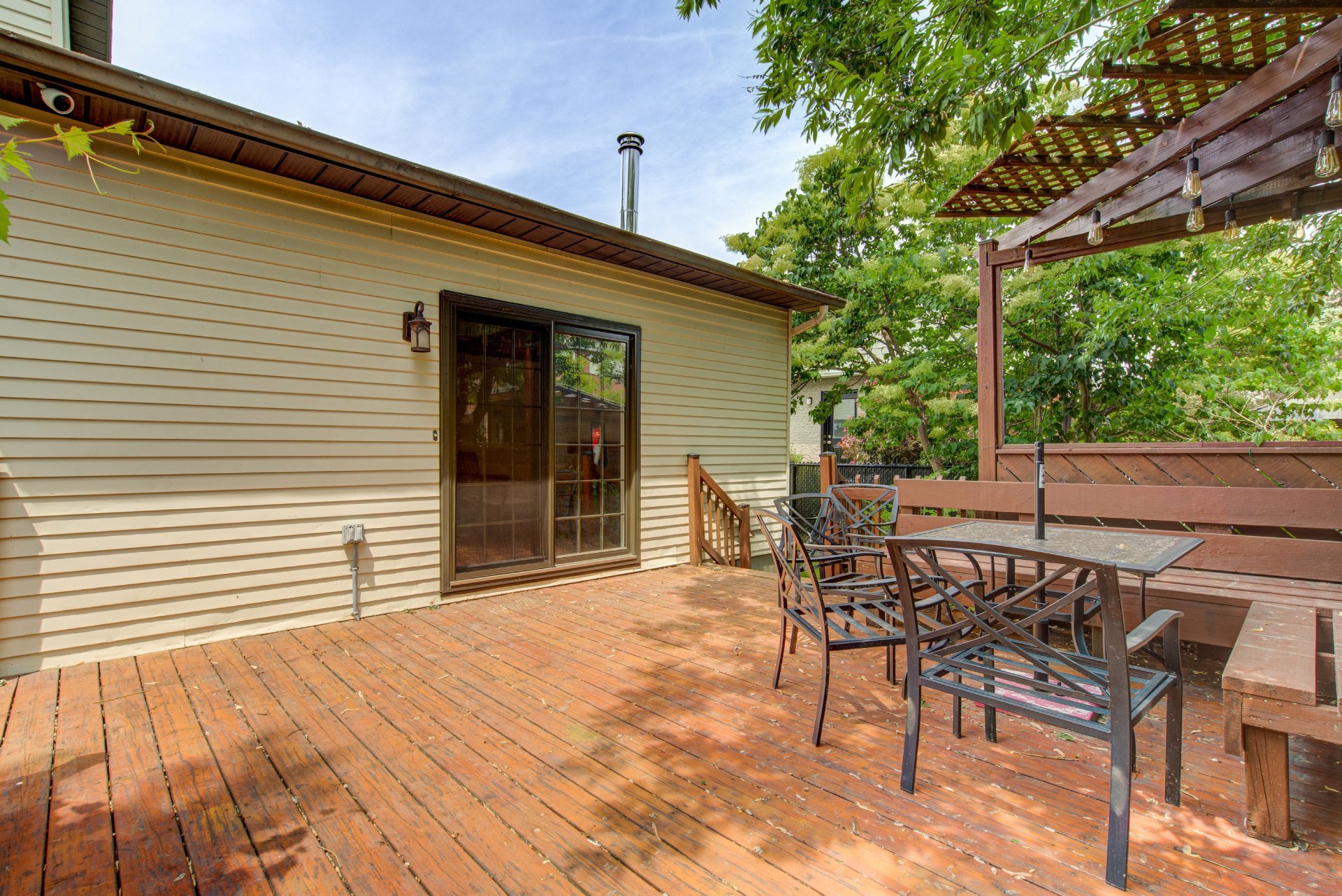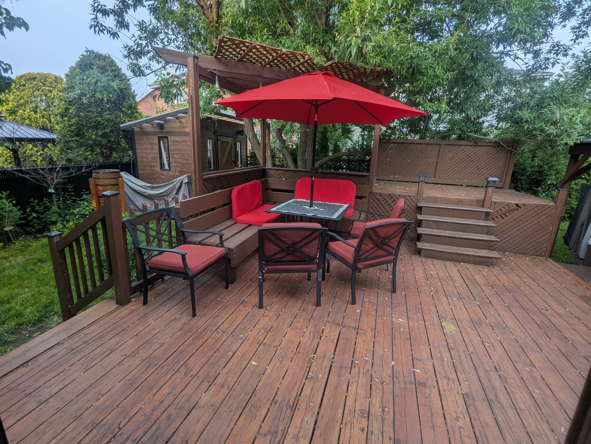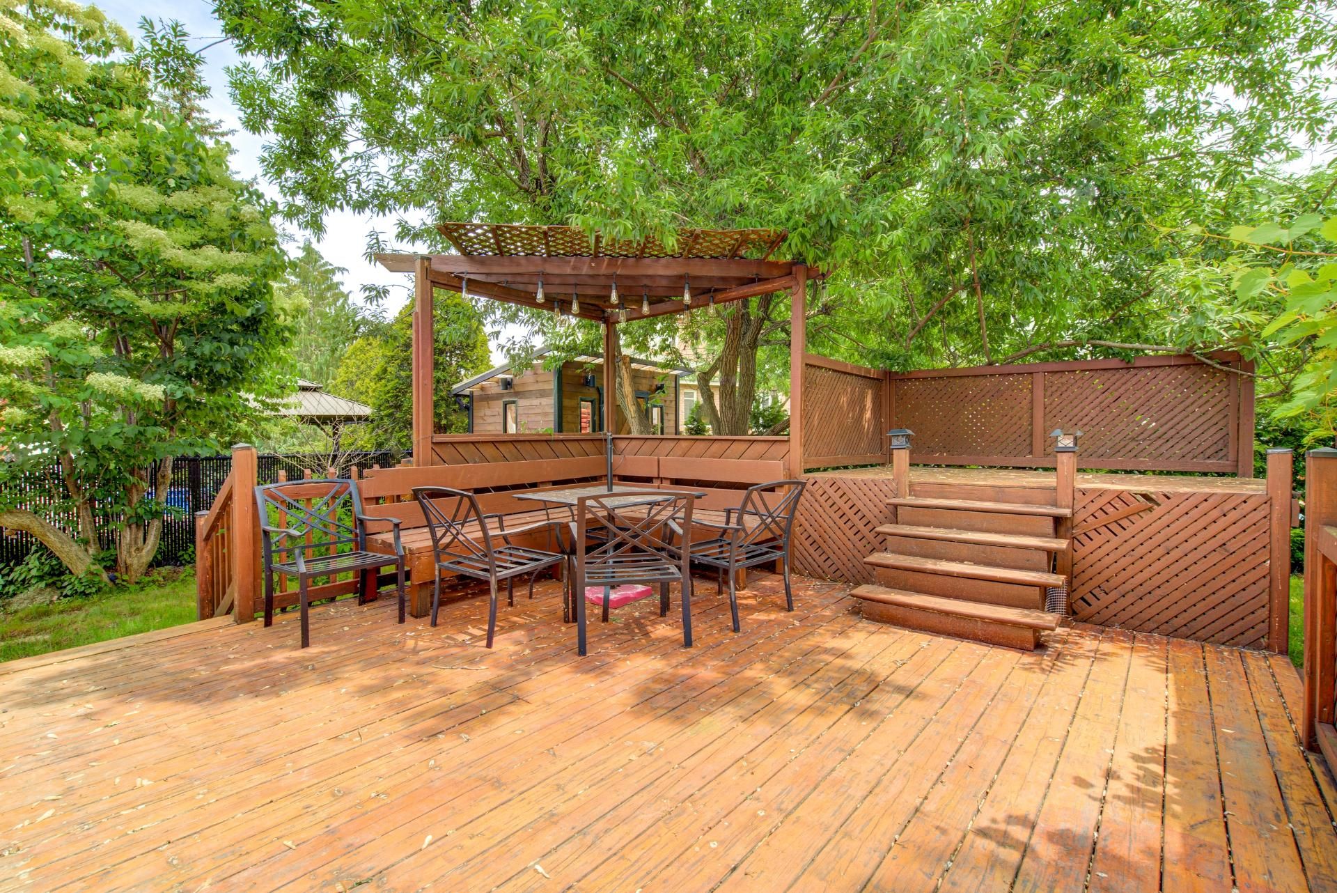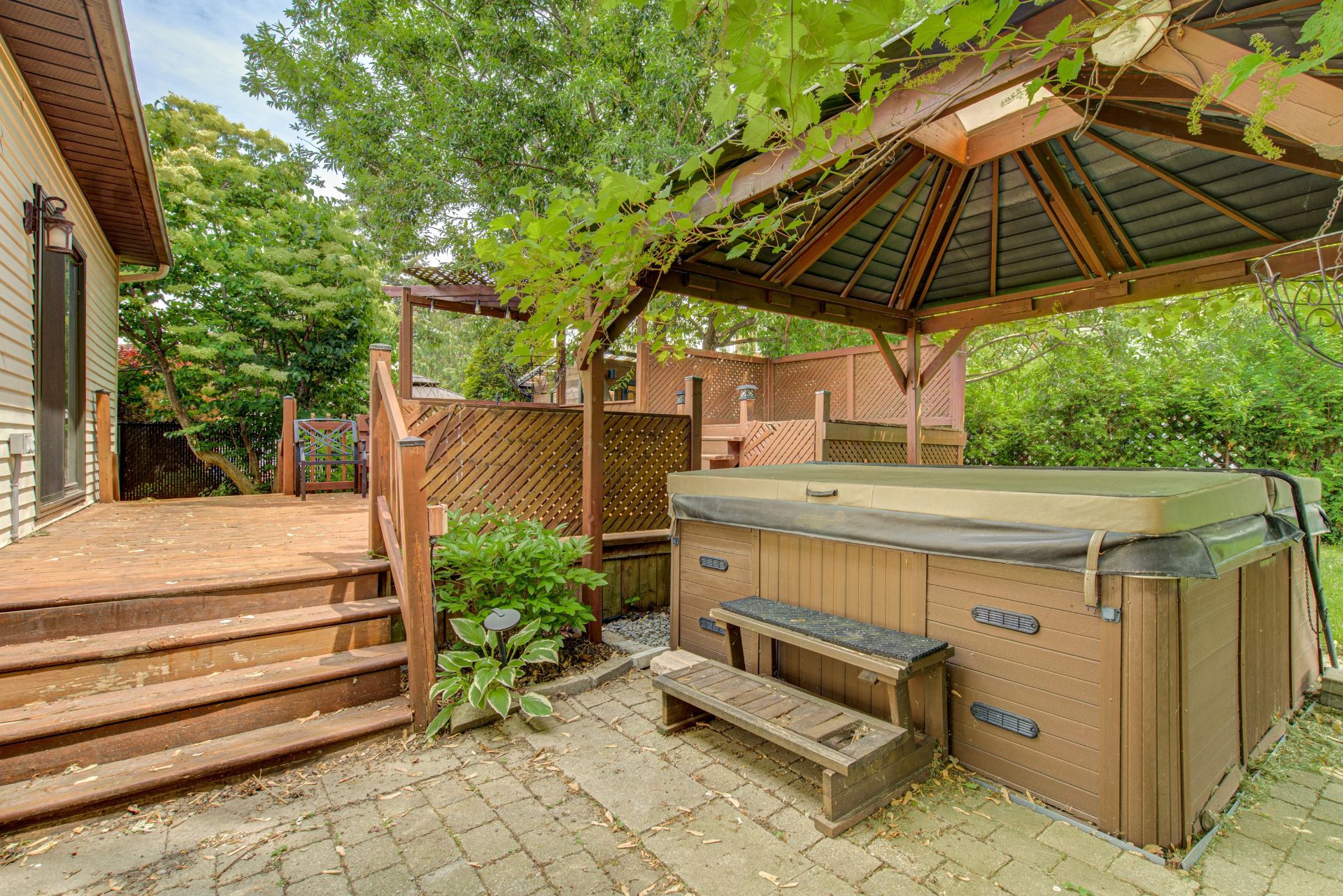 détente, spacieux balcon de bois, spa couvert d'un gazebo,