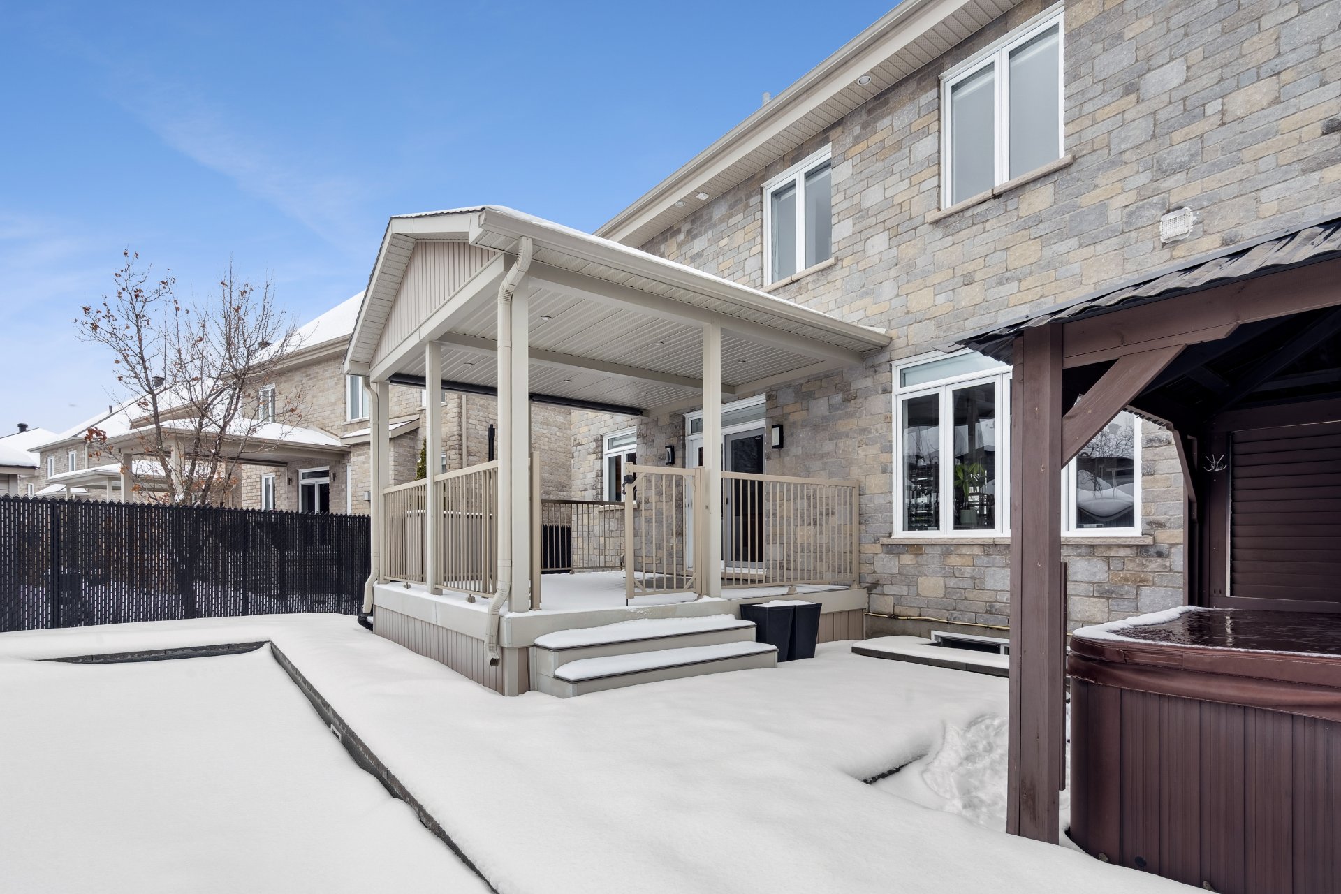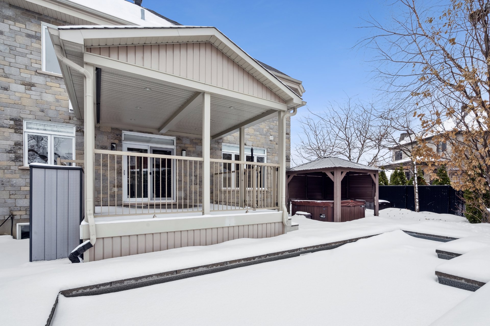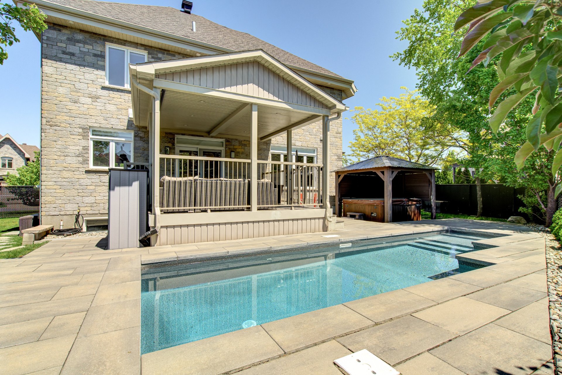 Luminaires, pôles, rideaux, toiles/stores des fenêtres, ouvre porte de garage électrique et manette, remise, aspirateur central et acc., piscine et acc., thp piscine, système d'alarme, 3 supports à télévision, miroirs SDB et SDE, tablettes fixes, spa, gazebo, PAX, rangement dans les garde-robes, électroménagers de cuisine (réfrigérateur, lave-vaisselle, plaque, 2 fours, refroidisseur pour cellier), hauts-parleurs encastrés non branchés