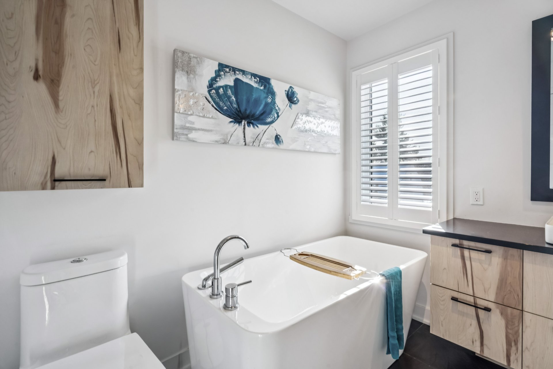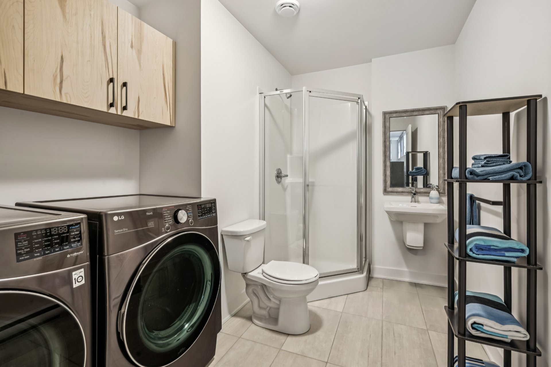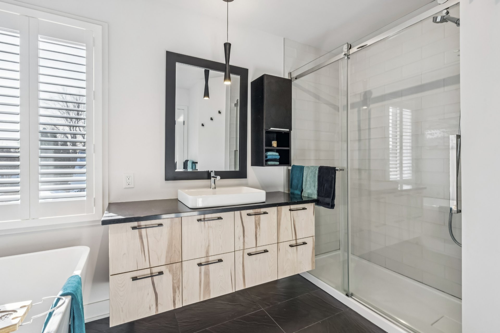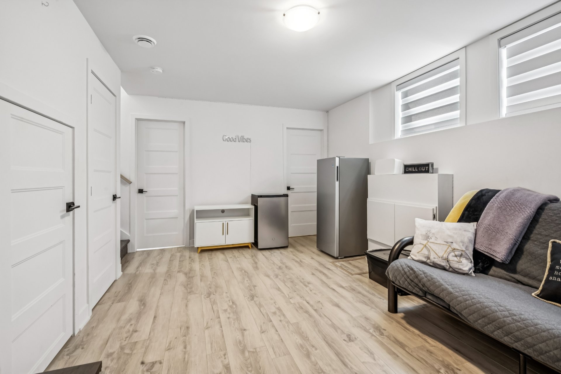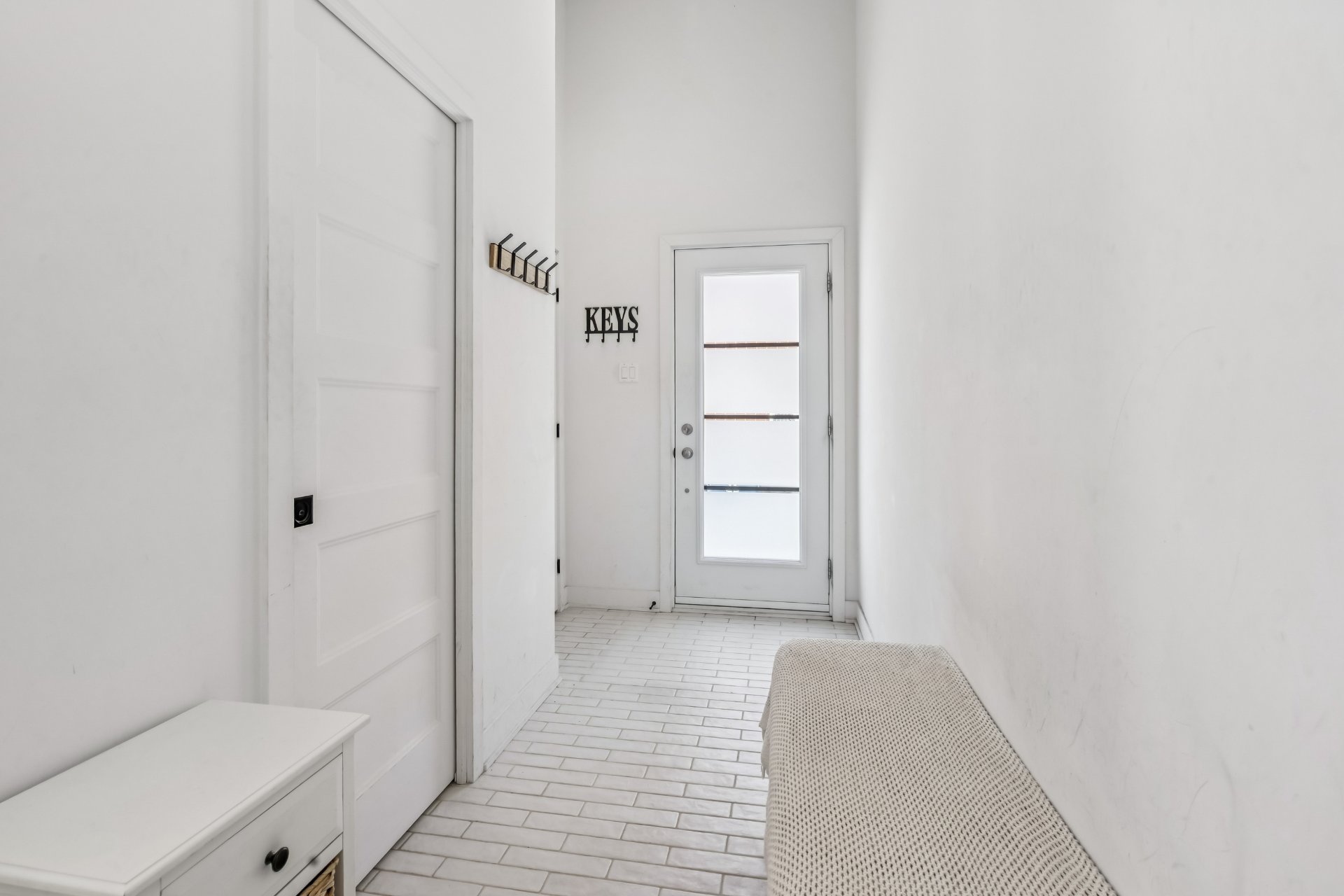 Pôles et habillages des fenêtres, aspirateur central, crochets à manteaux et clés hall d'entrée et porte avant, miroirs des salles de bain.