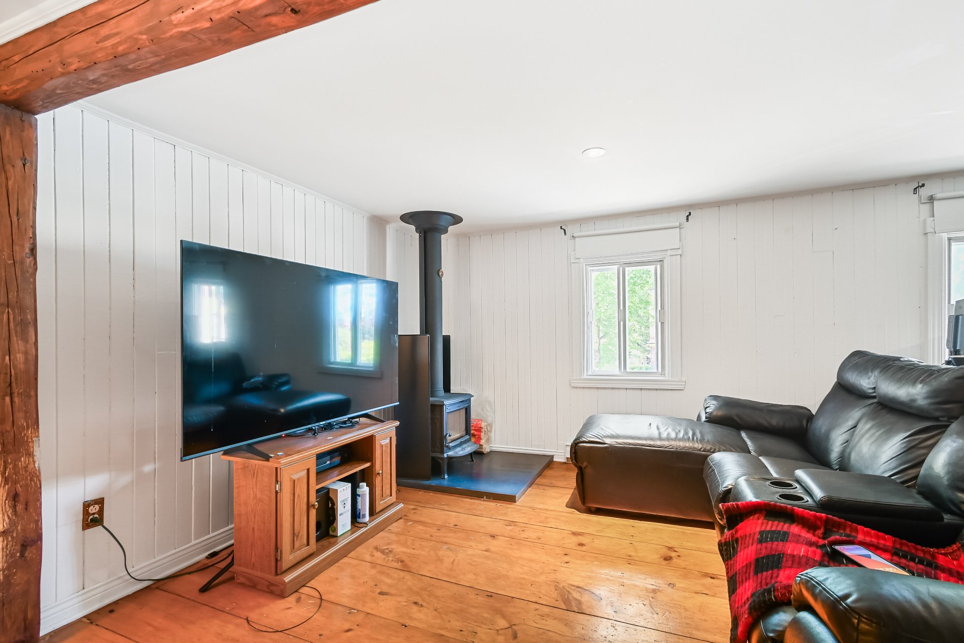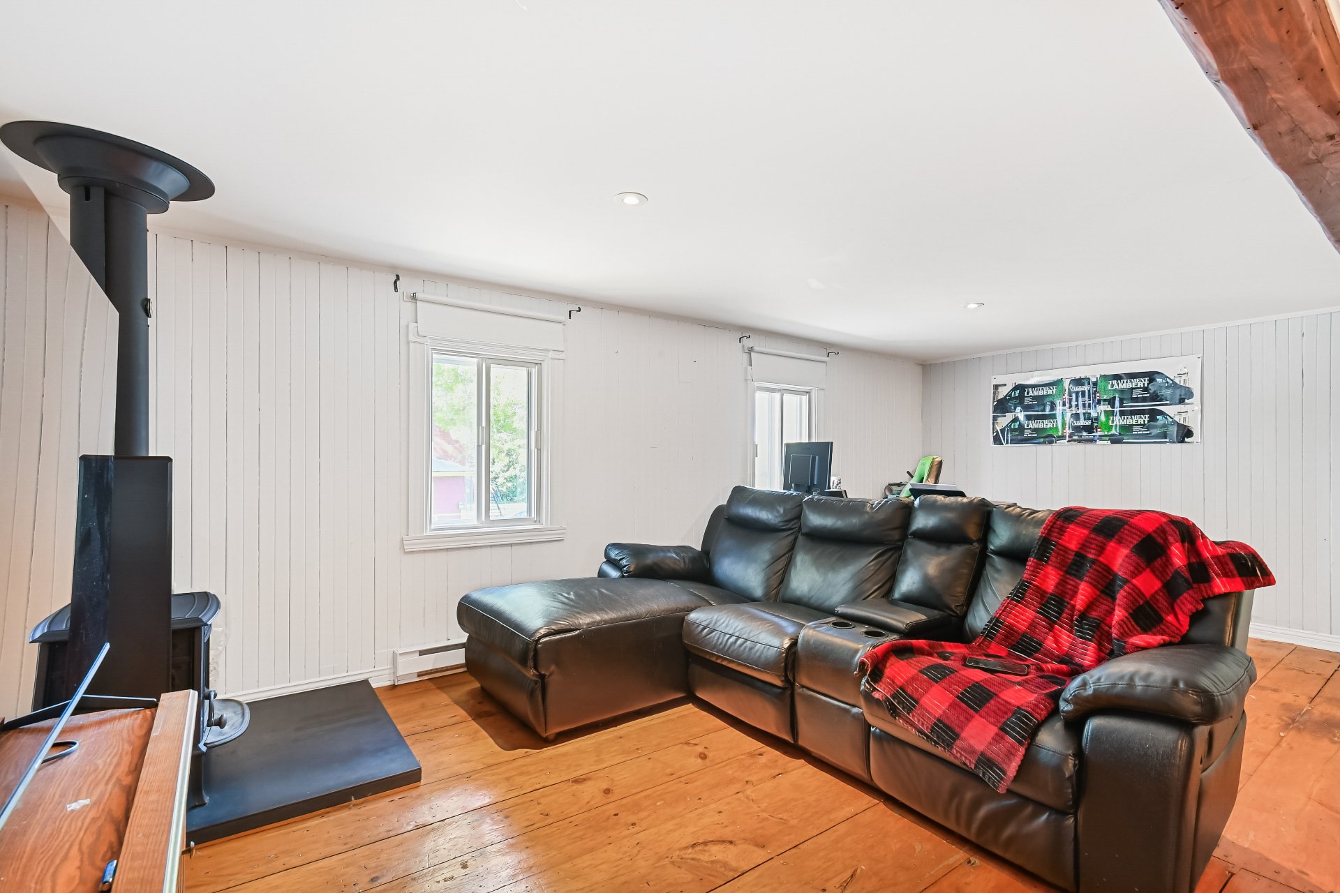 Luminaires, cabanon, poêle au bois, réservoir d'eau chaude.
