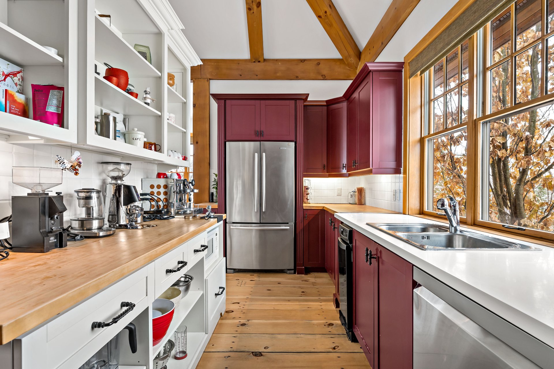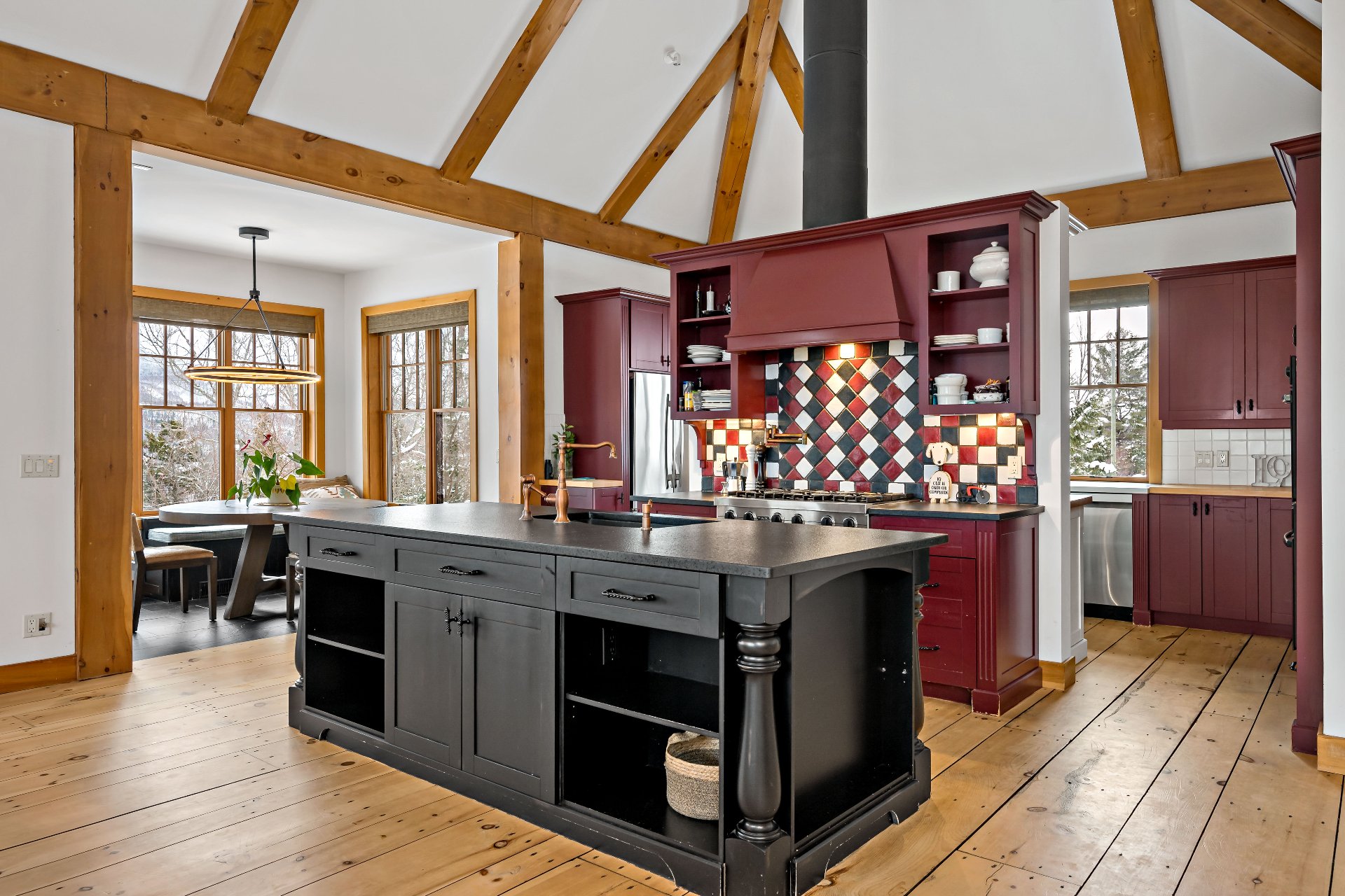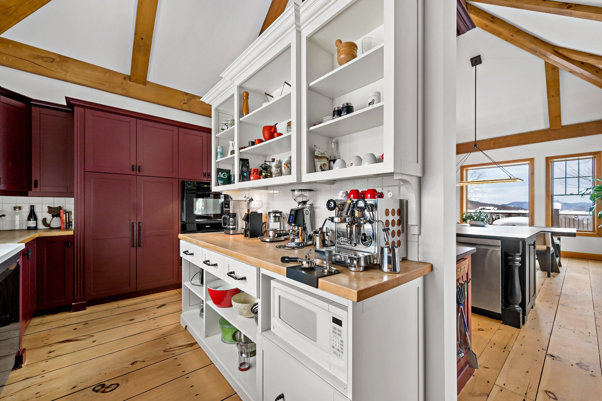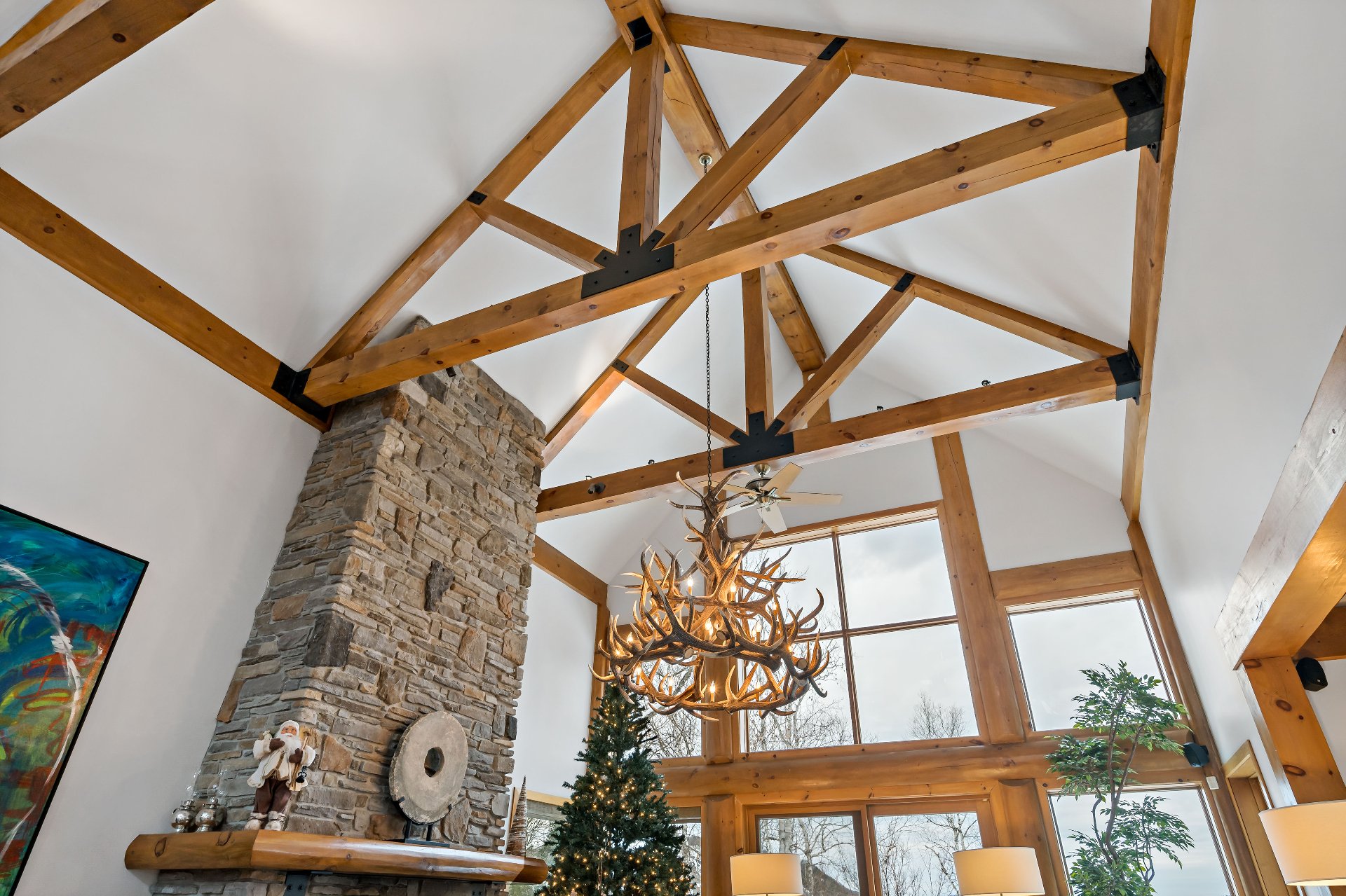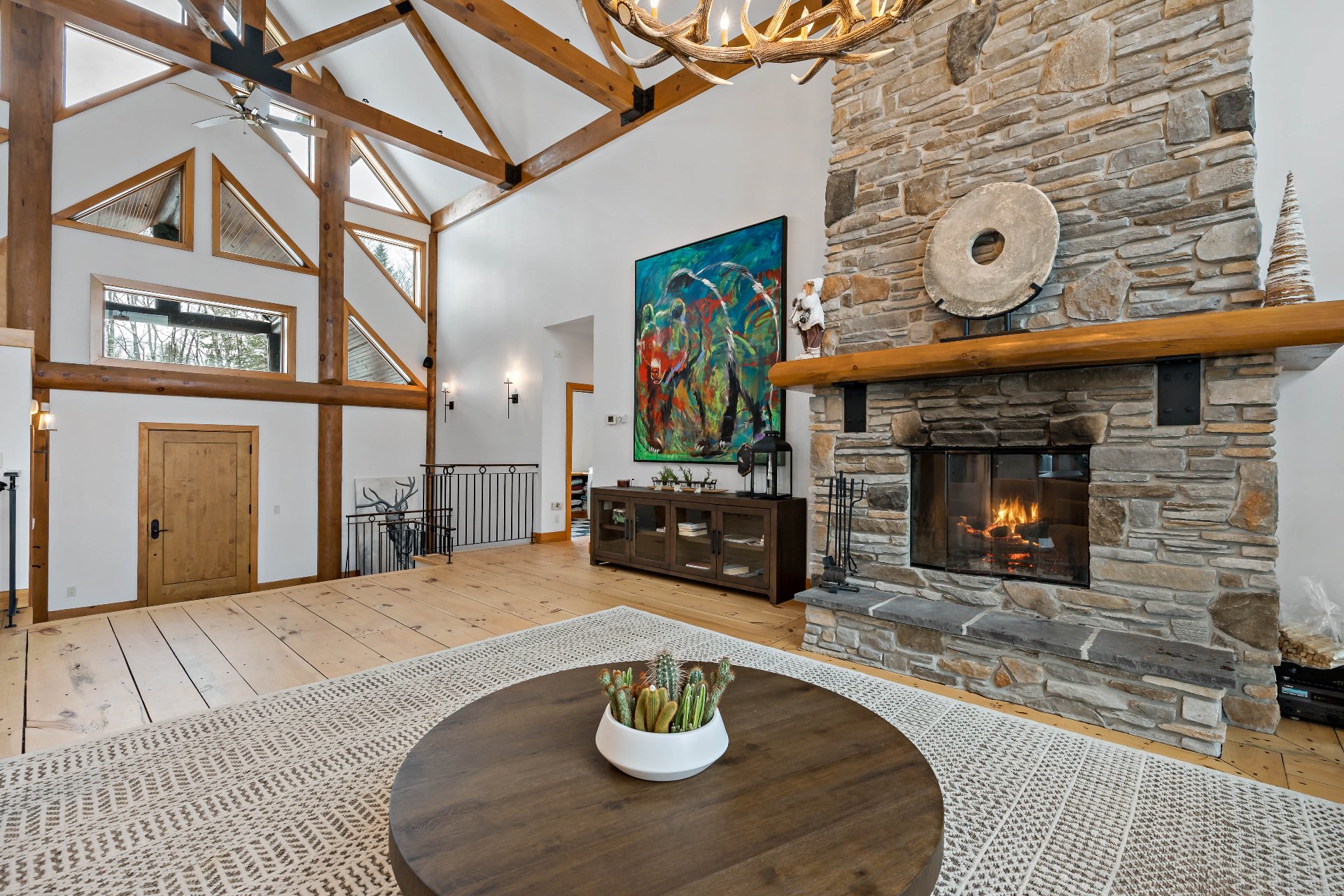 ses poutres apparentes au plafond cathédrale et nombreux