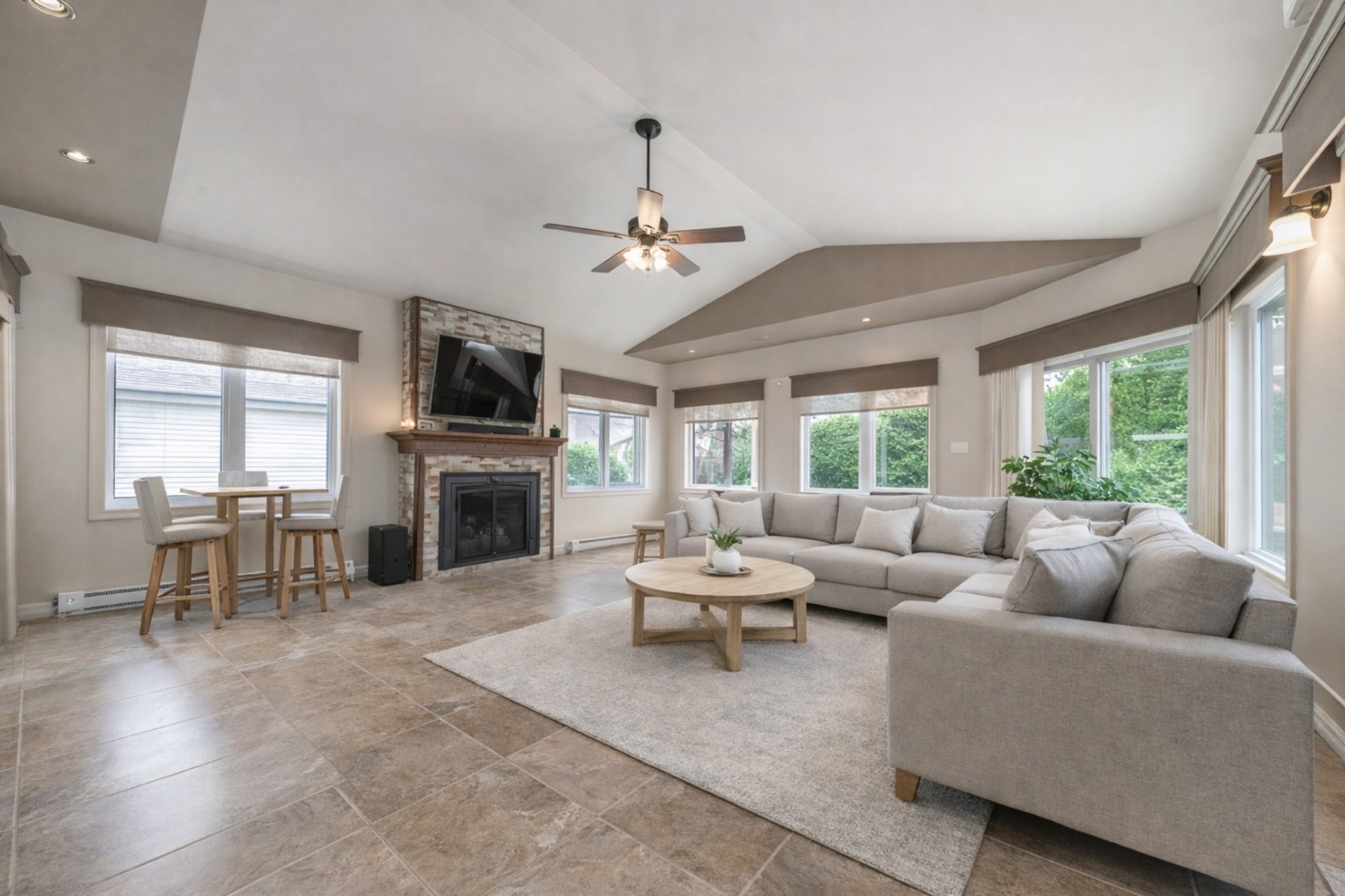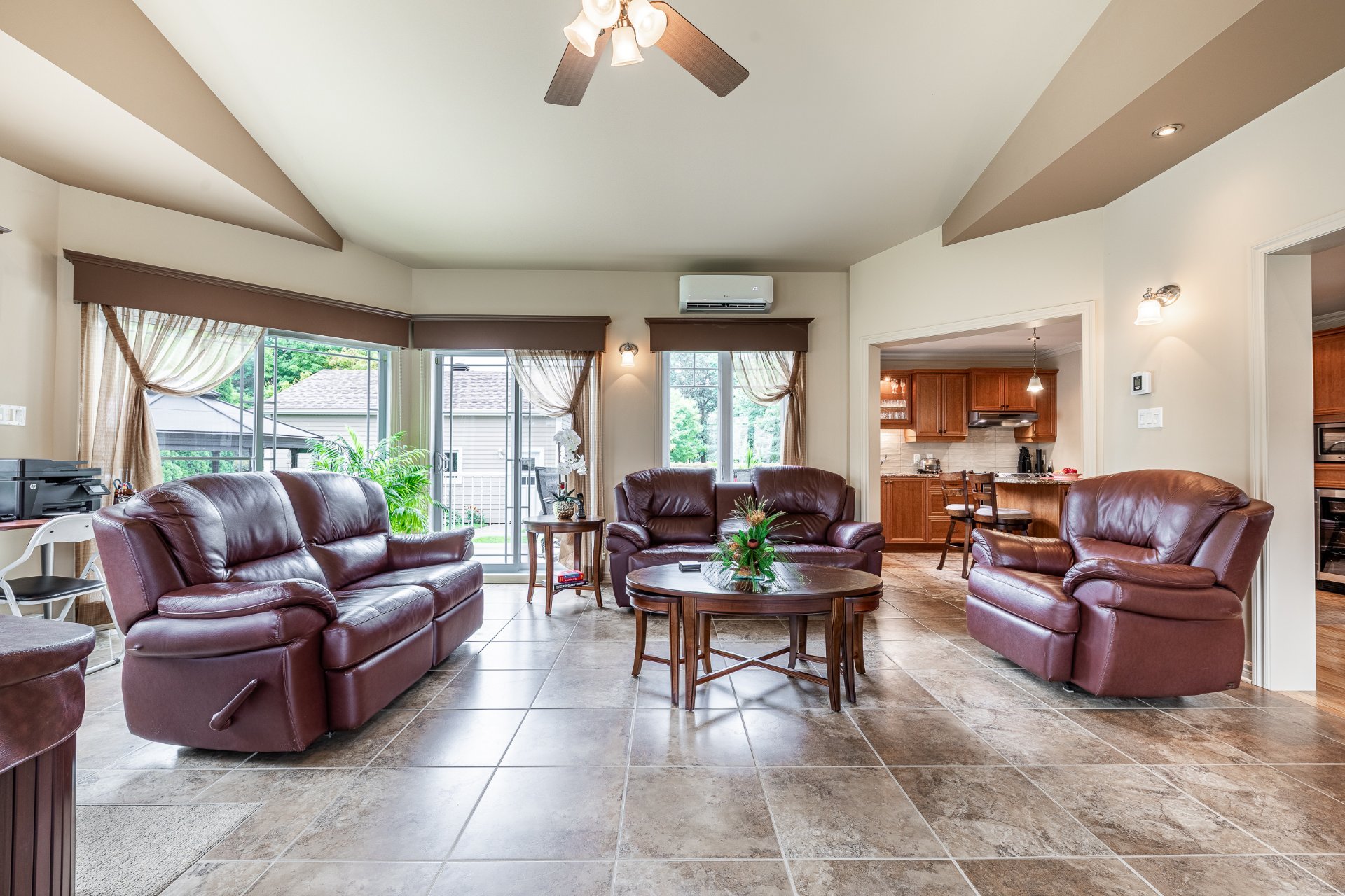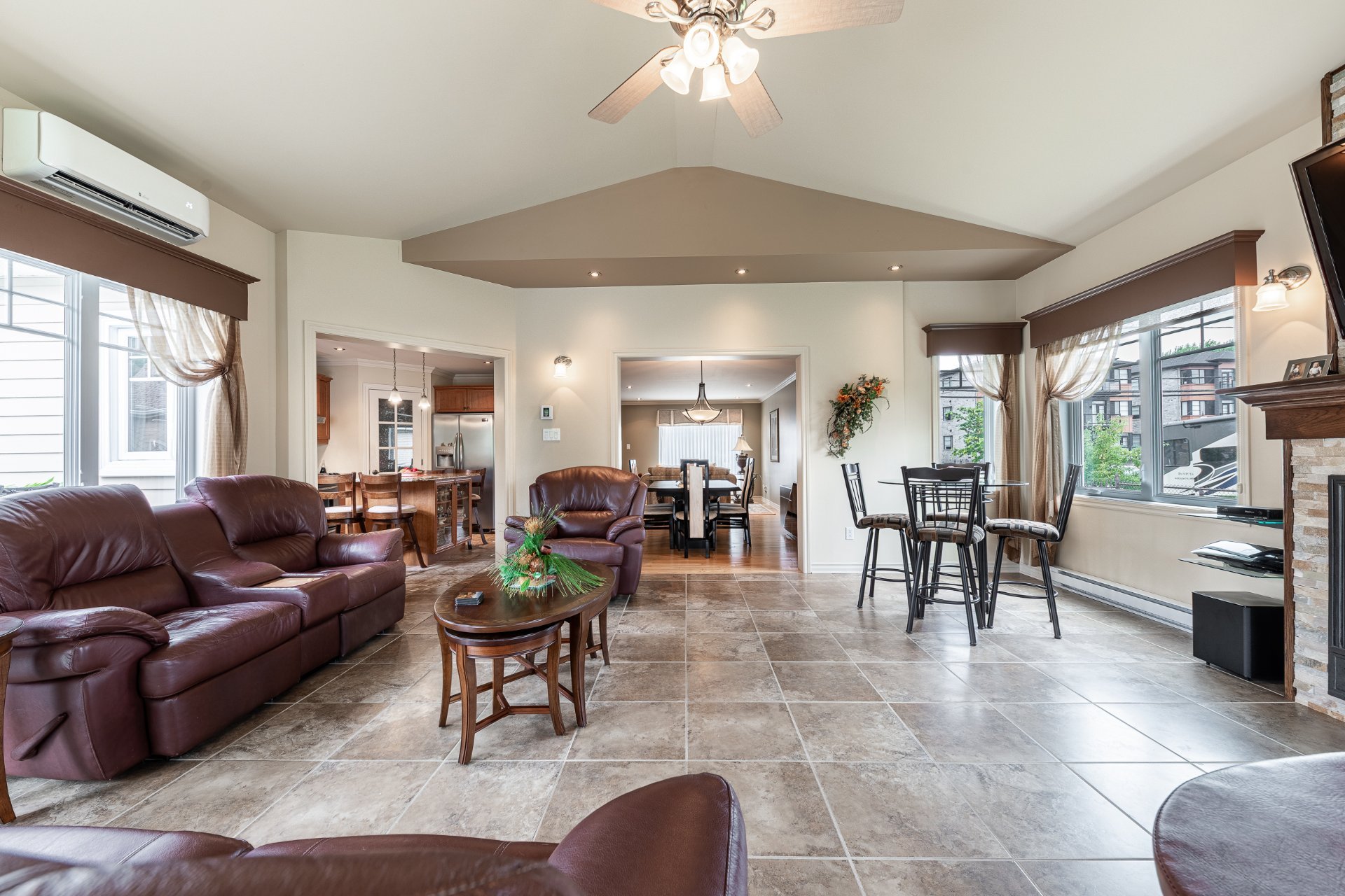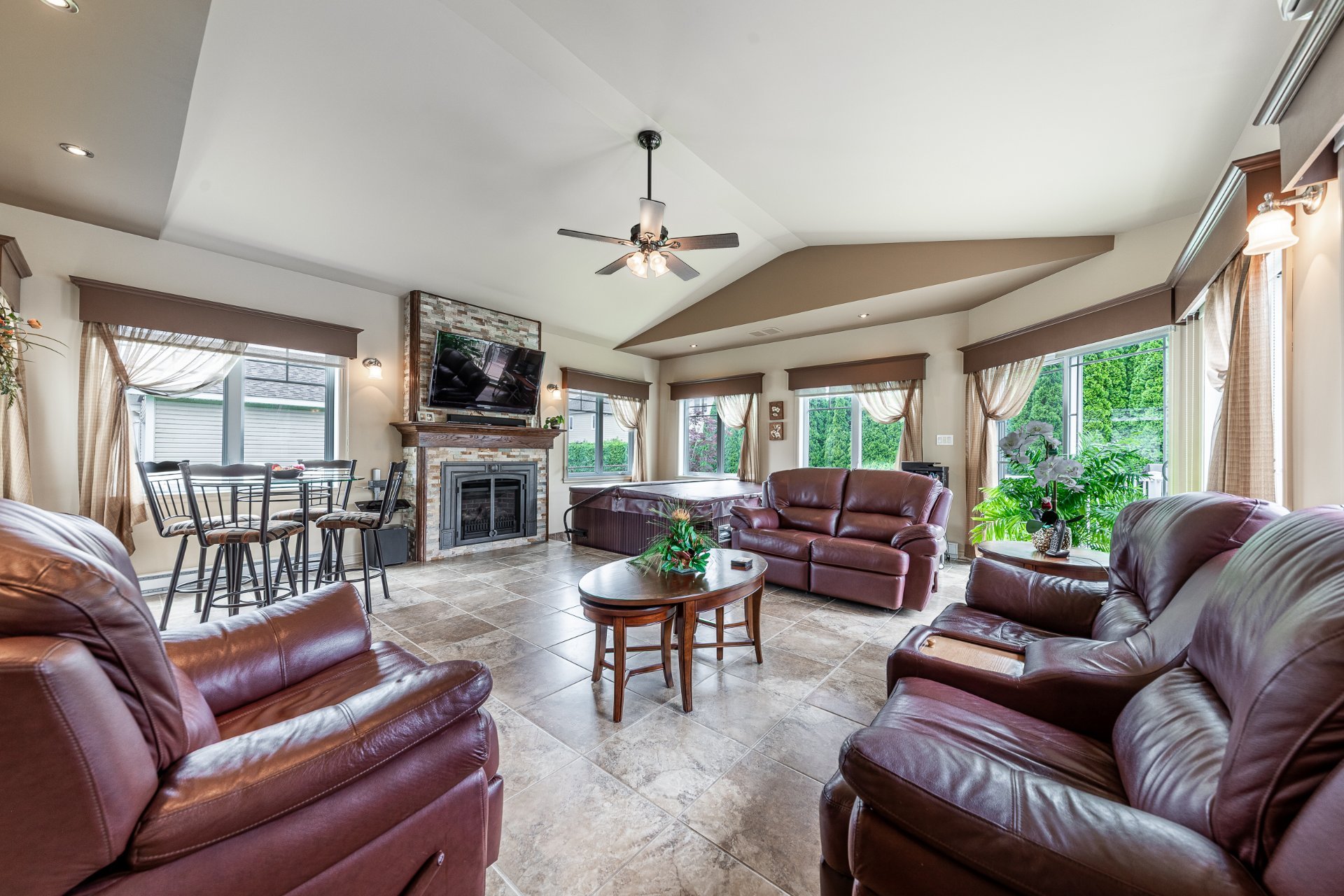 Luminaires, stores, pôles, rideaux, hottes, cellier, gazebo, balançoire, foyer au gaz propane, échange d'air, système d'alarme, balayeuse centrale et acc., spa, lave-vaisselle, 2 thermopompes murales (rdc 2025, 2e 2023)