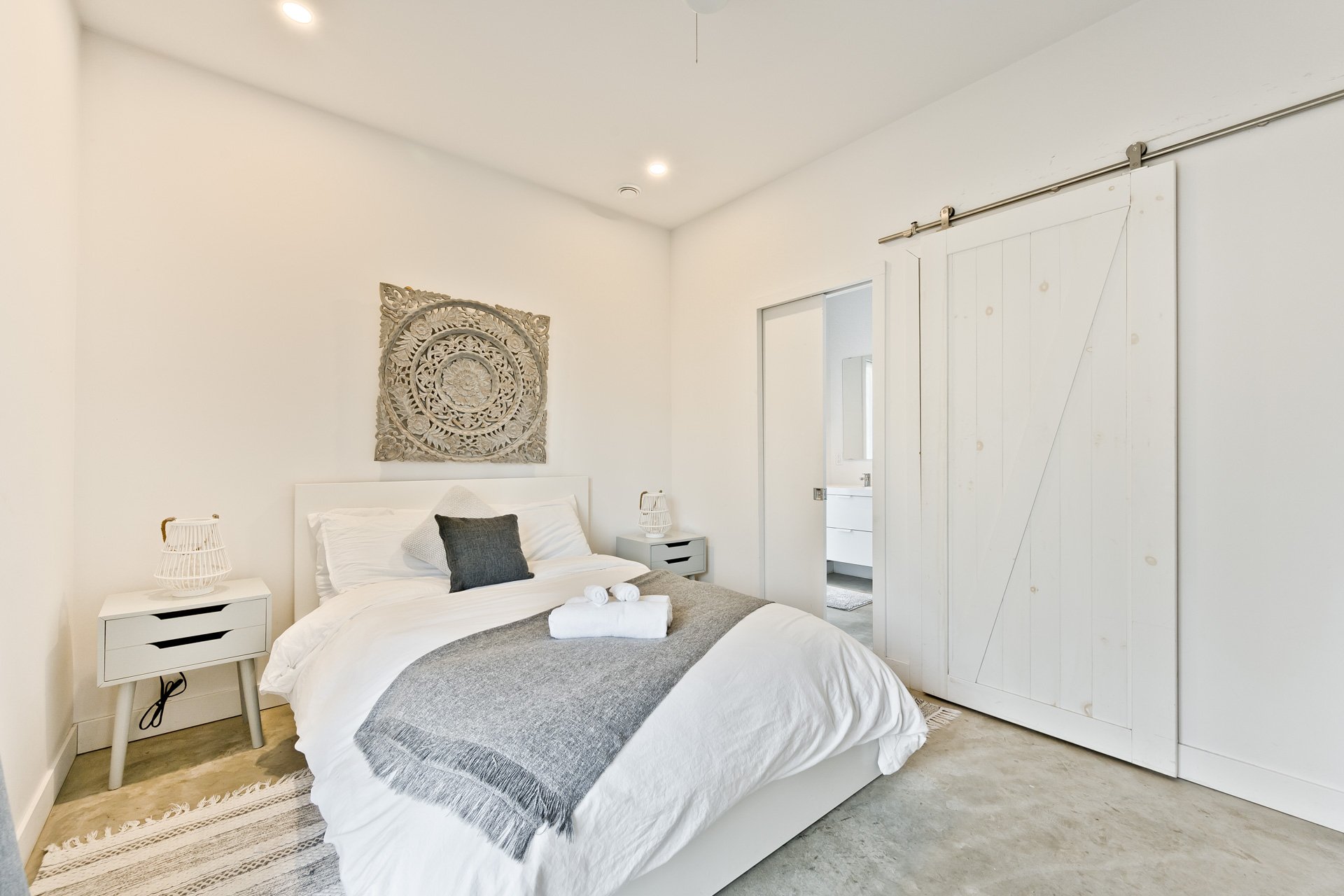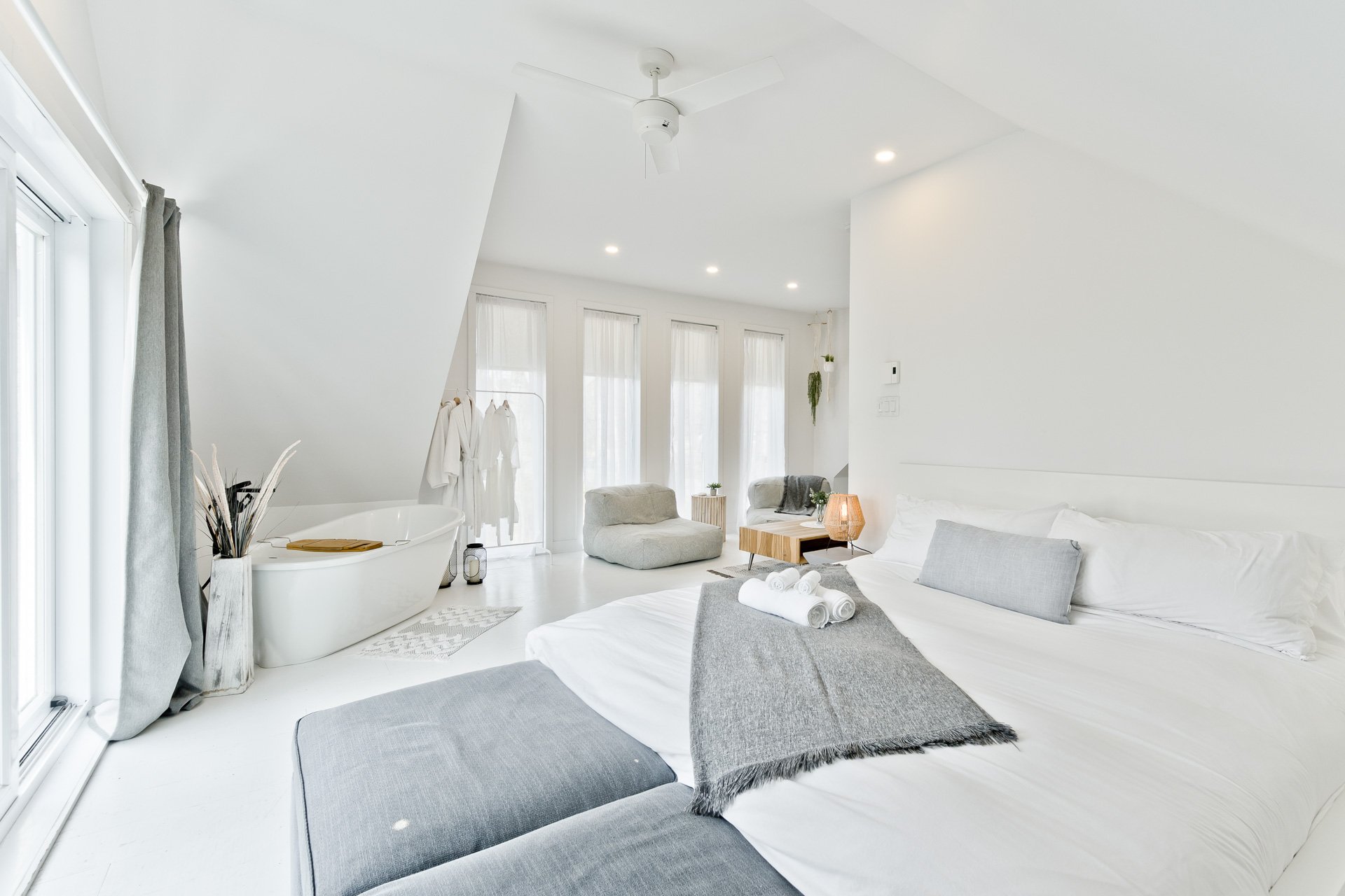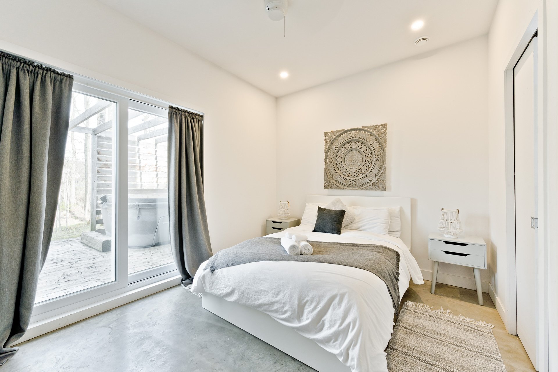 Une chambre au rez-de-chaussée avec accès direct au spa et