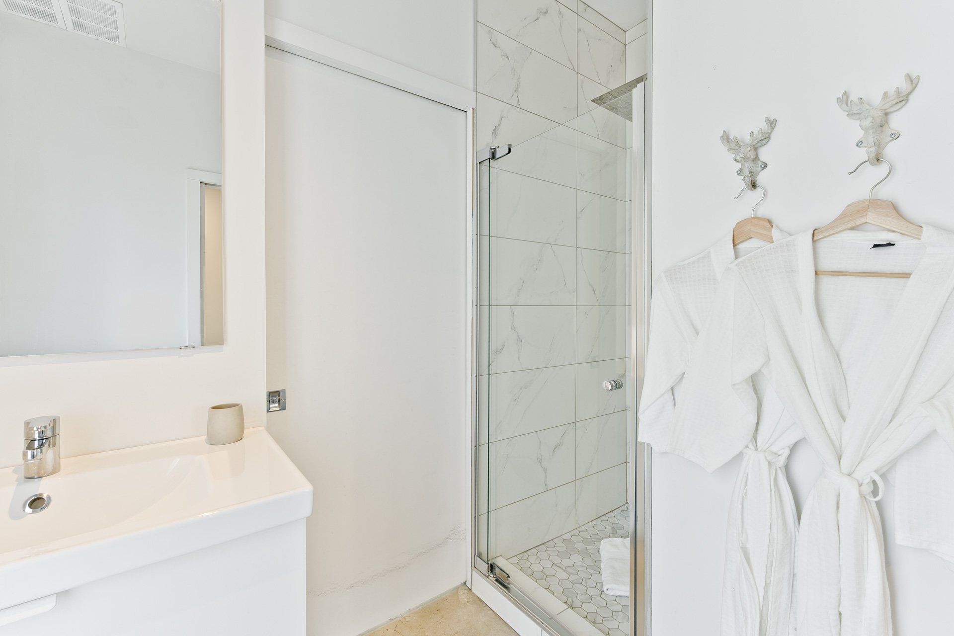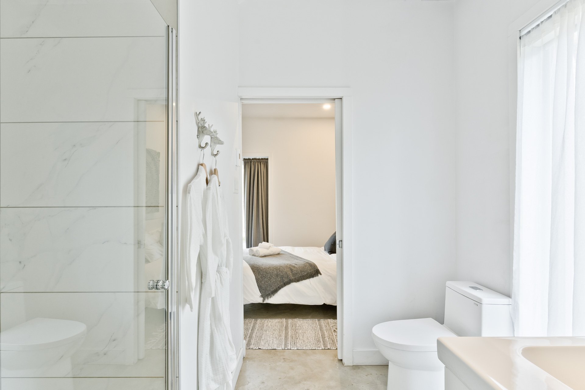 douche vitrée, ainsi qu'un accès au balcon privé.