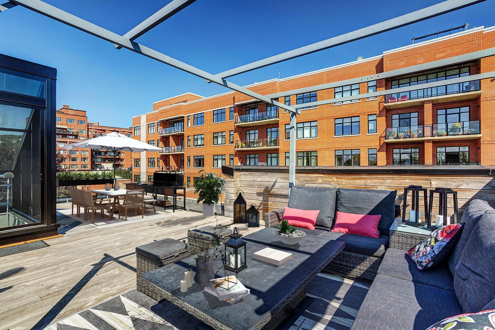 Tous les électroménagers, laveuse et sécheuse, pergola sur le toit.