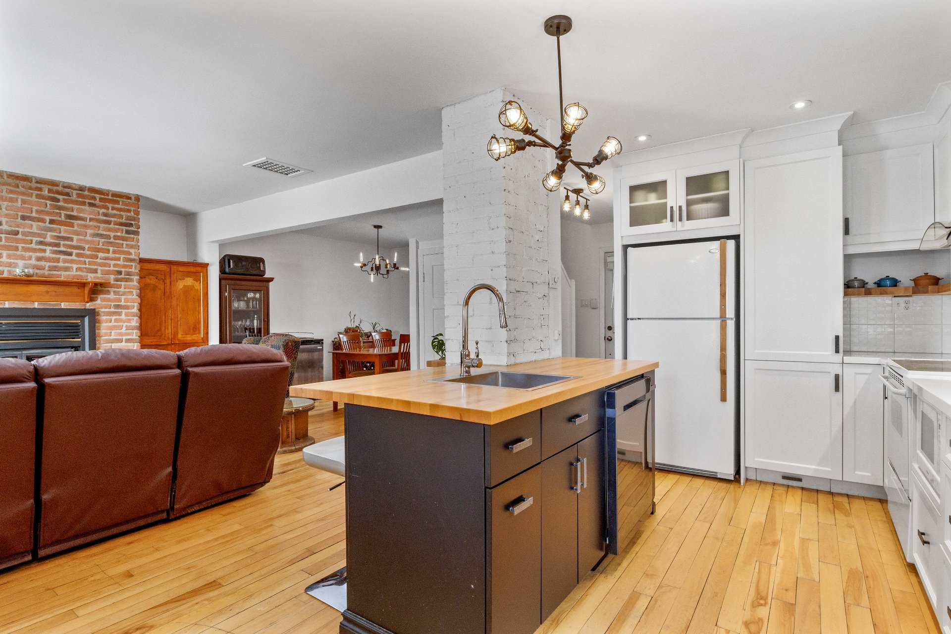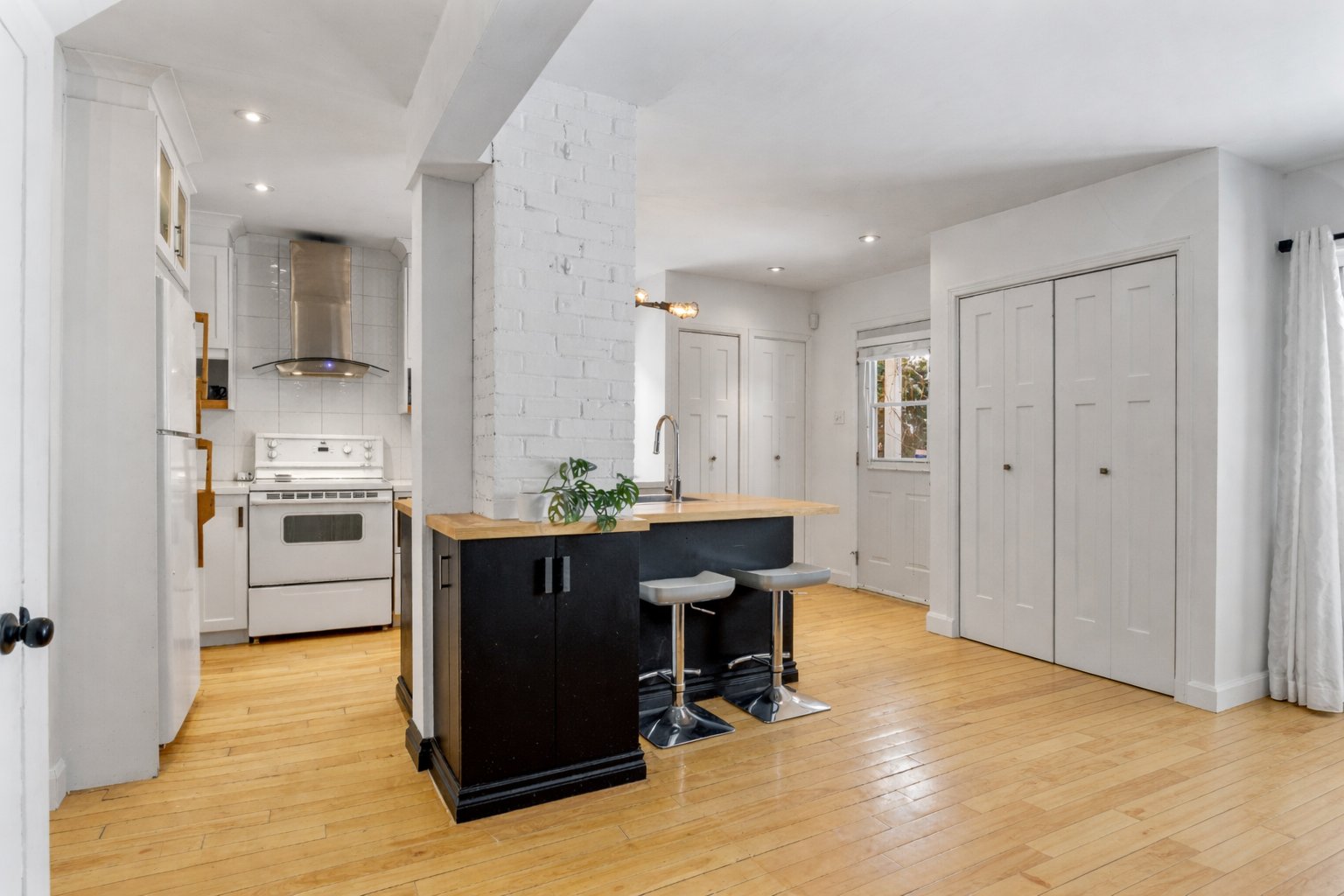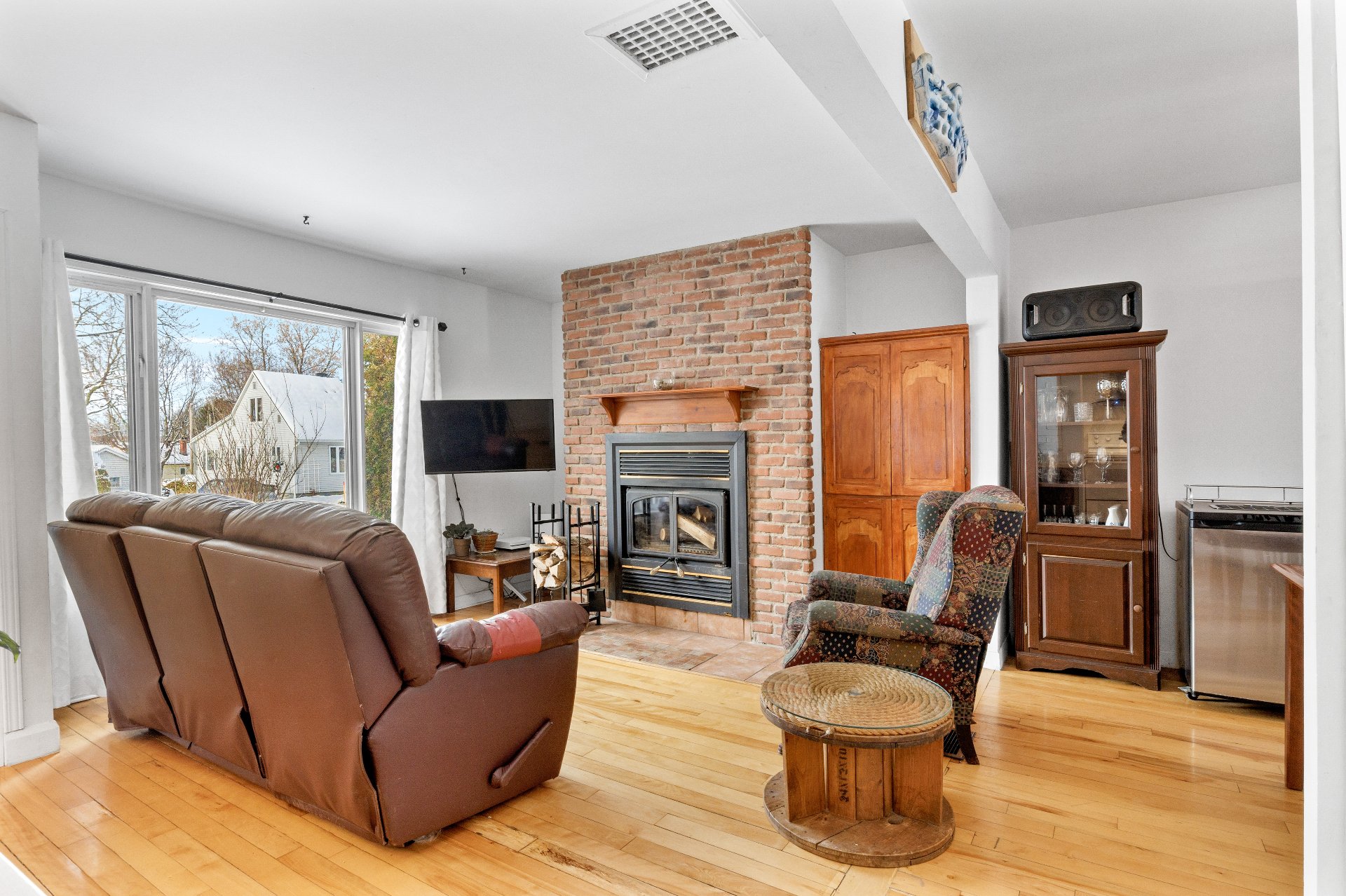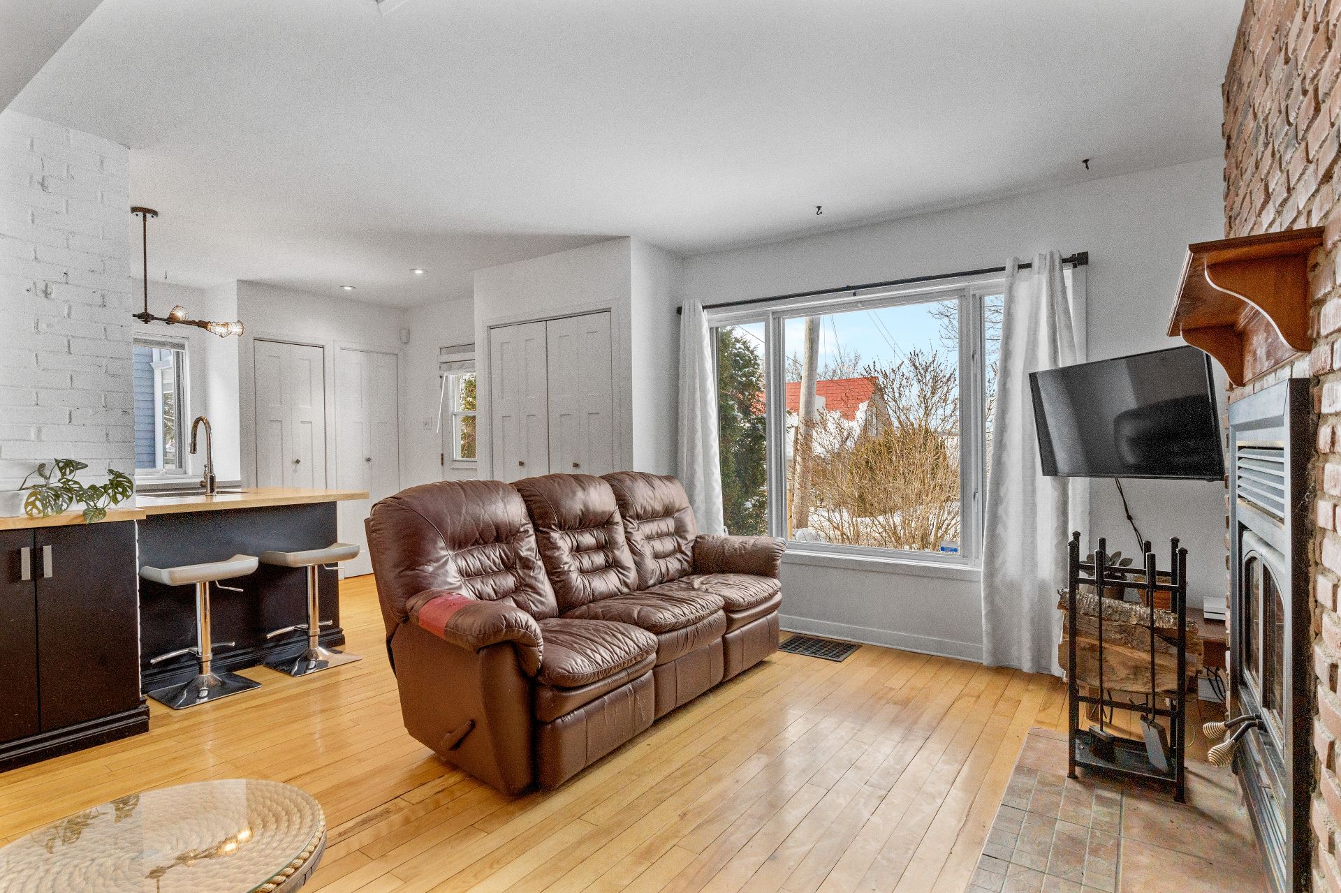 Luminaires, pôles et rideaux, stores, lave-vaisselle, cuisinière, réfrigérateur, support à télévision, deux chaises d'îlot, deux meubles/buffets dans la salle à manger, étagères du sous-sol, congélateur dans le garage.