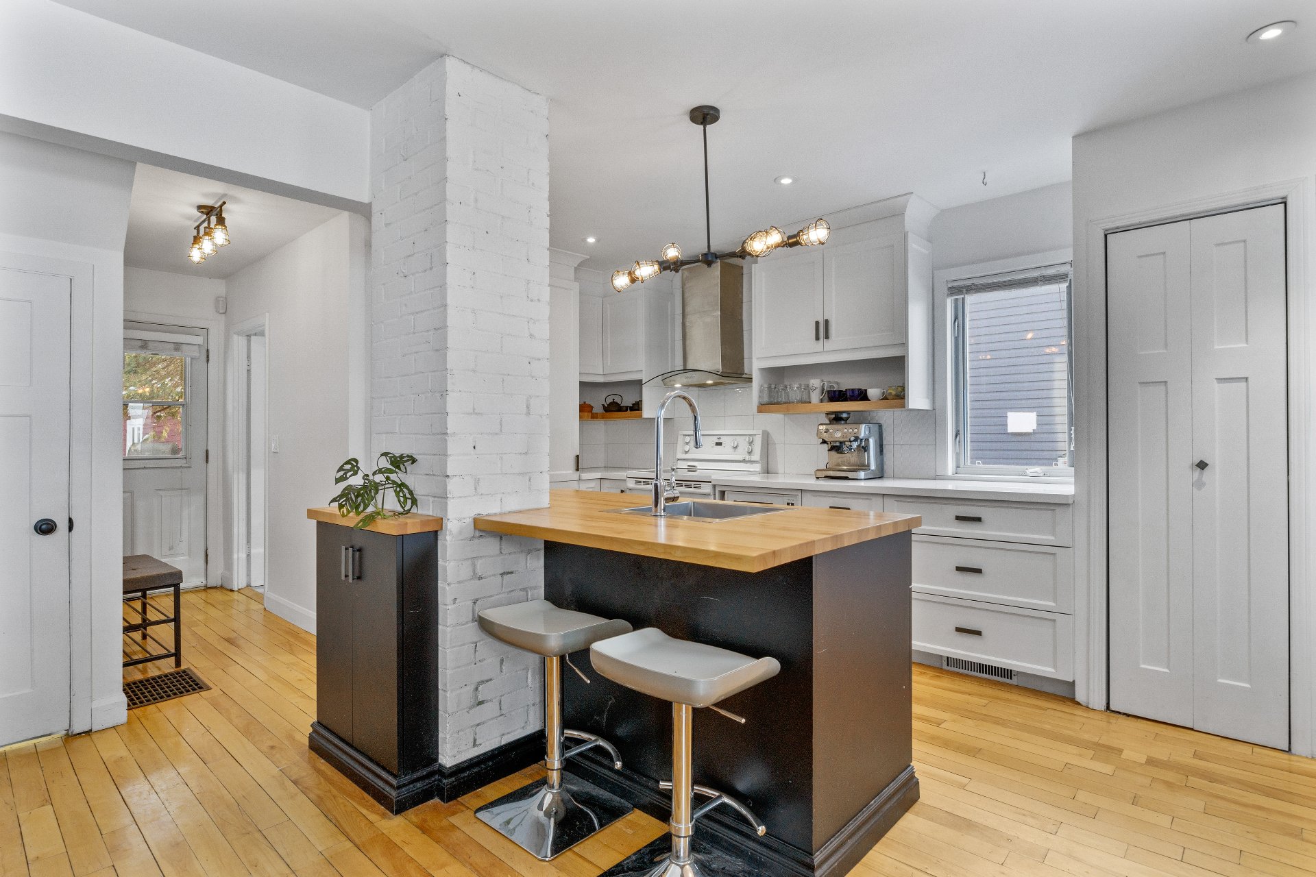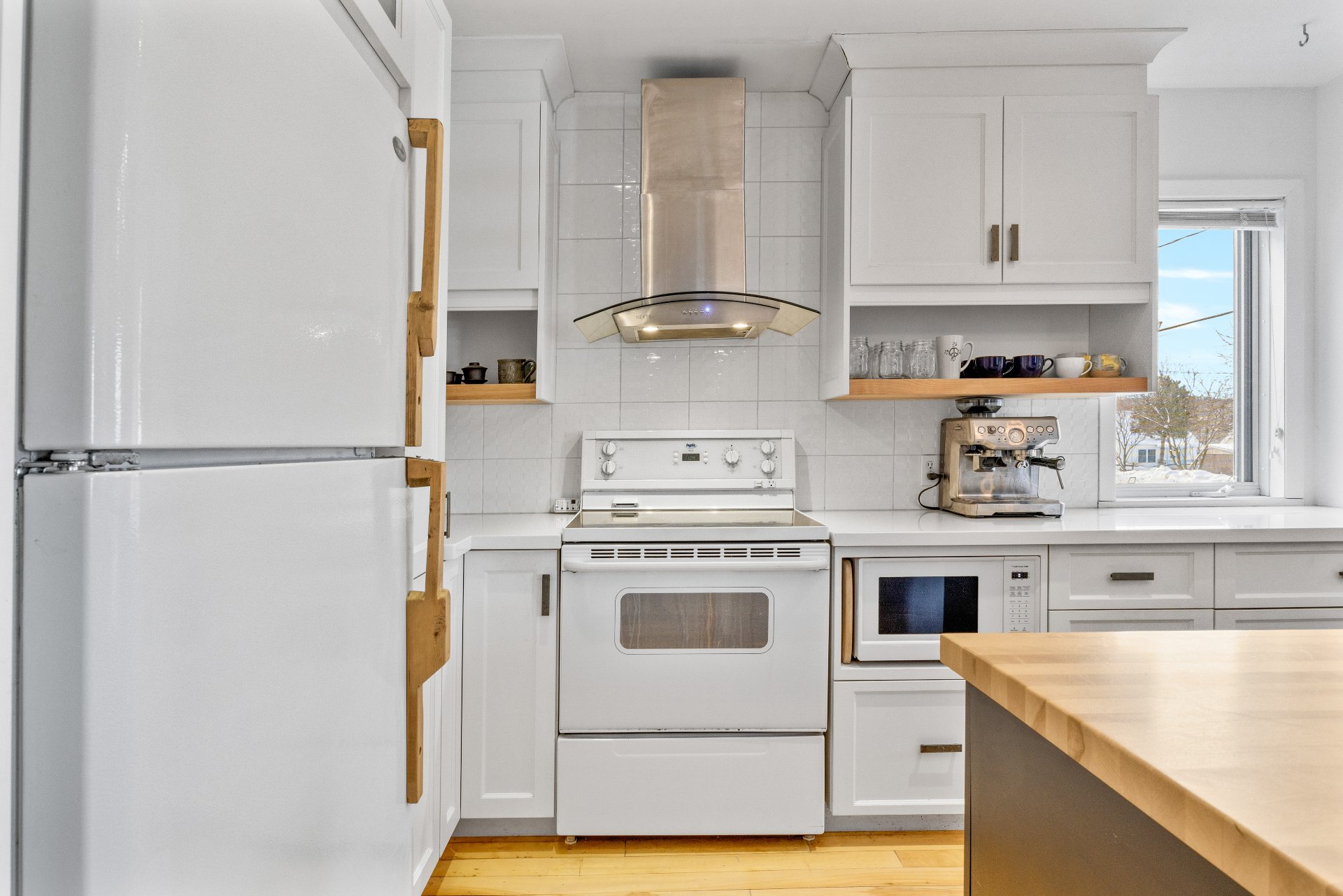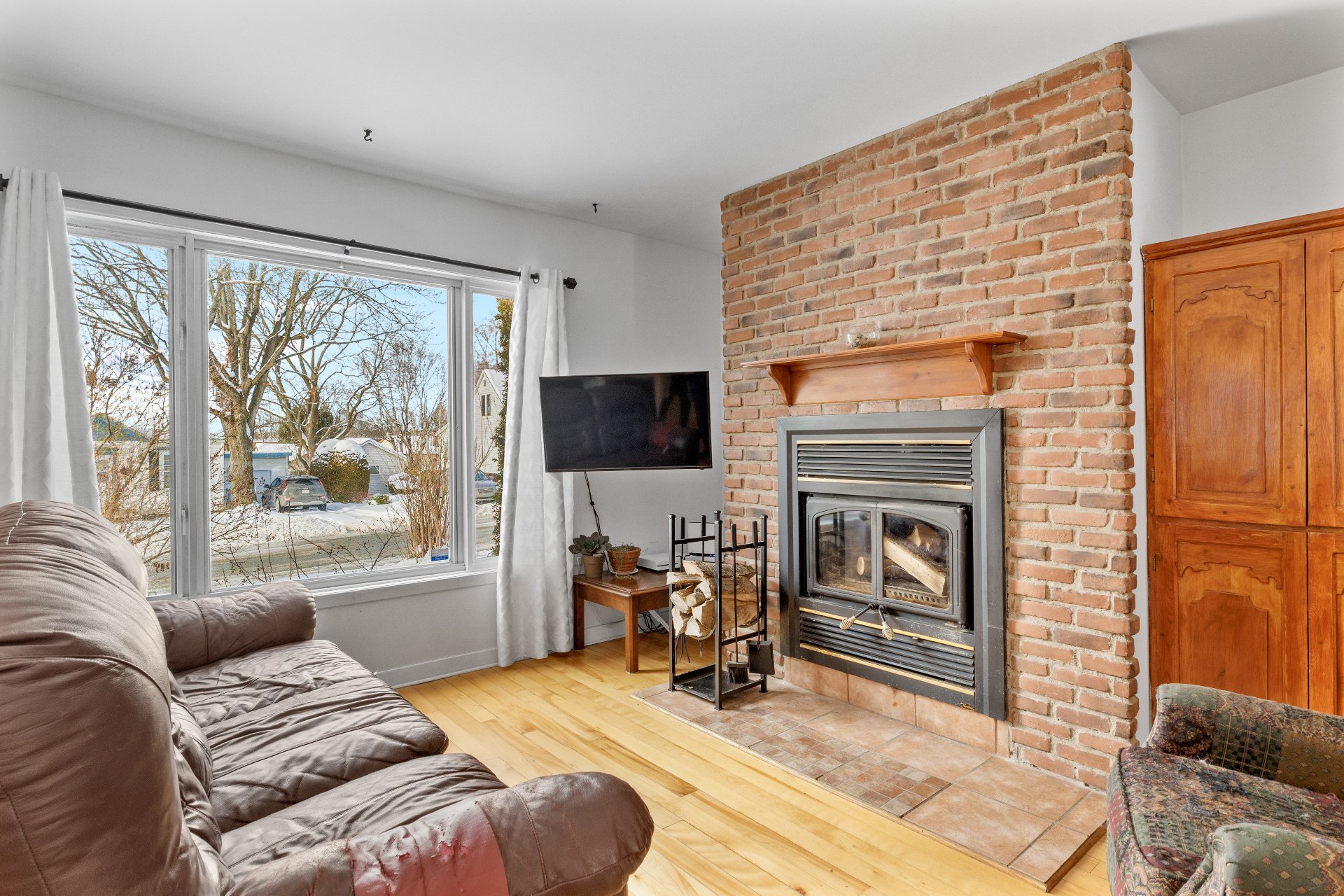 Luminaires, pôles et rideaux, stores, lave-vaisselle, cuisinière, réfrigérateur, support à télévision, deux chaises d'îlot, deux meubles/buffets dans la salle à manger, étagères du sous-sol, congélateur dans le garage.