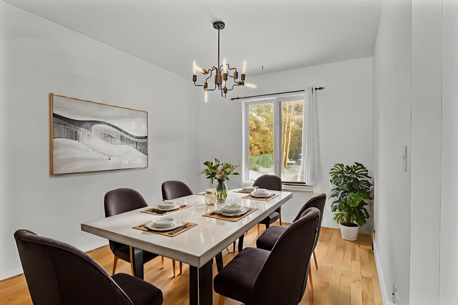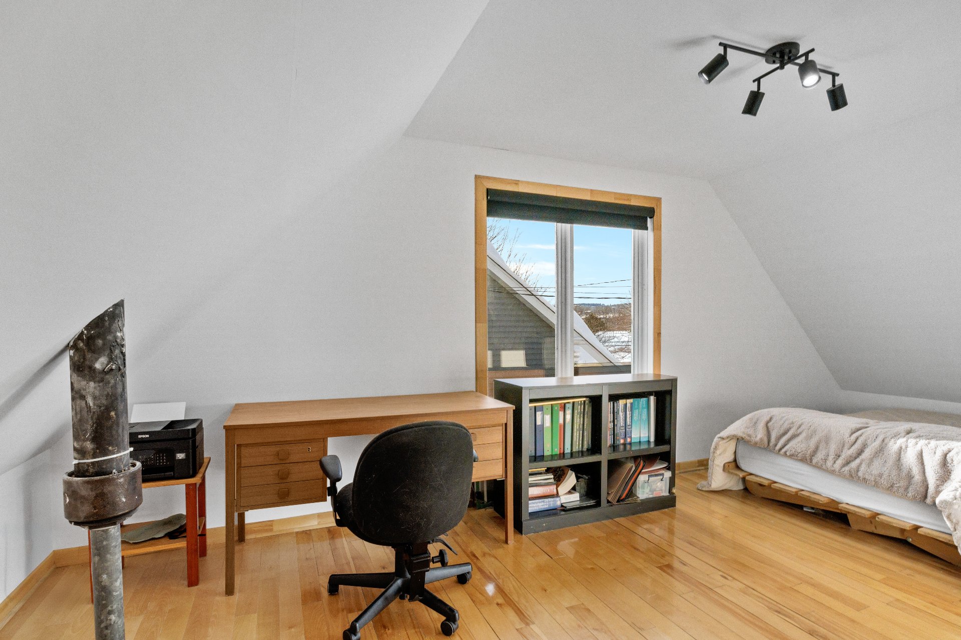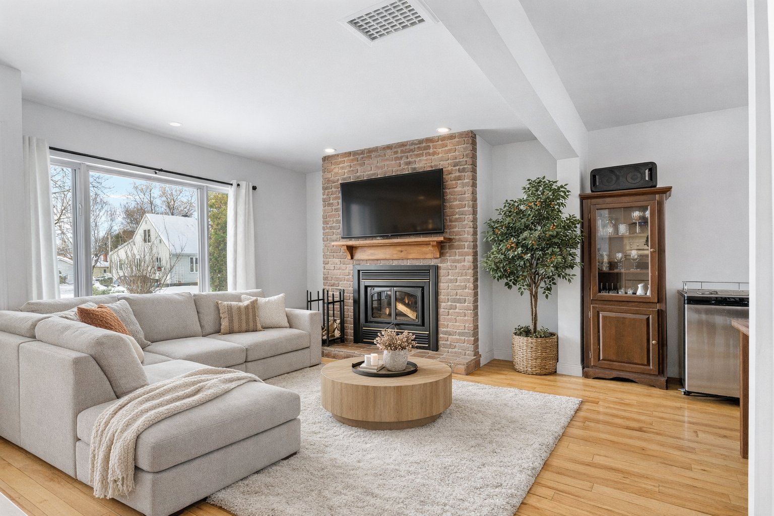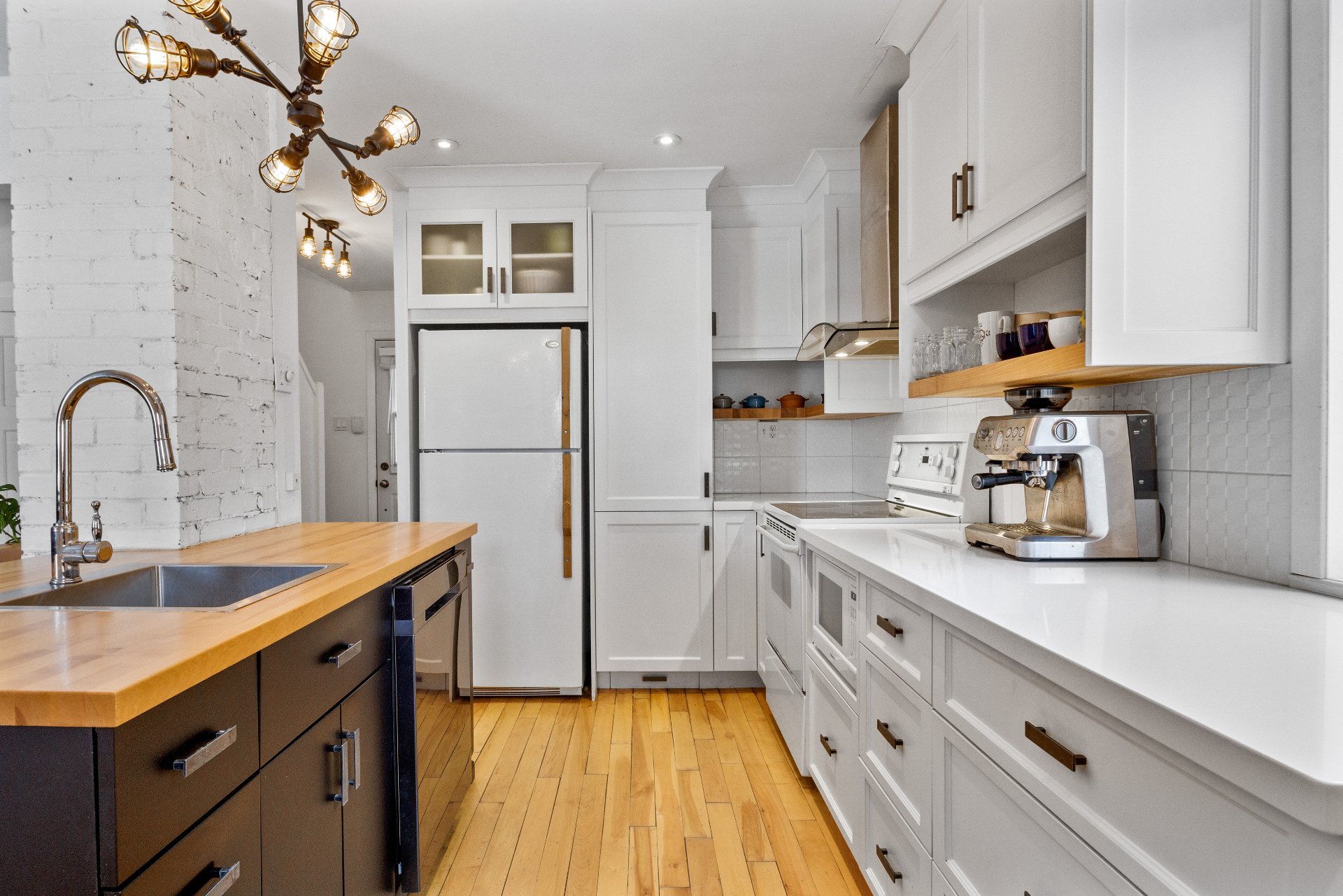 Luminaires, pôles et rideaux, stores, lave-vaisselle, cuisinière, réfrigérateur, support à télévision, deux chaises d'îlot, deux meubles/buffets dans la salle à manger, étagères du sous-sol, congélateur dans le garage.