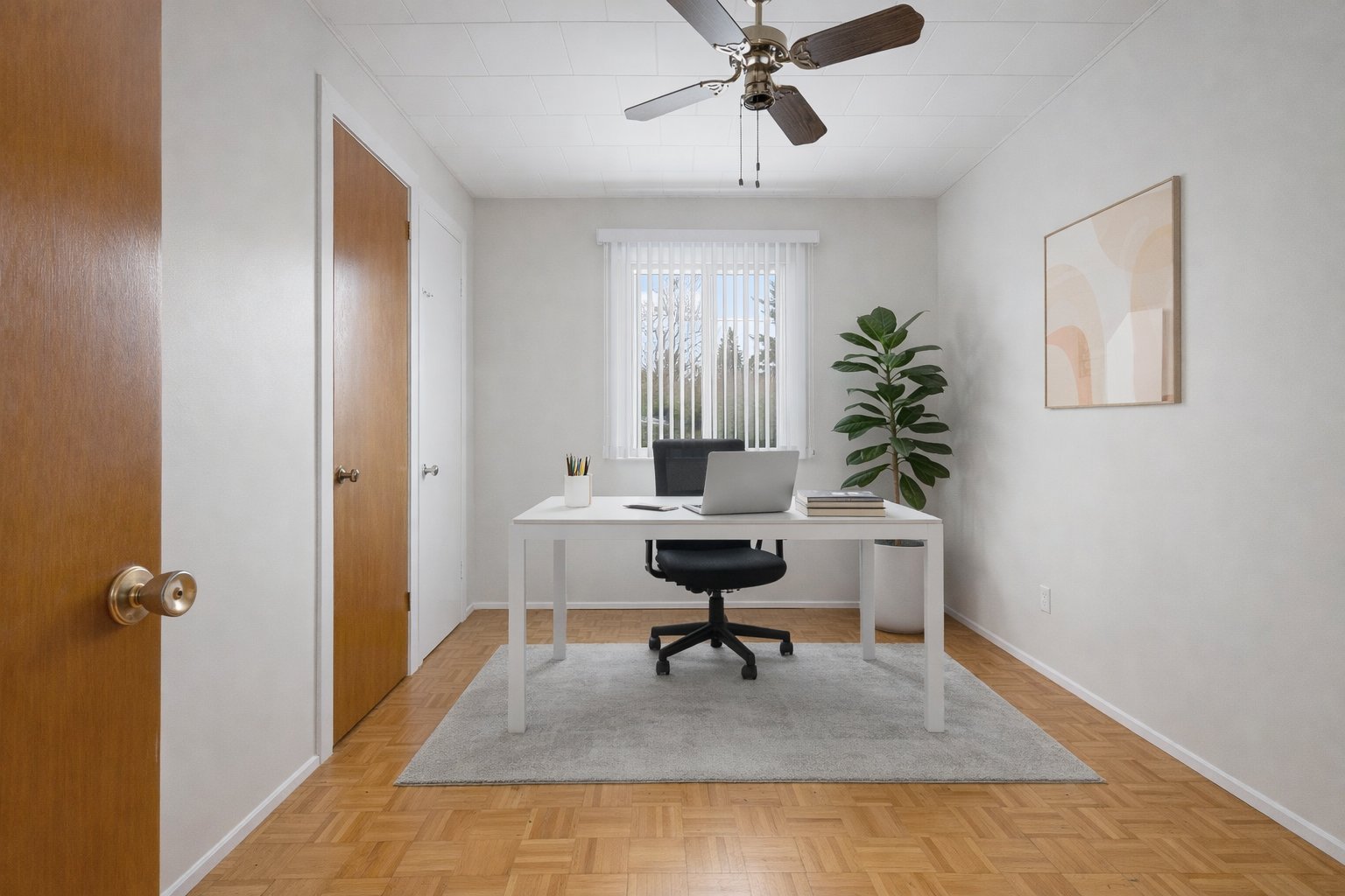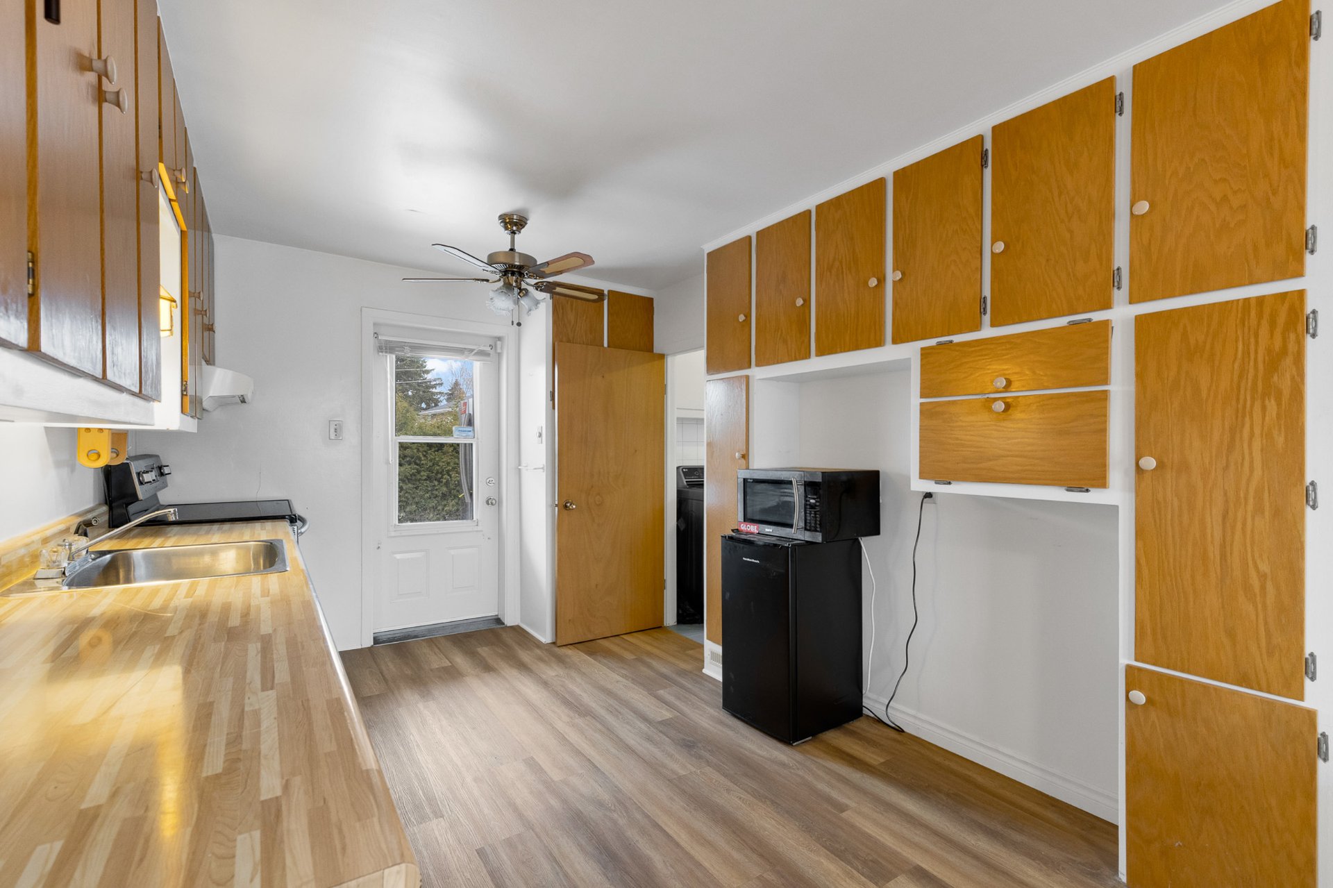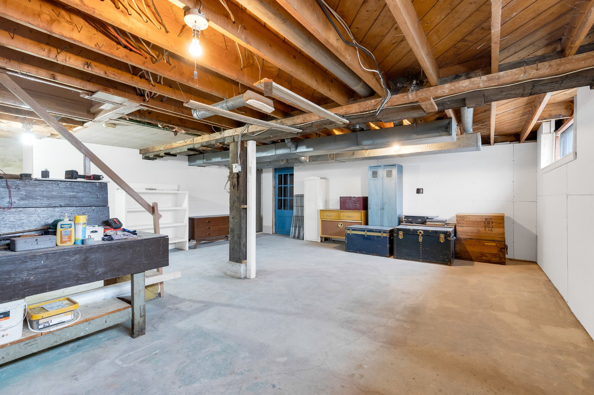 Fixtures de lumières, stores, étagères au sous-sol.