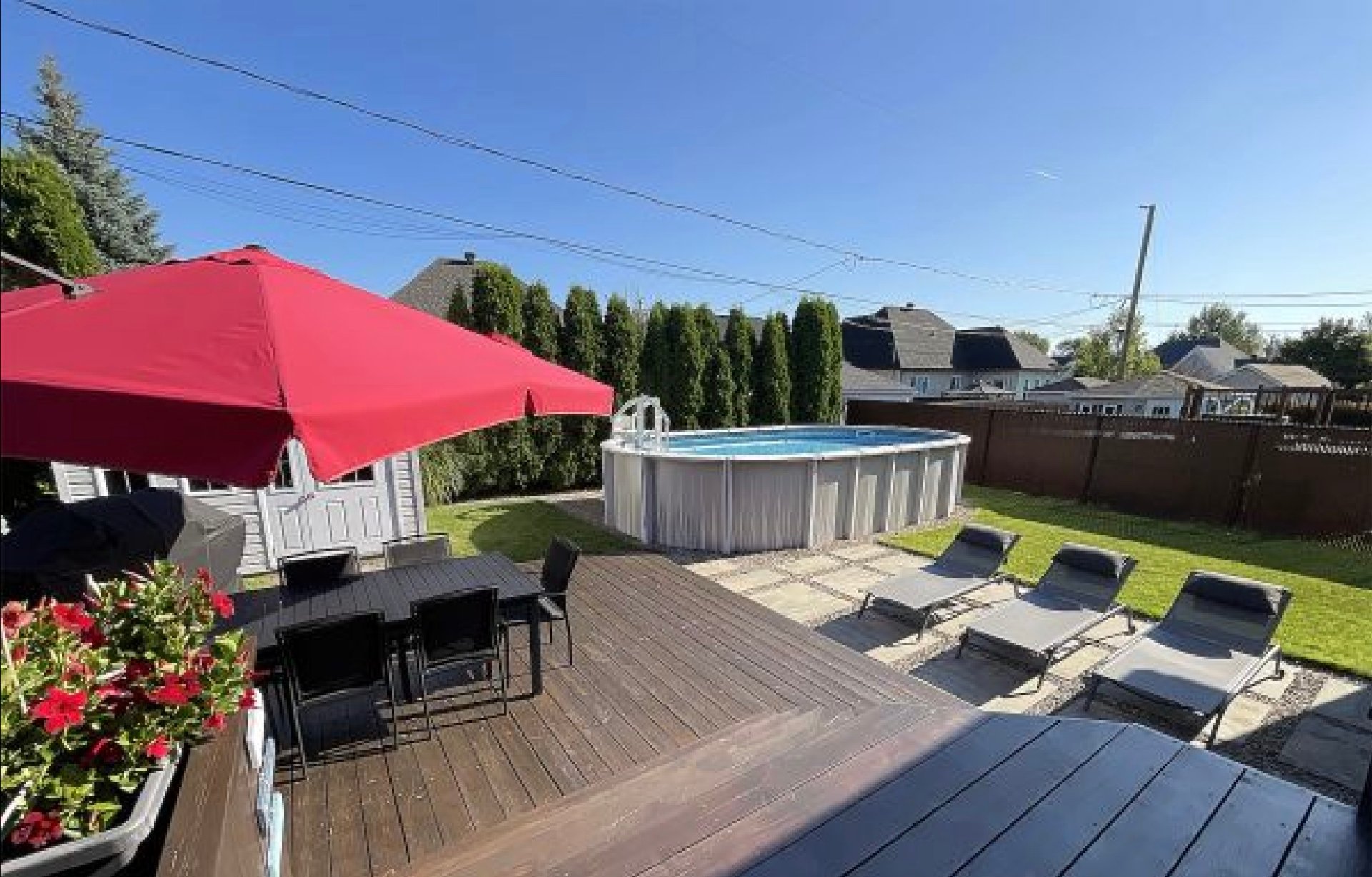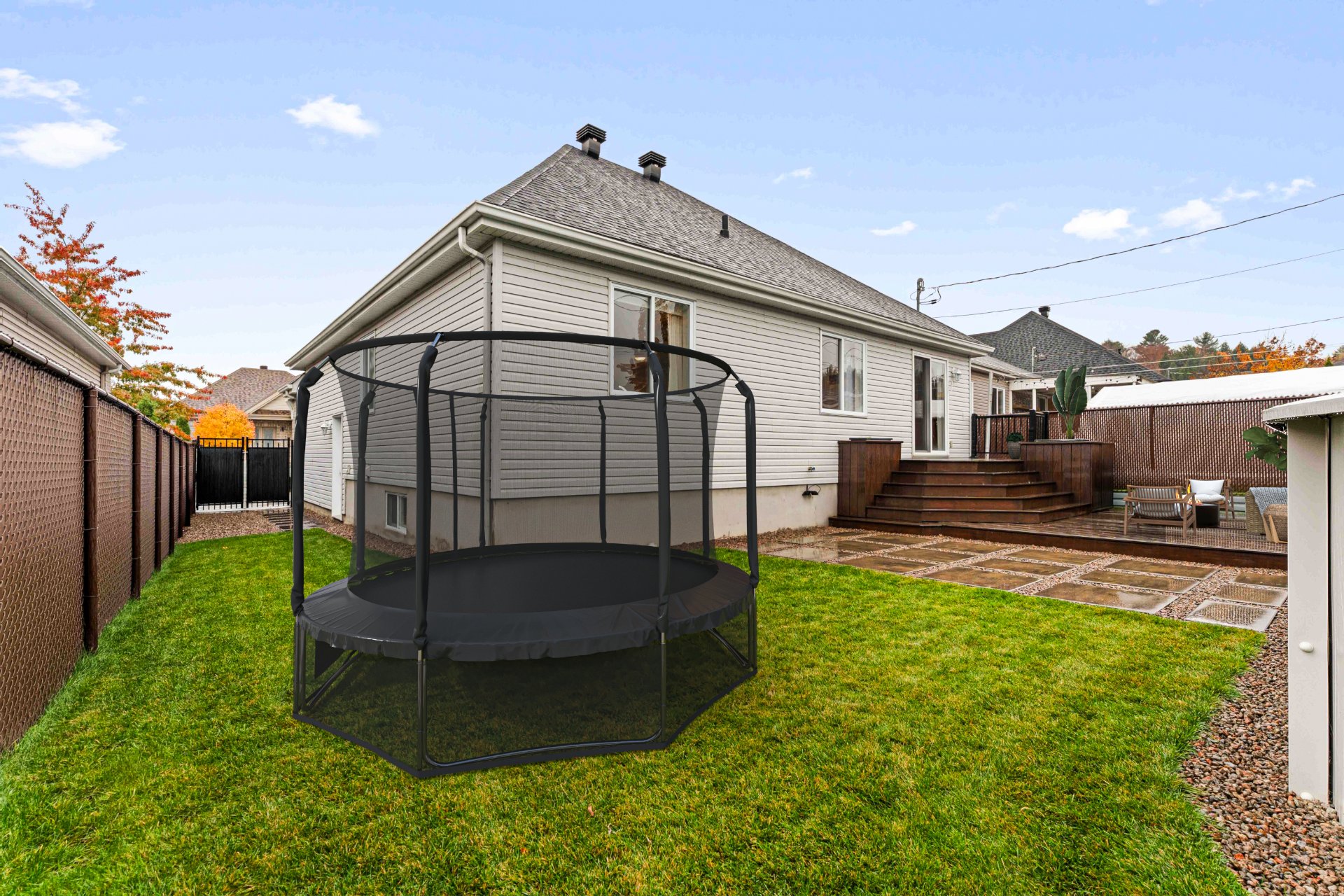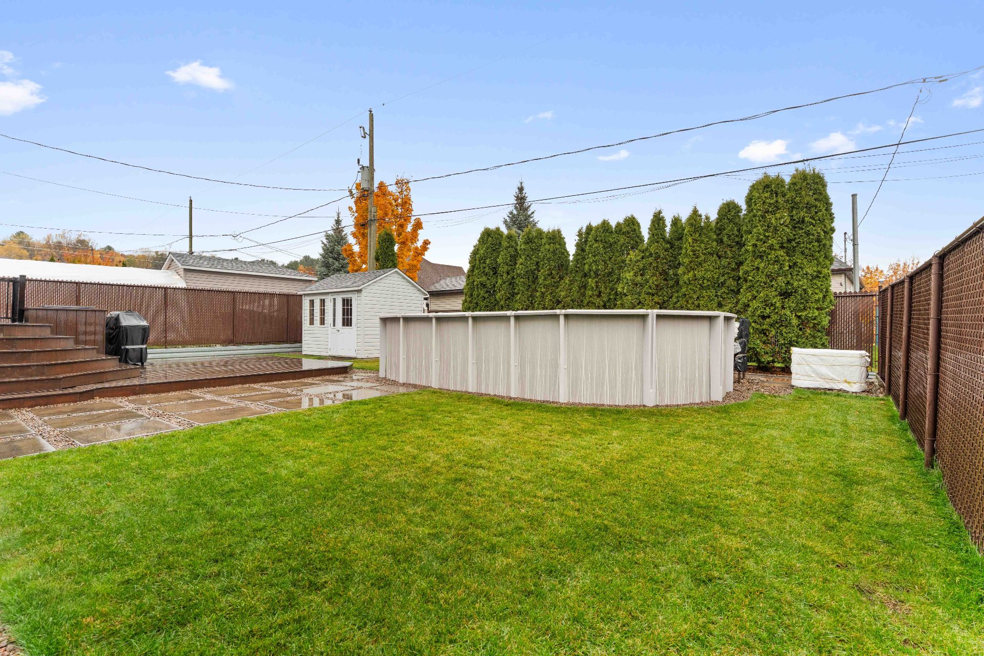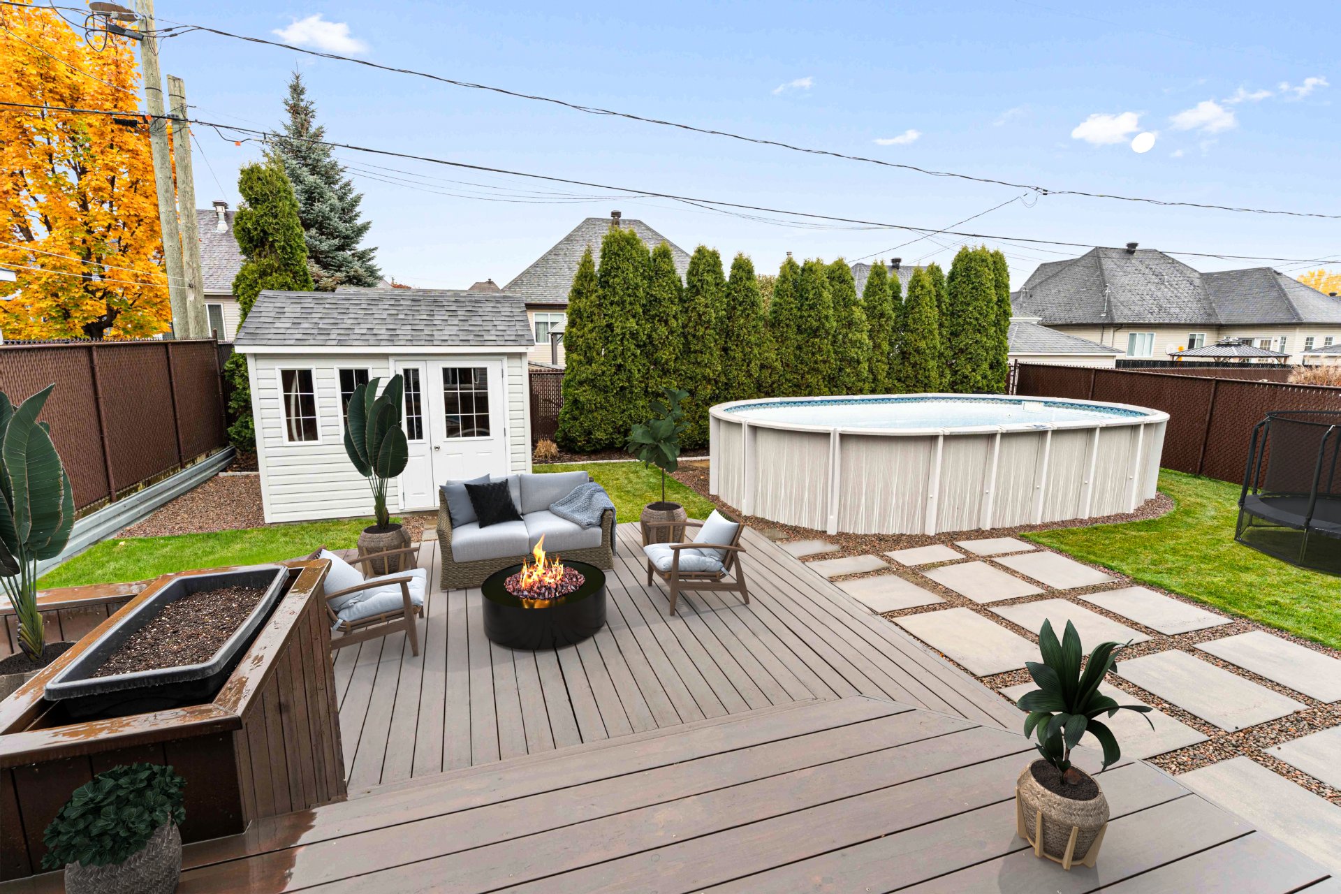 Luminaires, stores, rideaux et pôles, réservoir d'eau chaude, lave-vaisselle, système d'alarme, foyer gaz, supports aux murs de TV, aspirateur central, échangeur d'air, meuble de rangement de la salle familiale, ouvre porte de garage et l'établie, piscine au sel et sa thermopompe, cabanon, 2 bacs à fleurs de la cour arrière, thermopome murale