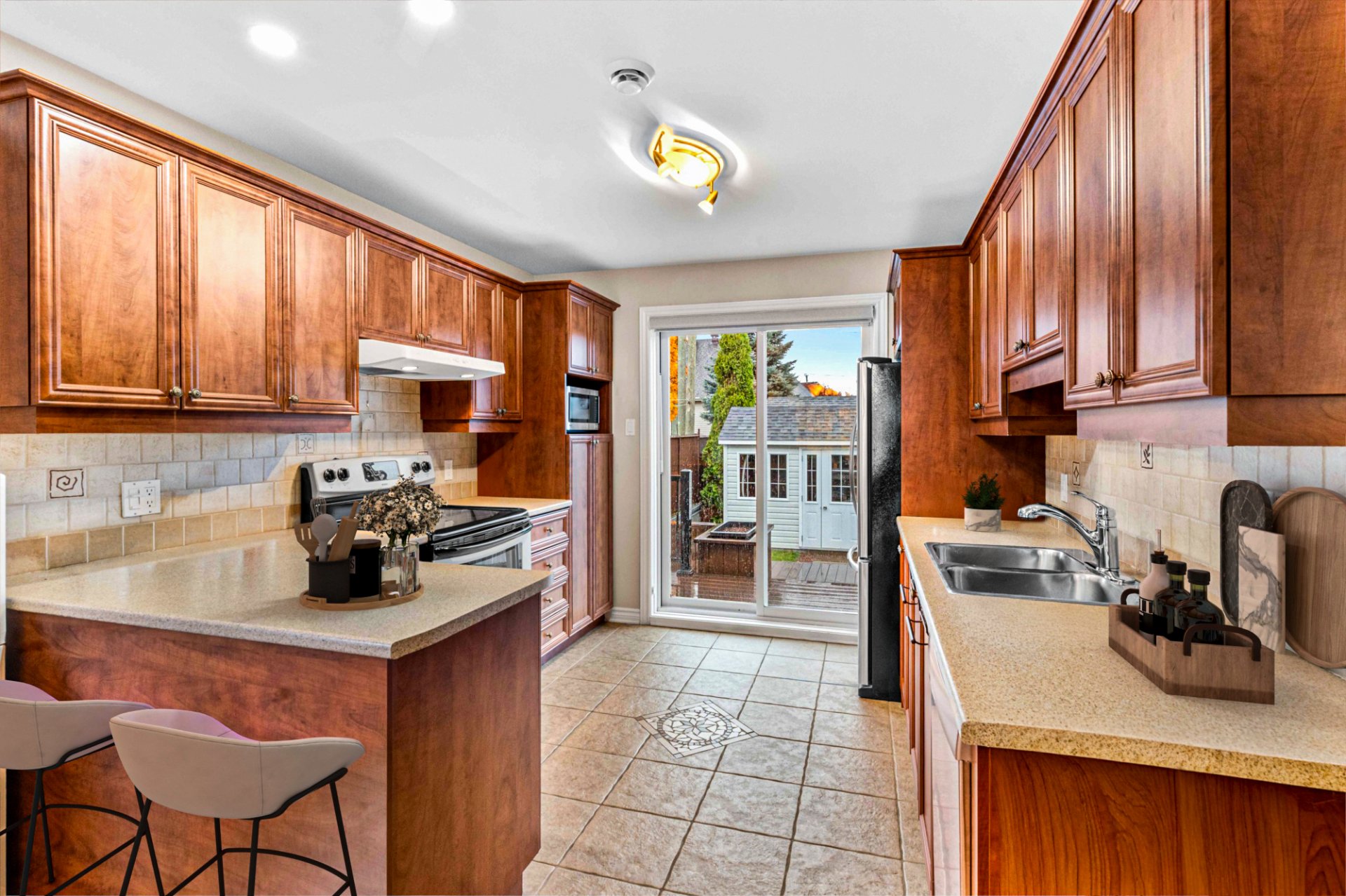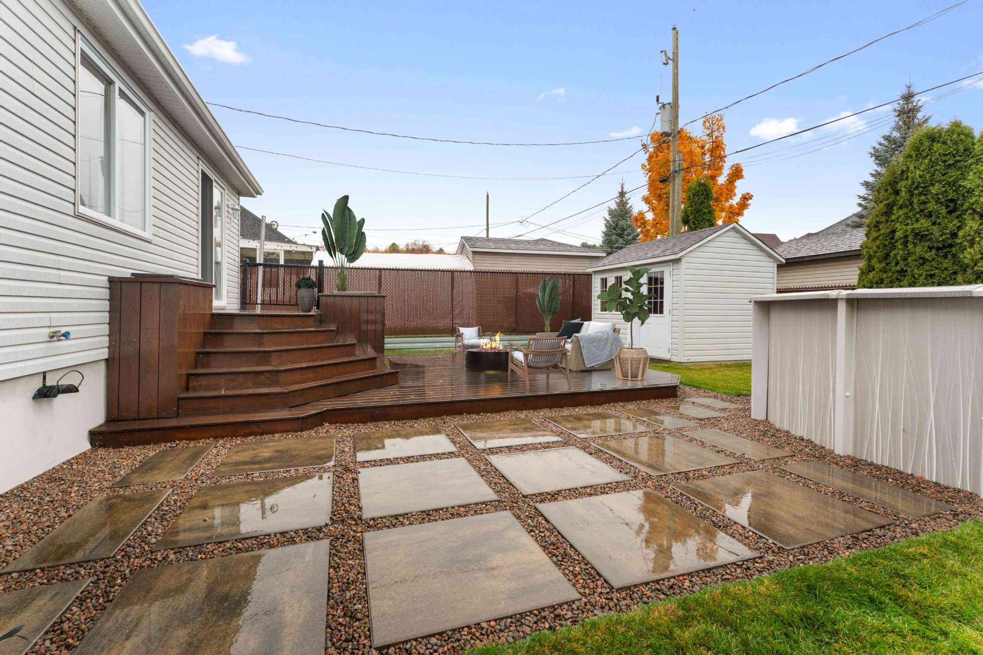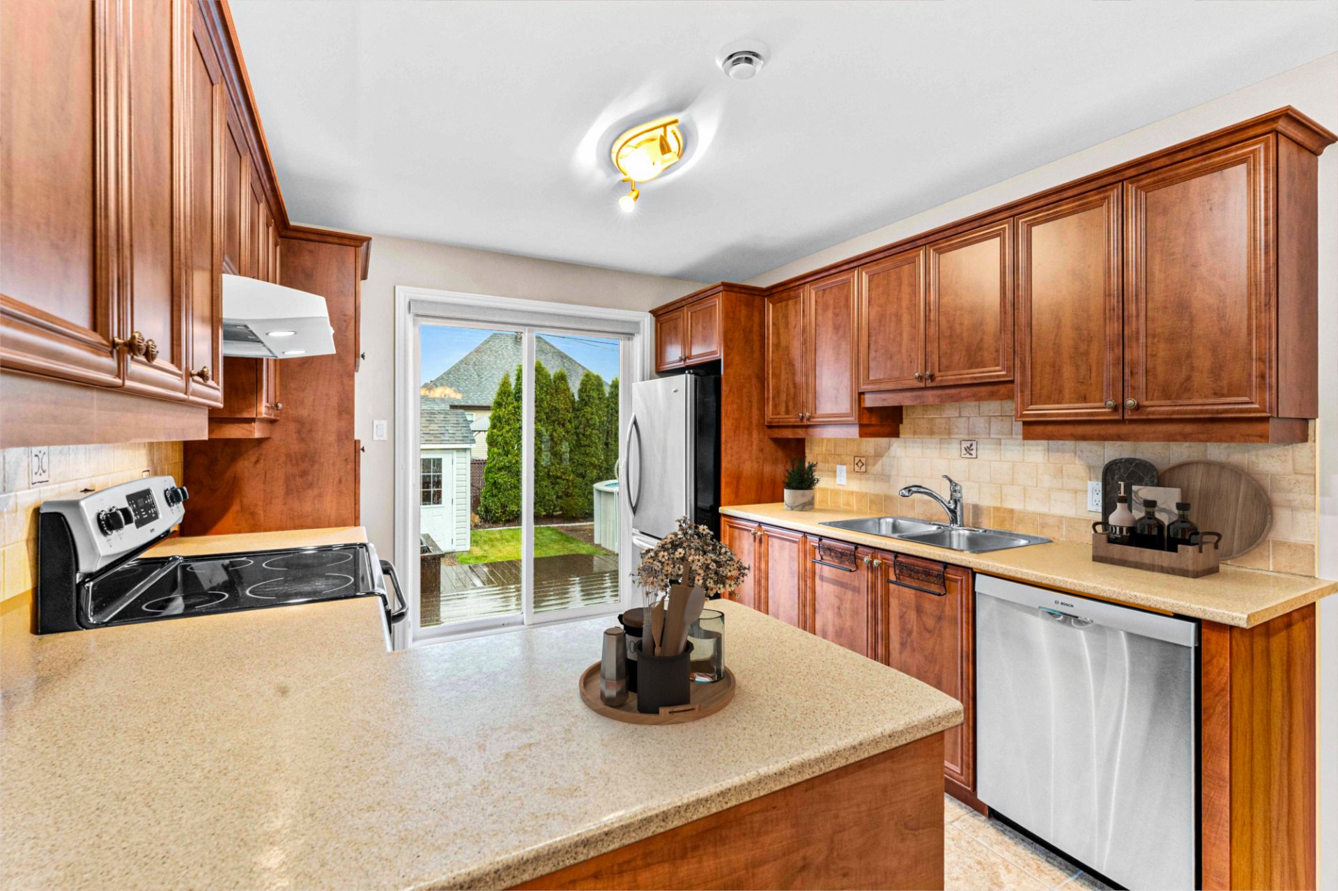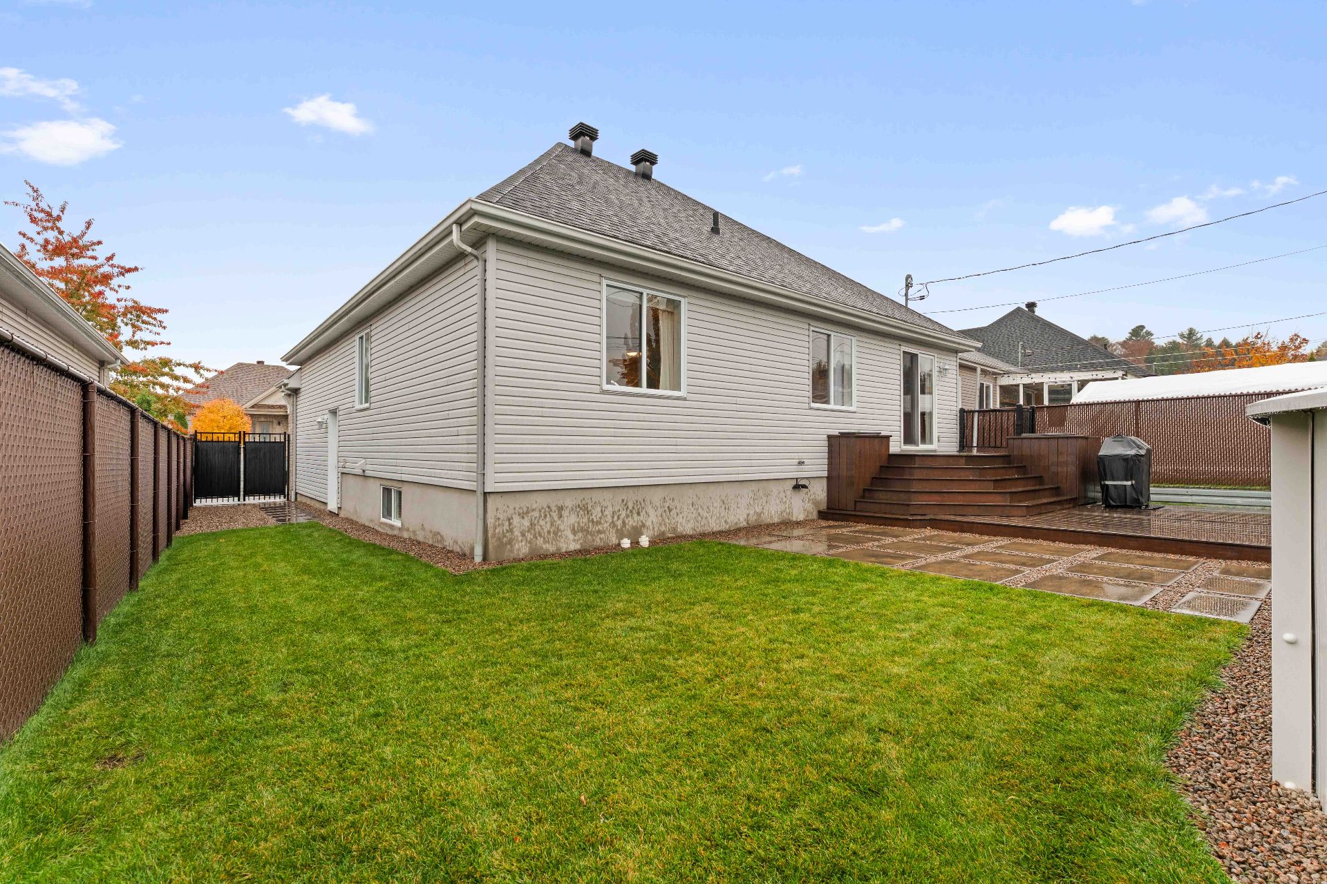 Luminaires, stores, rideaux et pôles, réservoir d'eau chaude, lave-vaisselle, système d'alarme, foyer gaz, supports aux murs de TV, aspirateur central, échangeur d'air, meuble de rangement de la salle familiale, ouvre porte de garage et l'établie, piscine au sel et sa thermopompe, cabanon, 2 bacs à fleurs de la cour arrière, thermopome murale