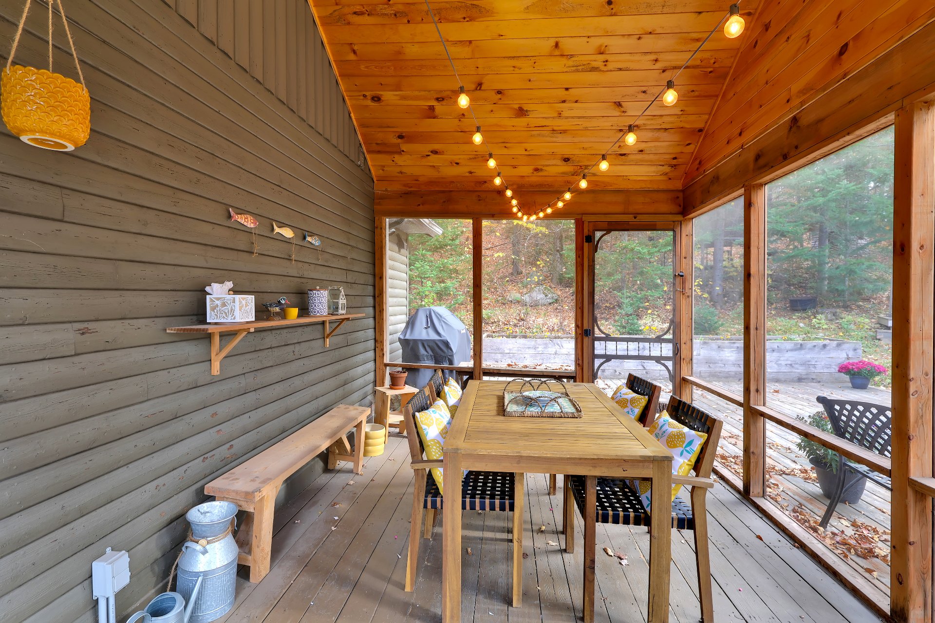 À l'extérieur, la grande terrasse en bois prolonge la vie