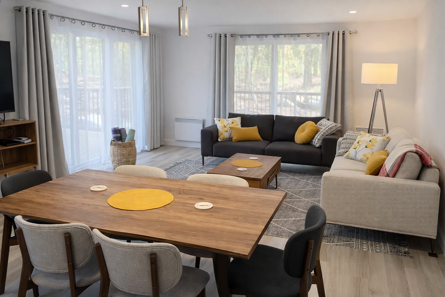 The sale is made fully furnished, including, without limitation, all appliances, equipment, installations, light fixtures, furniture, decorative items, dishware, utensils, bedding, and all movable property as present on the premises at the time of sale.