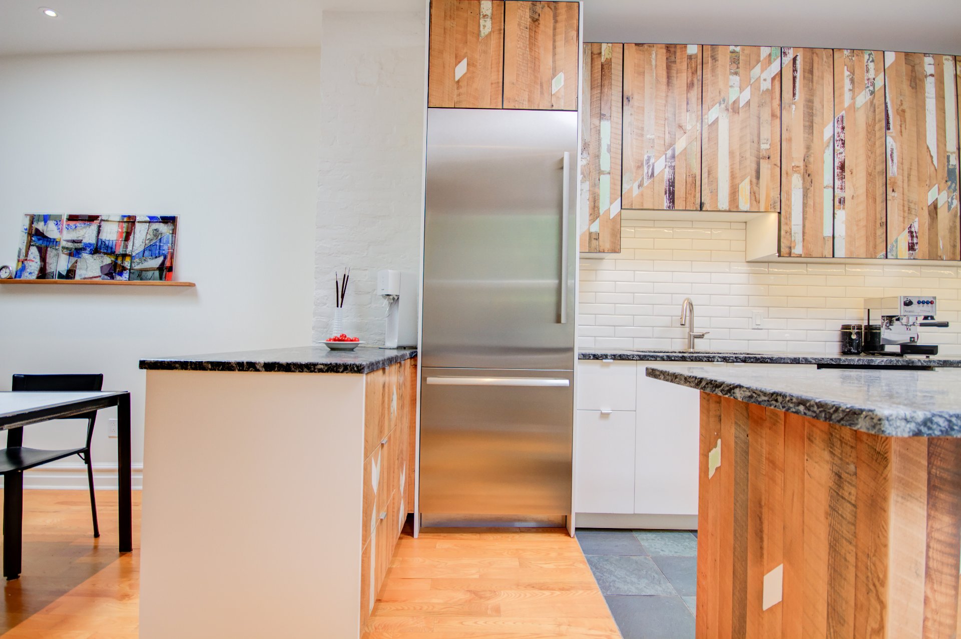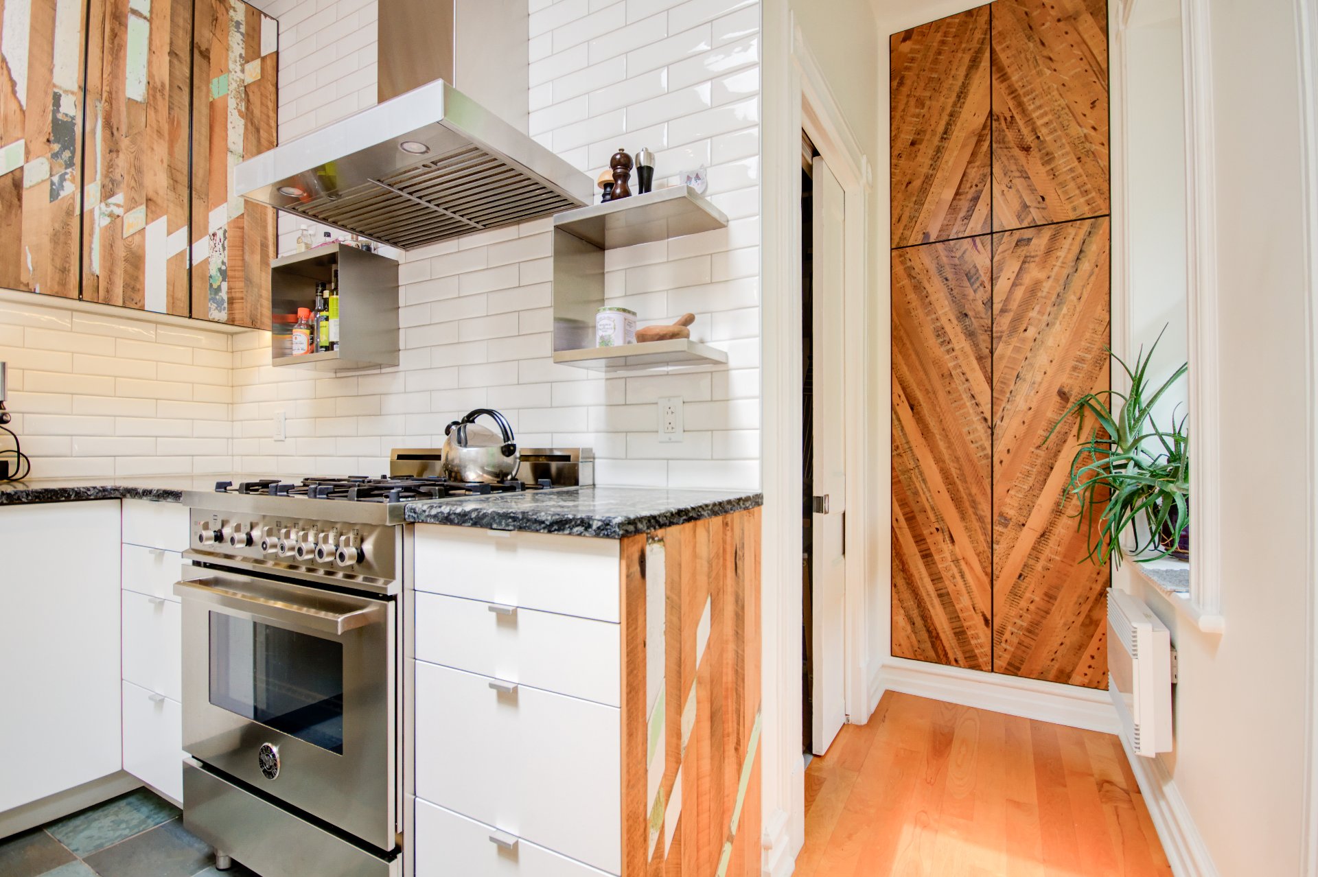 Appareils ménagers du 3e étage comprenant le réfrigérateur, la cuisinière au gaz, le lave-vaisselle, le micro-ondes et la laveuse-sécheuse superposée. Système de chauffe-eau au gaz au 3 étages.