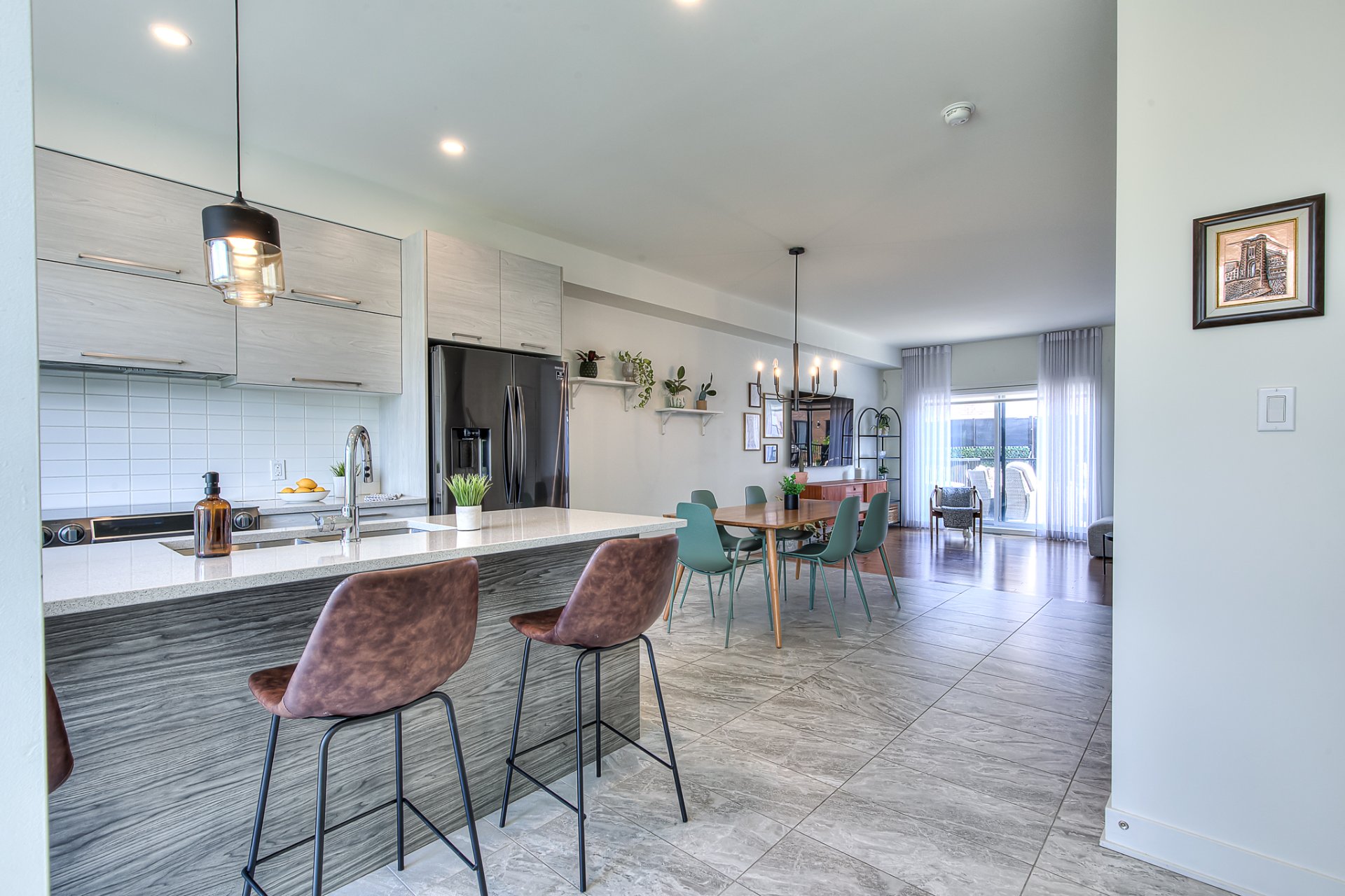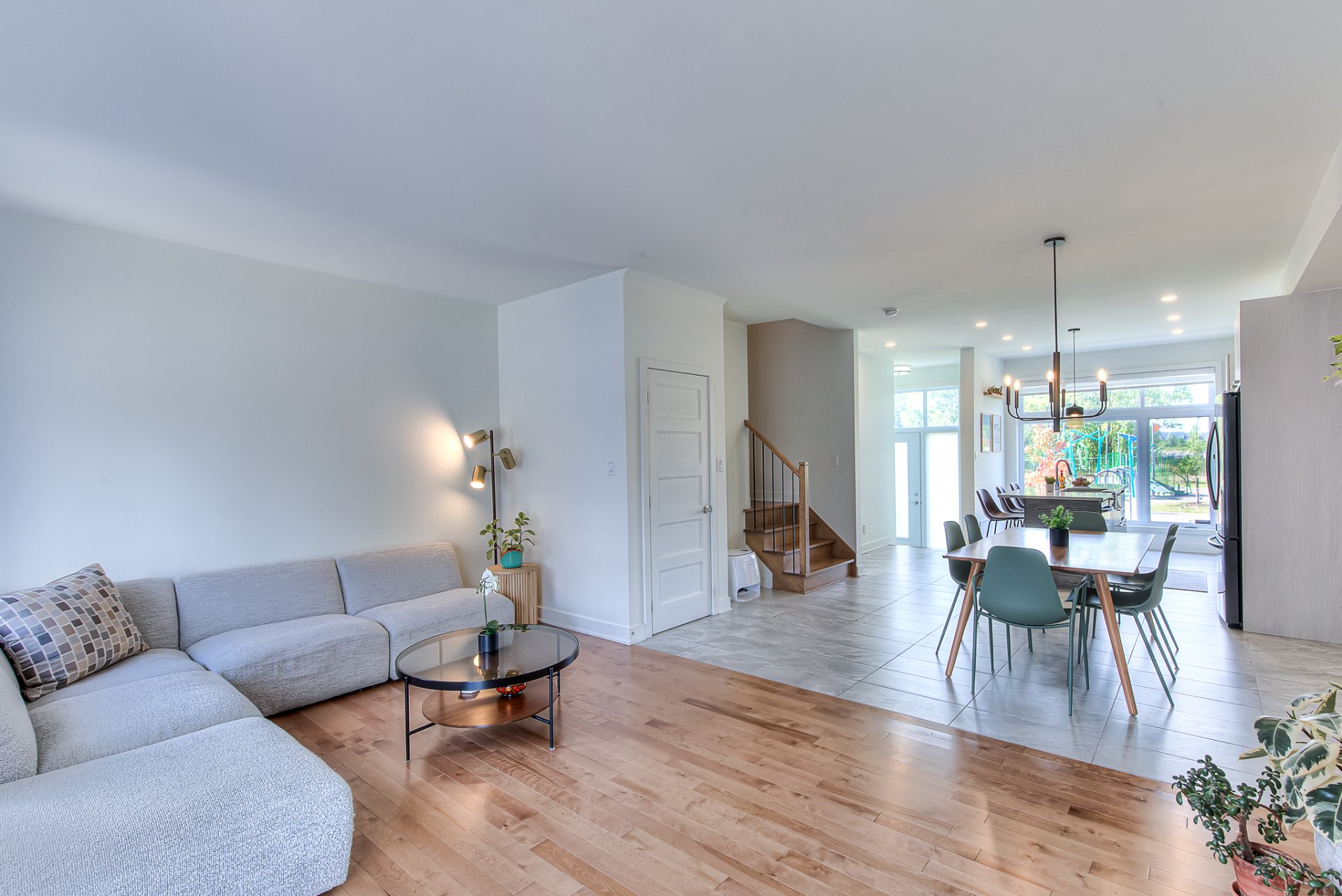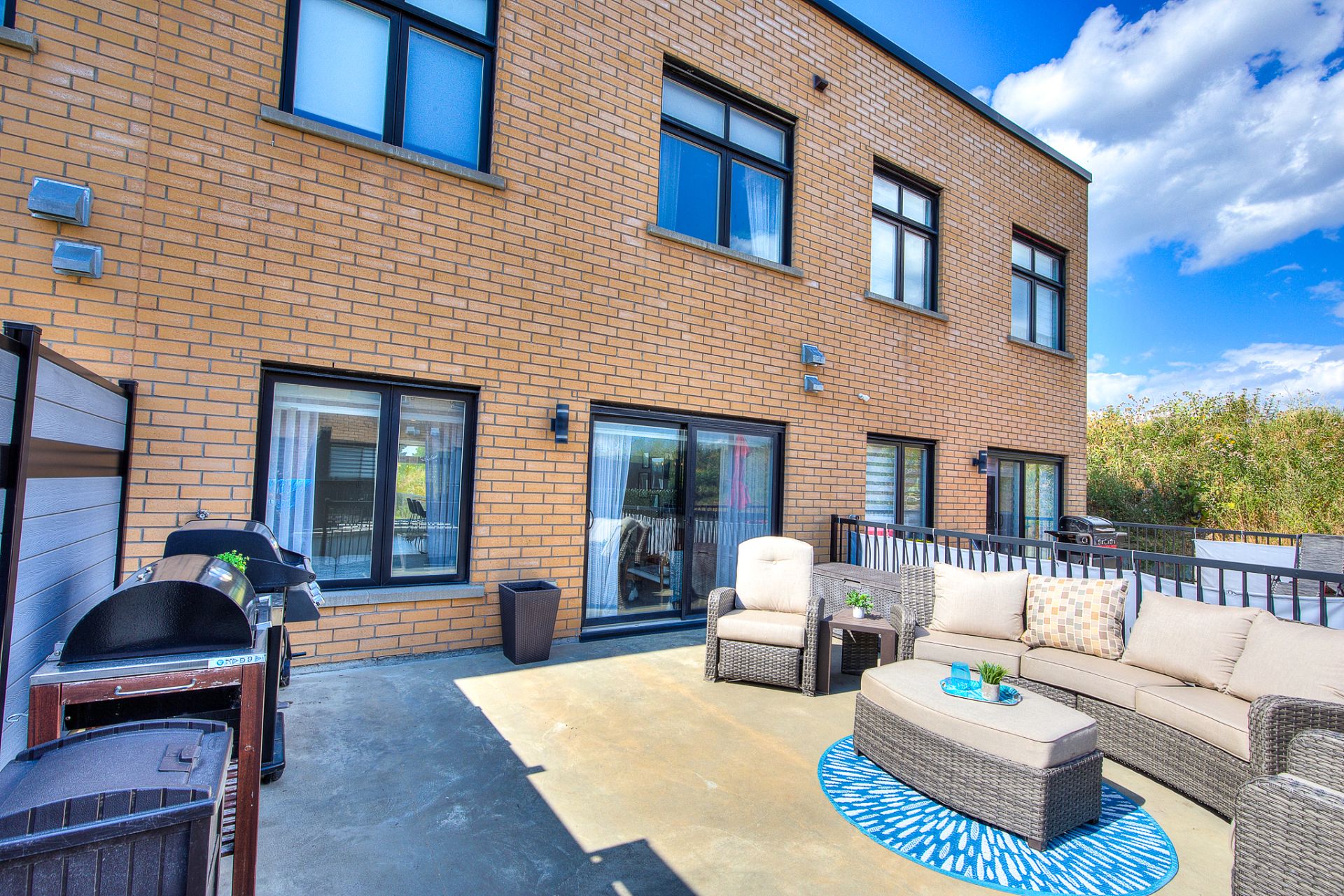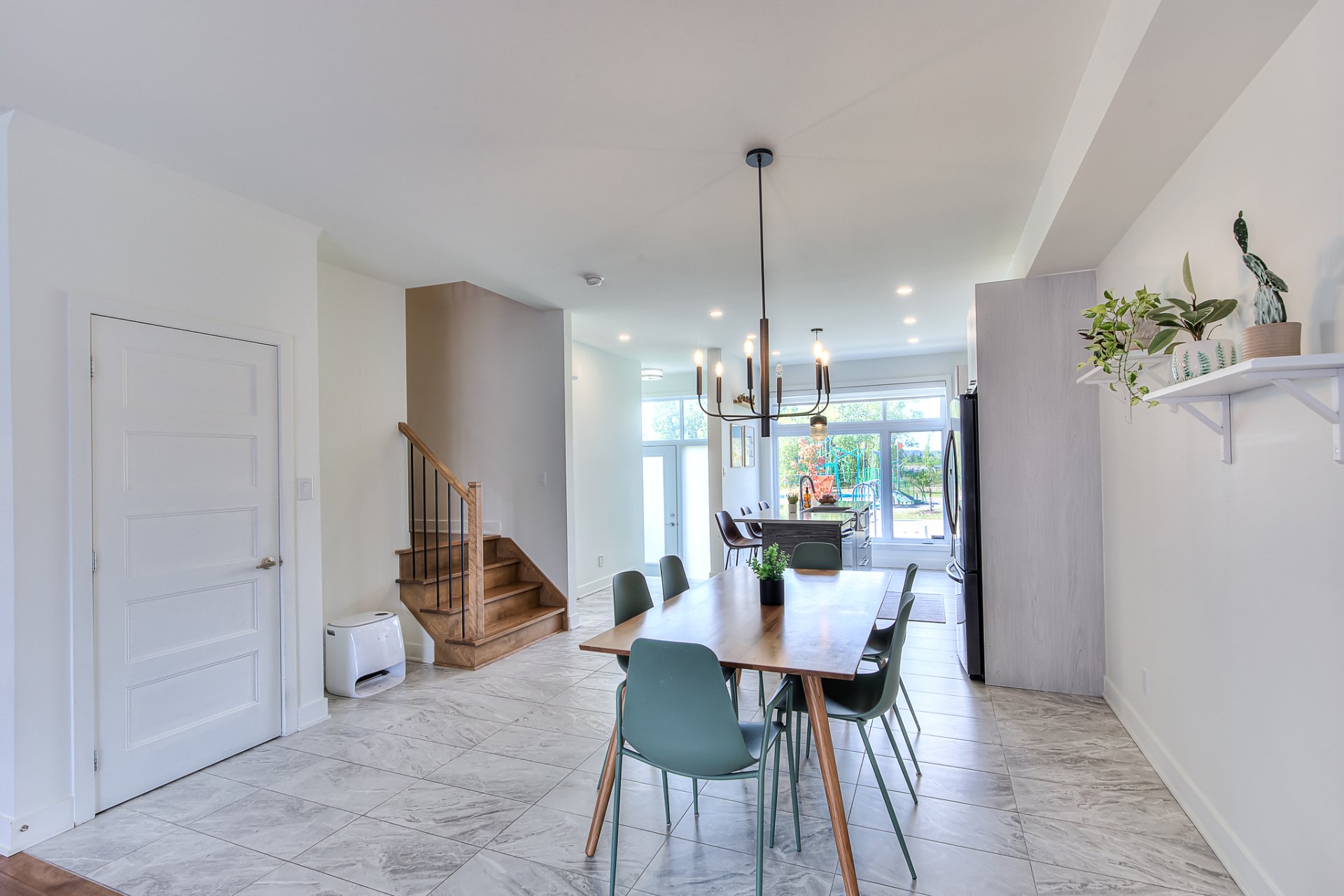Magnificent townhouse located in the prestigious "Villas-sur-Rive" neighborhood. The main floor, with 9-foot ceilings, offers a spacious open-concept layout featuring a stunning kitchen with an island that seats four, quartz countertops, and a view overlooking a beautiful park. The living and dining areas open onto a large terrace equipped with a natural gas hookup for a barbecue. Upstairs, you'll find three well-sized bedrooms, one bathroom, and a laundry room. The master bedroom includes a walk-in closet. Large windows throughout the home provide abundant natural light. (continued in addendum)