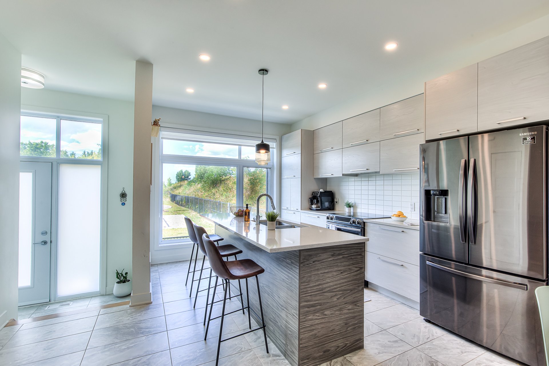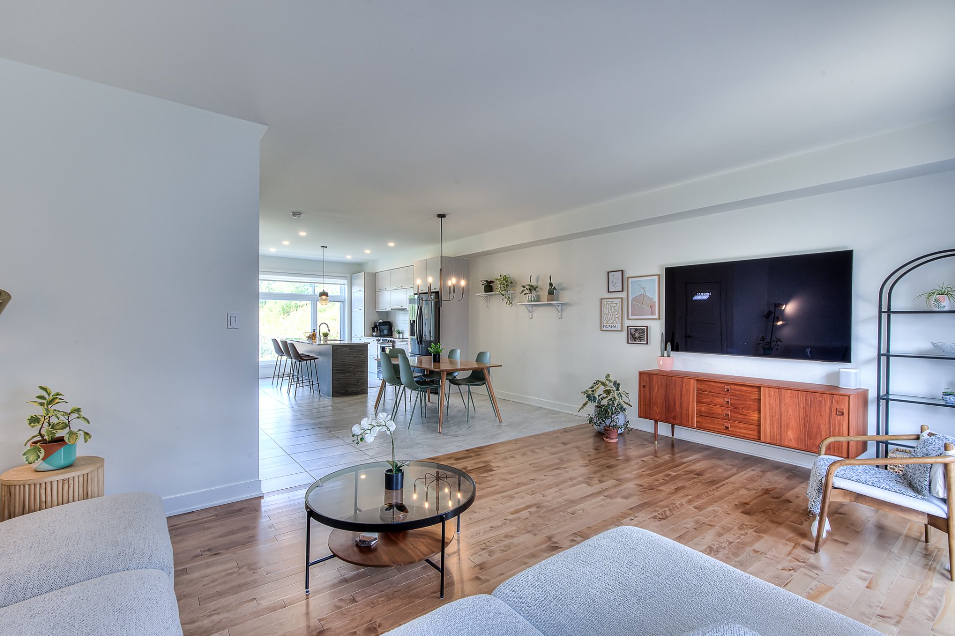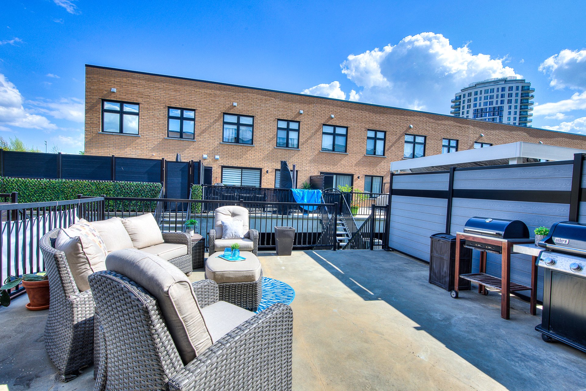Magnificent townhouse located in the prestigious "Villas-sur-Rive" neighborhood. The main floor, with 9-foot ceilings, offers a spacious open-concept layout featuring a stunning kitchen with an island that seats four, quartz countertops, and a view overlooking a beautiful park. The living and dining areas open onto a large terrace equipped with a natural gas hookup for a barbecue. Upstairs, you'll find three well-sized bedrooms, one bathroom, and a laundry room. The master bedroom includes a walk-in closet. Large windows throughout the home provide abundant natural light. (continued in addendum)