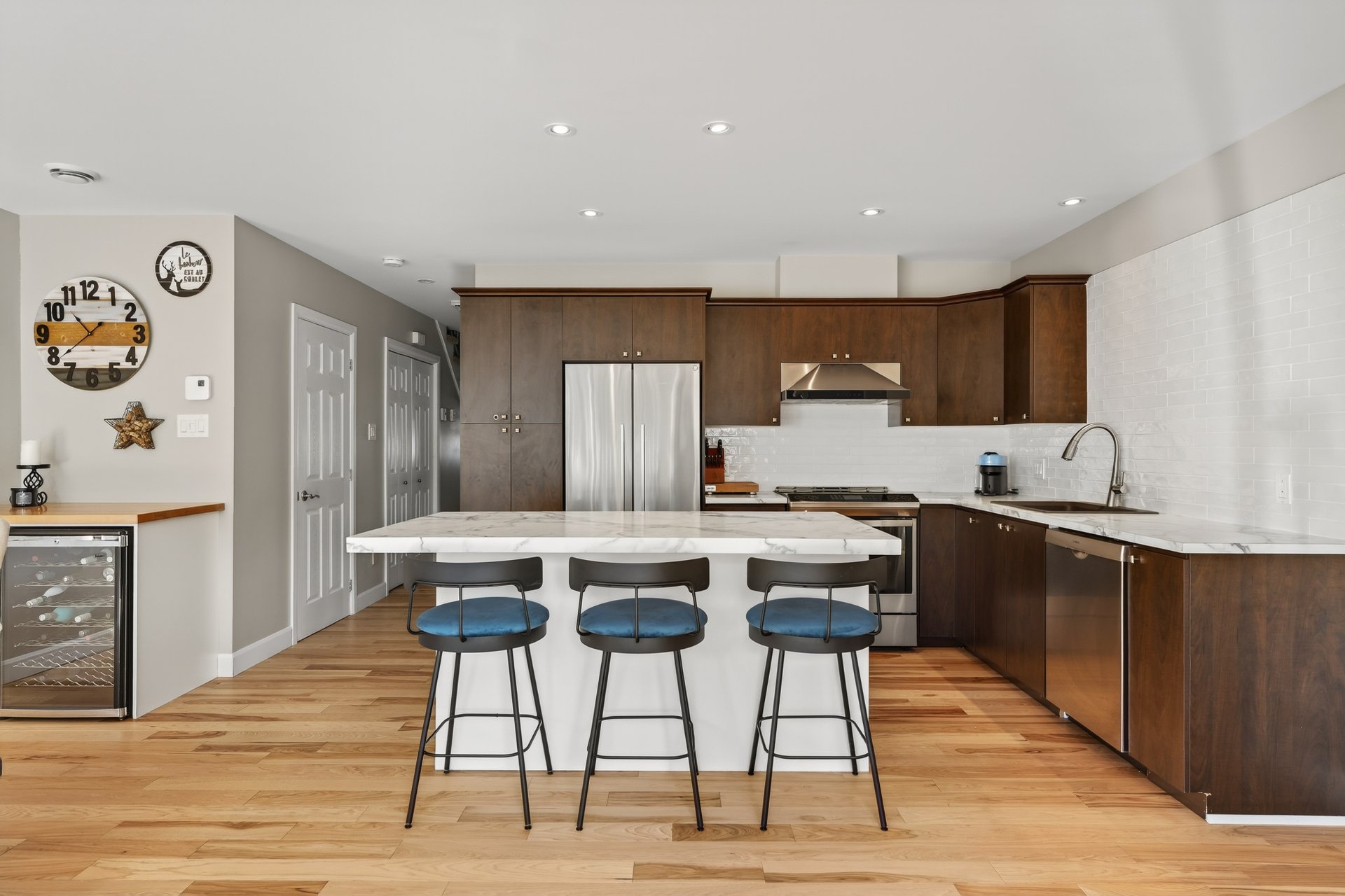 Borealis -- Charming, two-story townhouse in a peaceful area of Mont-Tremblant. Features include a beautiful, inviting kitchen; three bedrooms; a garage; and a large rear terrace -- perfect for enjoying the outdoors. Residents also enjoy access to a large communal swimming pool and a shuttle service to the resort. This is an ideal location for active families looking for comfort and tranquility. SHORT-TERM RENTAL PERMITTED.