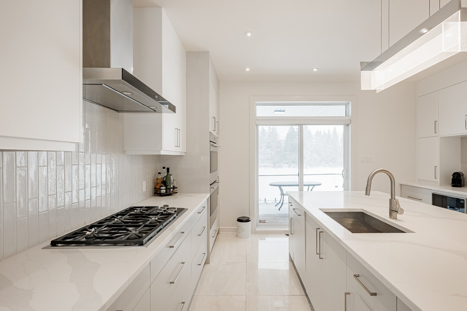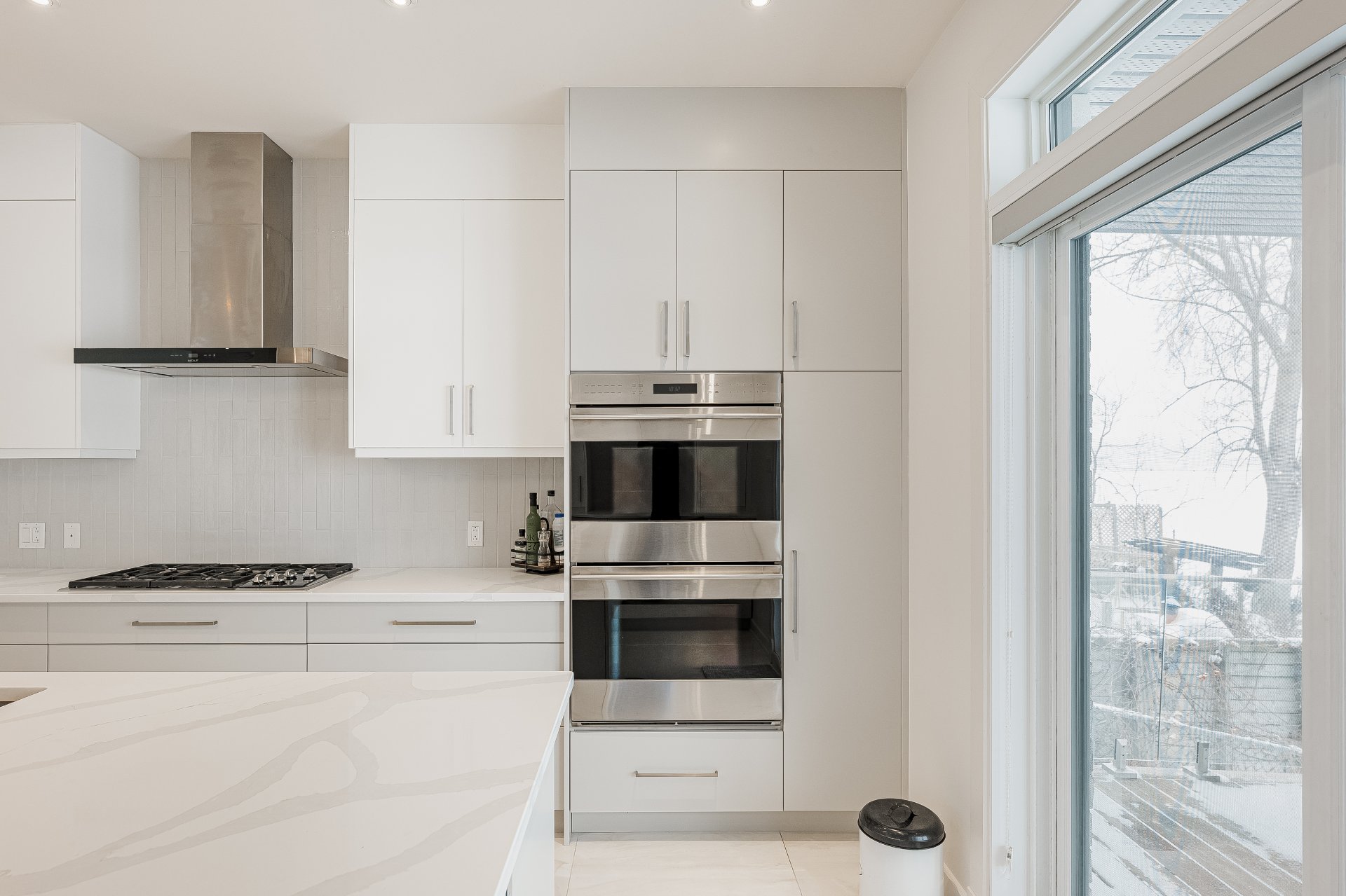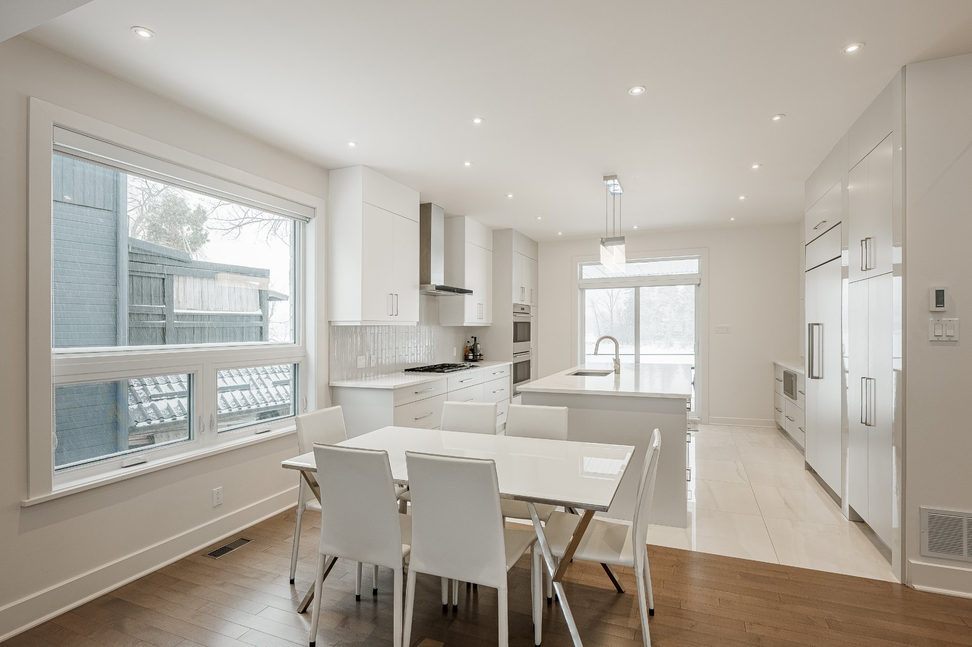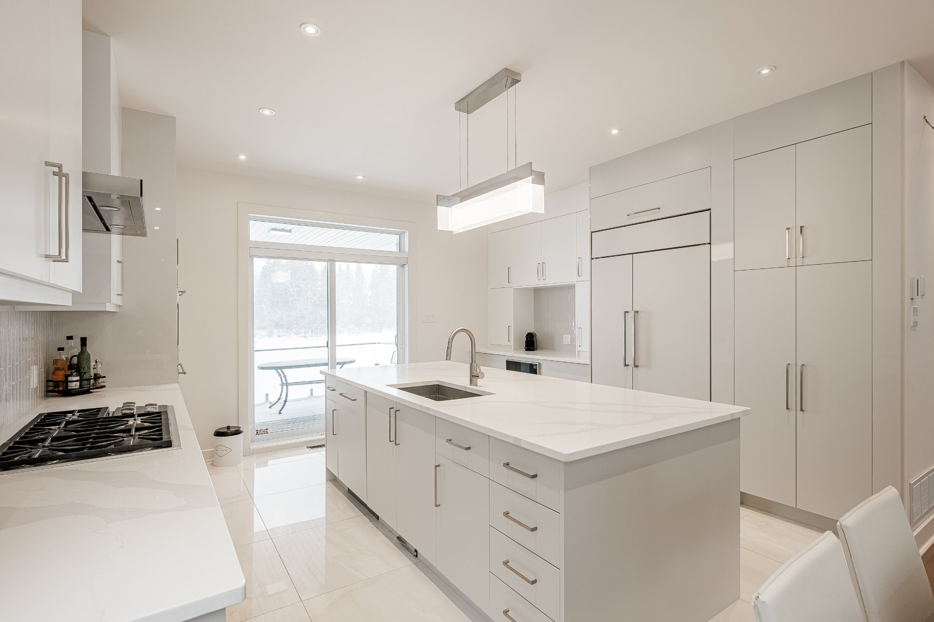 Luminaires, stores, réfrigérateur, plaque chauffante au gaz, 2 fours encastrés, lave-vaisselle, aspirateur central et accessoires, ouvre porte de garage électrique, étagères intégrées du cellier et compresseur (n'a ja...