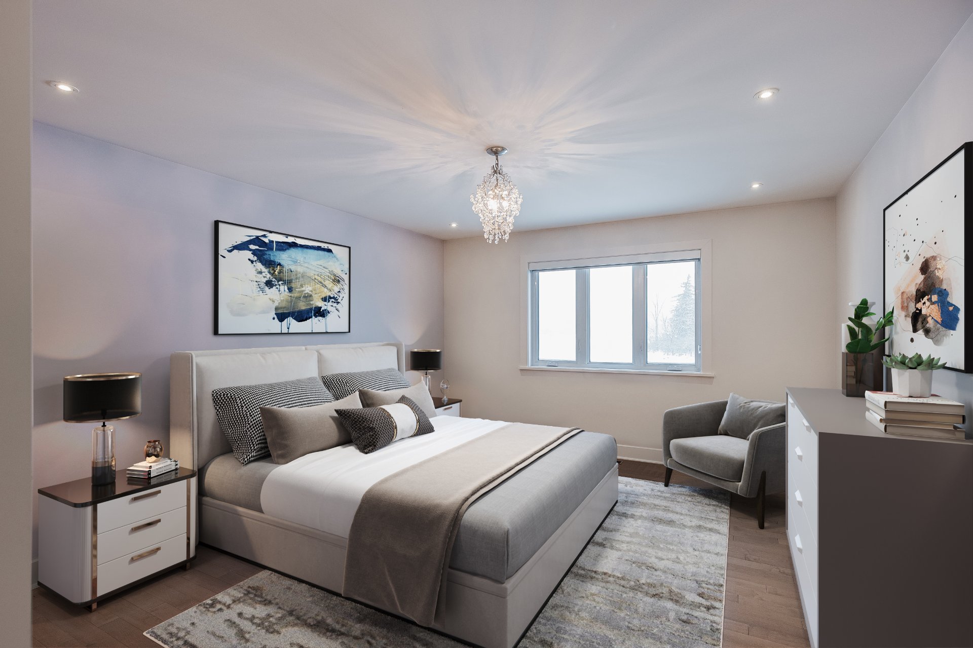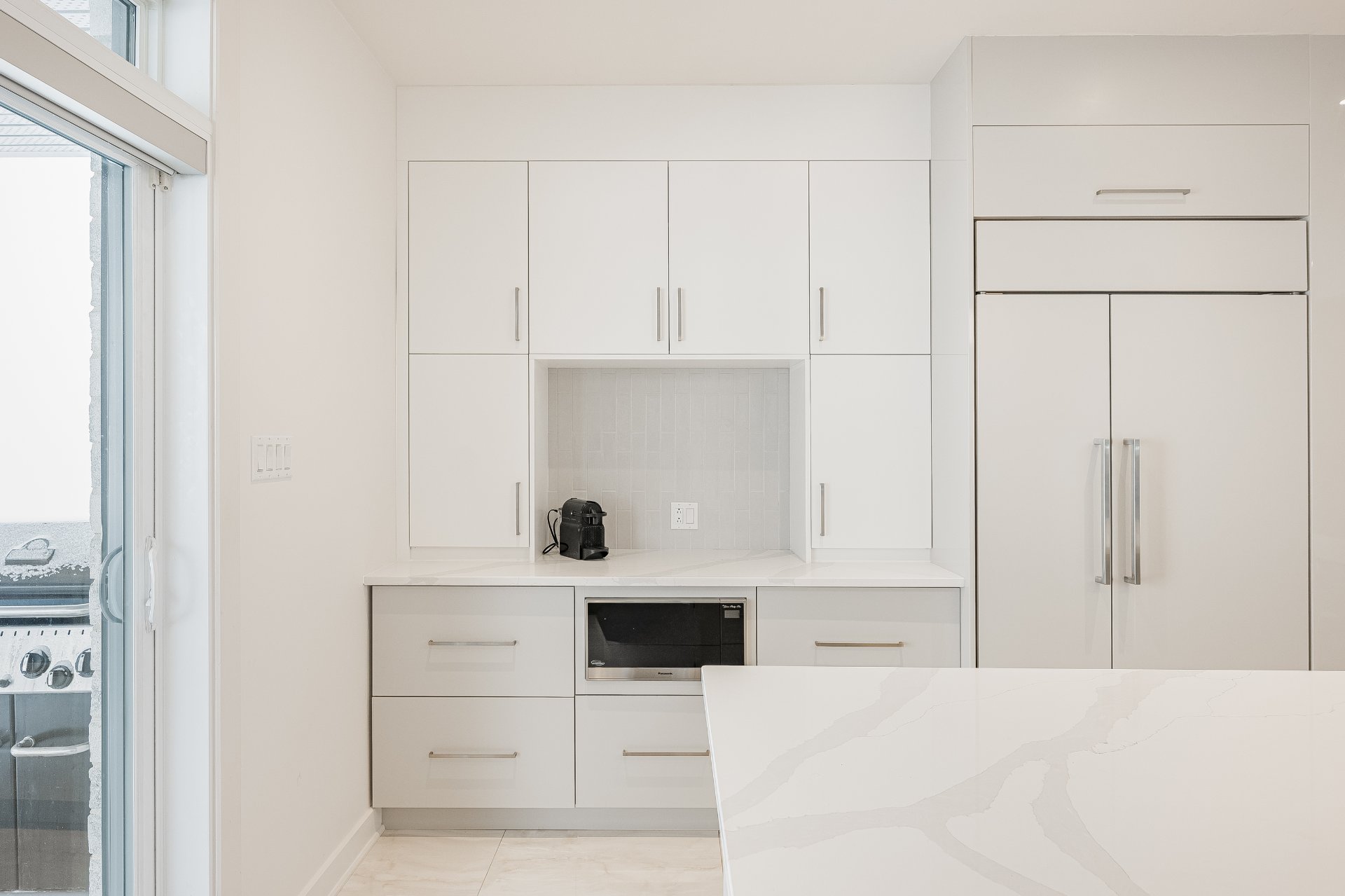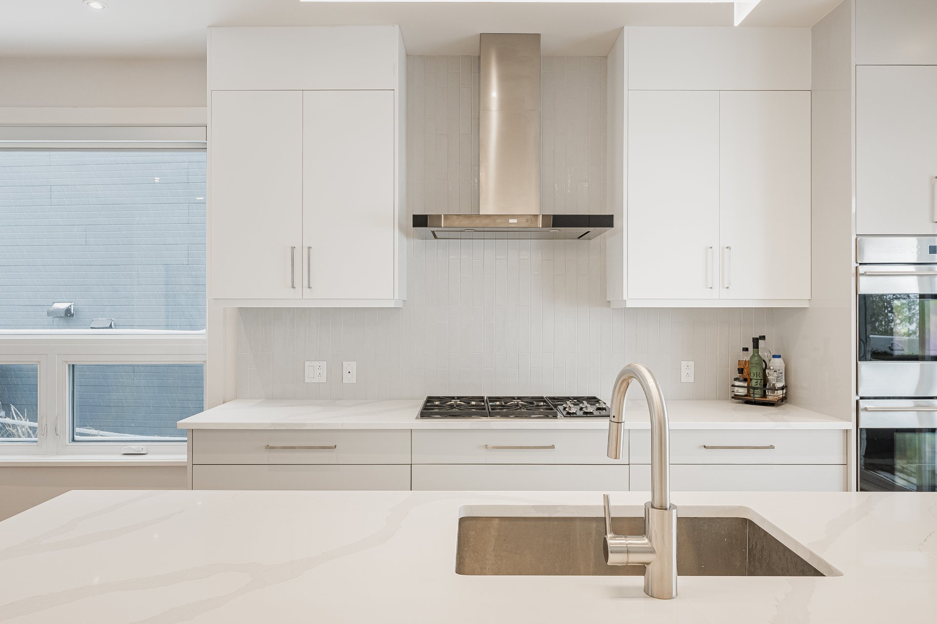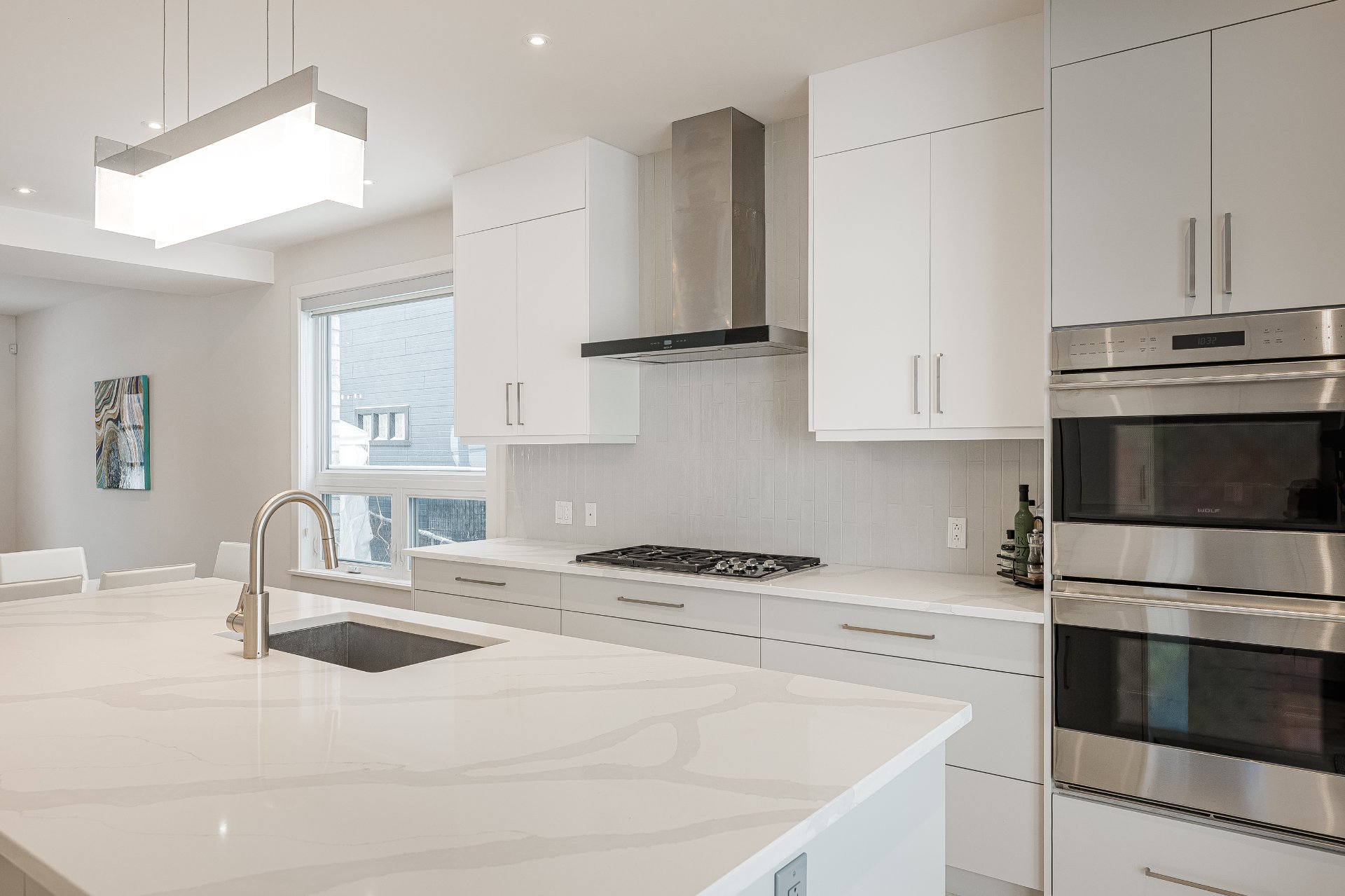 Luminaires, stores, réfrigérateur, plaque chauffante au gaz, 2 fours encastrés, lave-vaisselle, aspirateur central et accessoires, ouvre porte de garage électrique, étagères intégrées du cellier et compresseur (n'a ja...