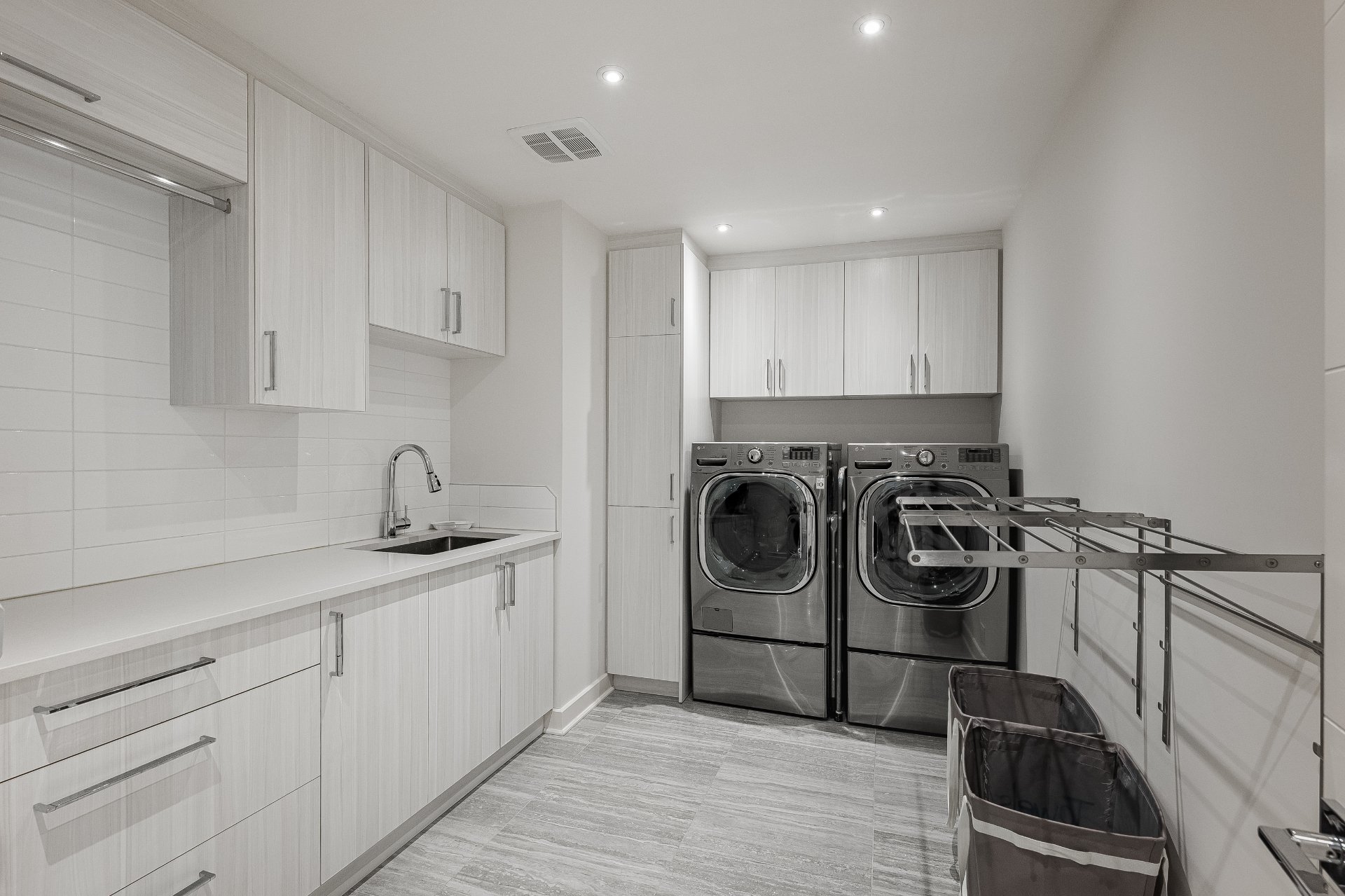 Luminaires, stores, réfrigérateur, plaque chauffante au gaz, 2 fours encastrés, lave-vaisselle, aspirateur central et accessoires, ouvre porte de garage électrique, étagères intégrées du cellier et compresseur (n'a jamais été mis en marche).