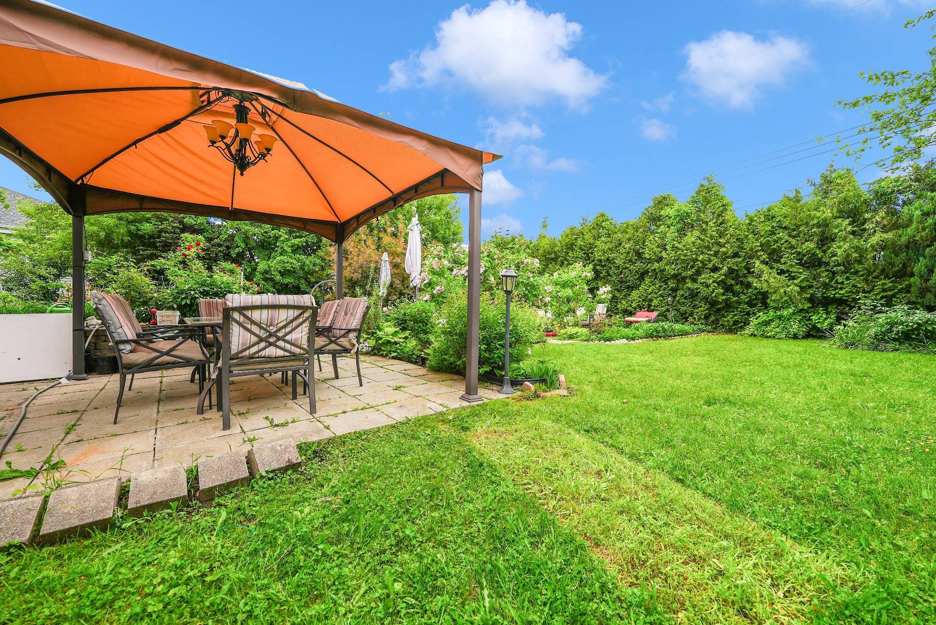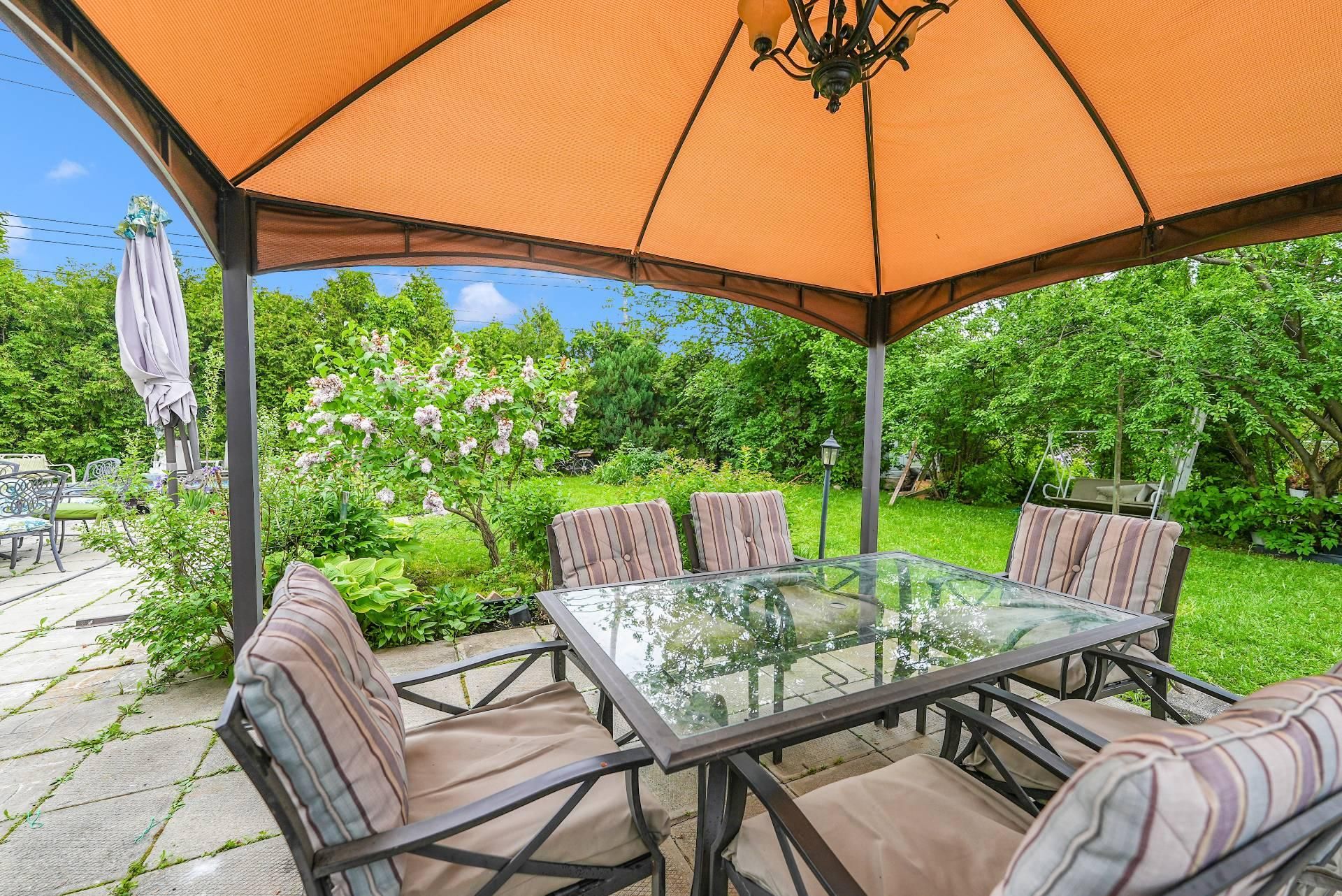 Refrigerator, kitchen hood, all curtain rods, blinds, curtains, and light fixtures, as well as the backyard gazebo and the white swing. In the basement, the inclusions are the glass shelves, mirror, sofas, and wooden shelves. The alarm system (currently not connected) and the central vacuum system are also included.