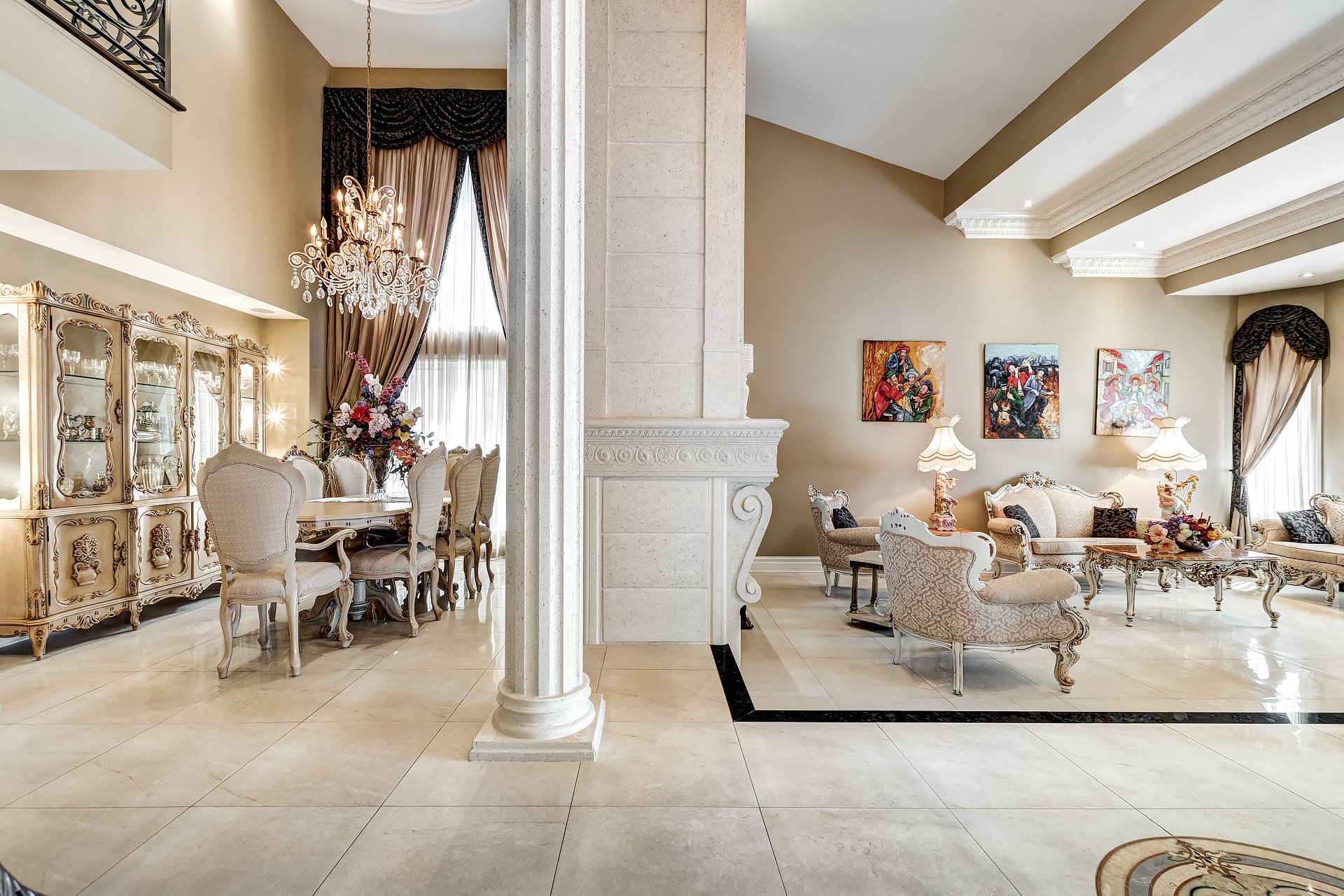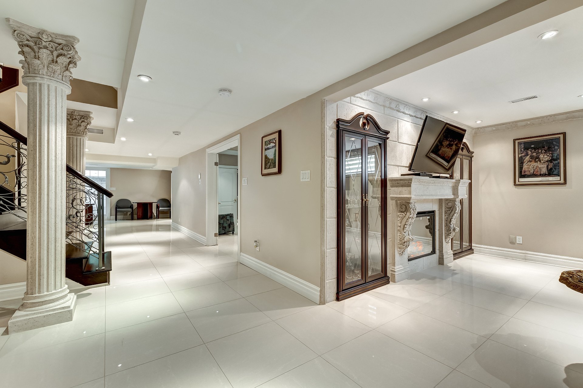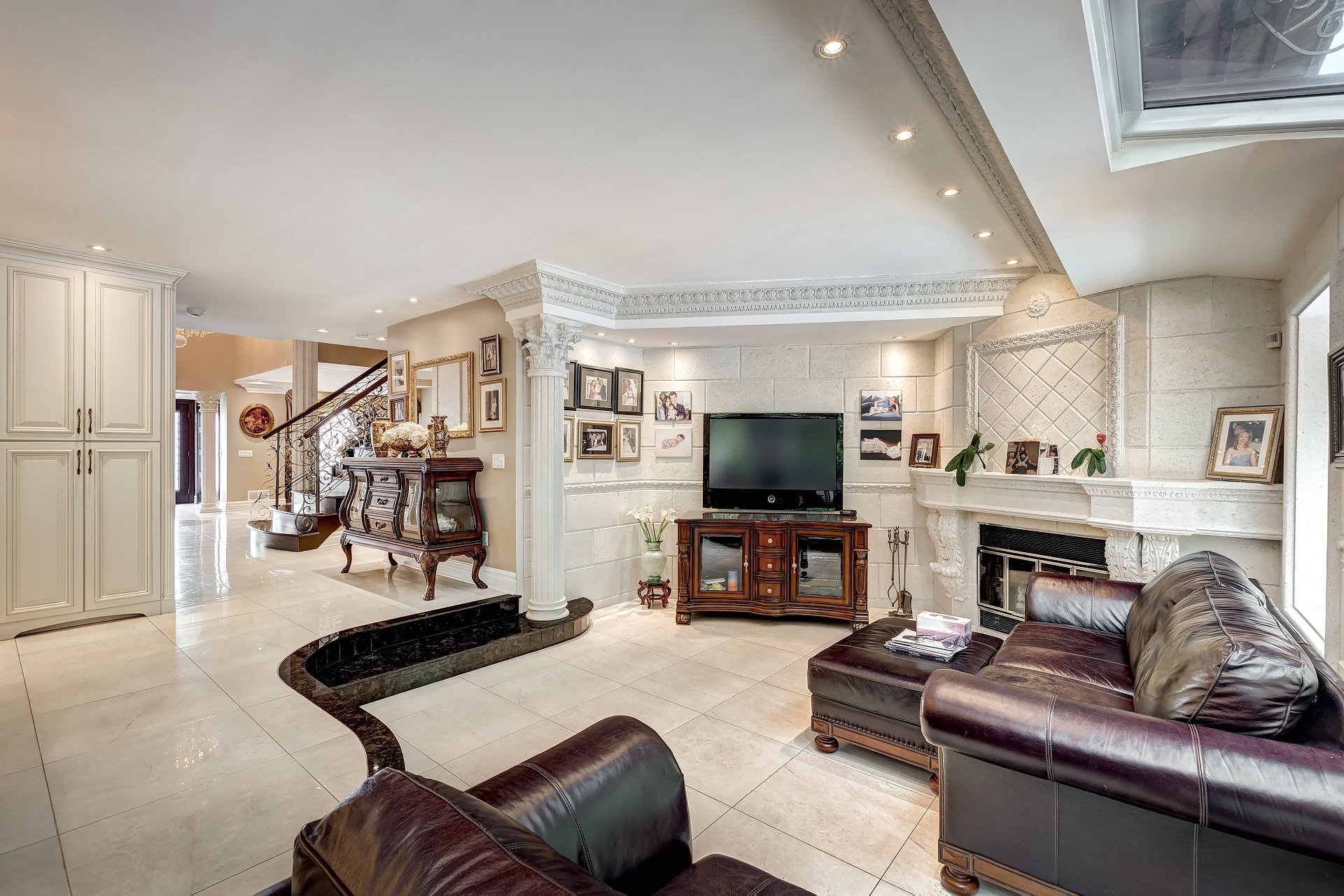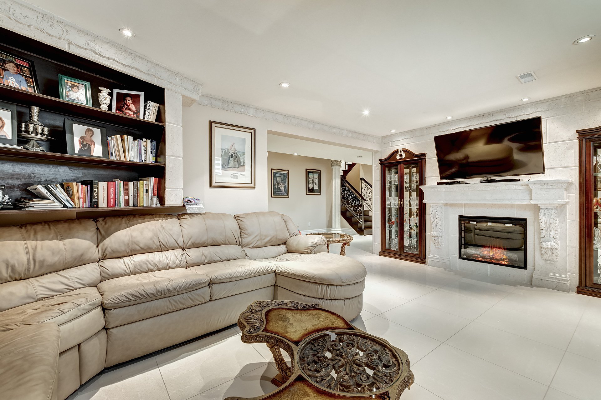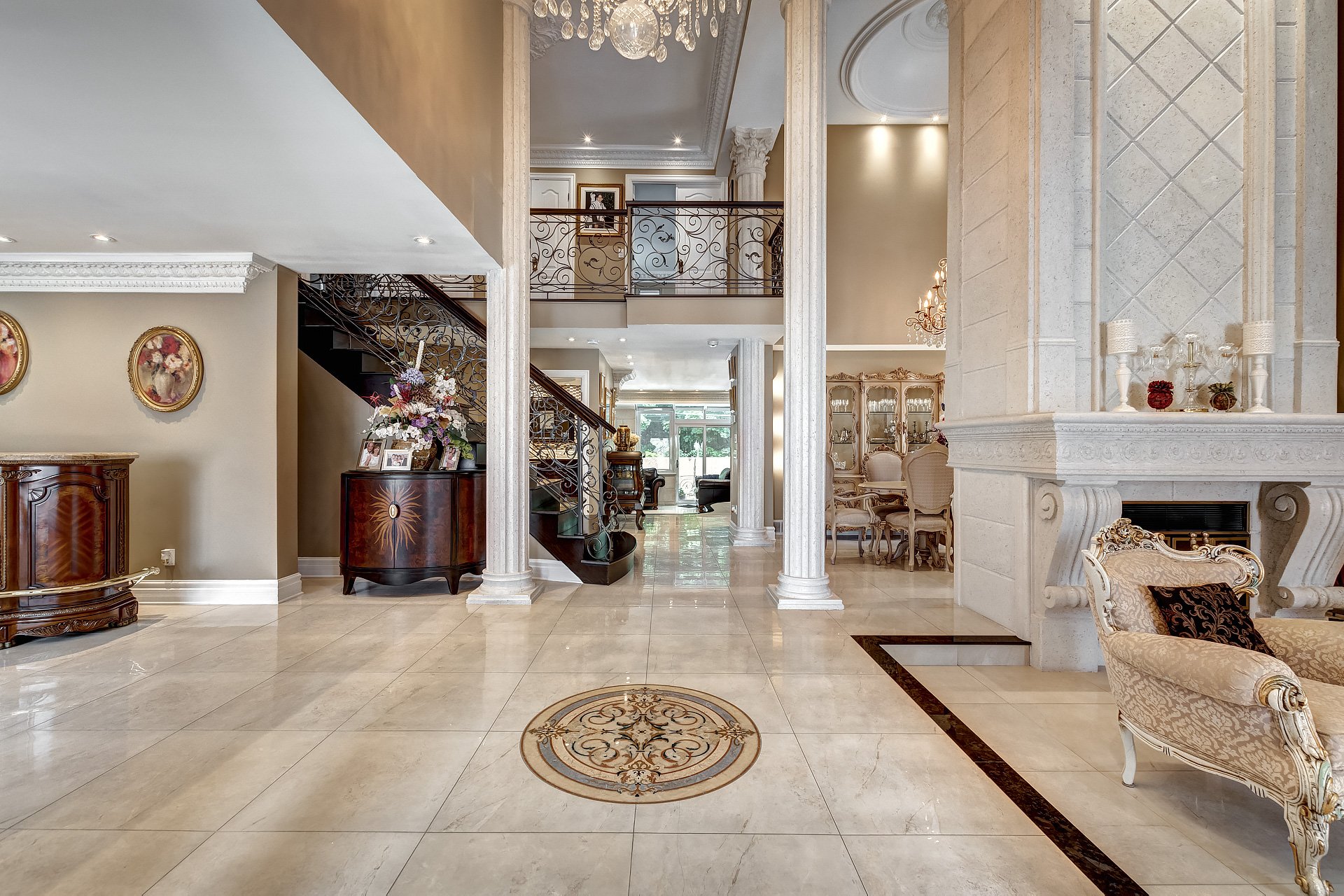 Discover this exceptional architectural residence, set on a spacious lot of over 7,300 sq. ft. in the heart of DDO. Built with remarkable craftsmanship to detail, this detached home features an open-concept layout with soaring 16-17' ceilings, exclusive marble flooring, and majestic Roman-inspired columns. Highlights include a dramatic two-story fireplace, 3+1 spacious bedrooms, 3+1 bathrooms, heated floors in the basement, and a resort-style backyard with a vast terrace and heated pool backing directly onto Centennial Park. A double garage and driveway for up to 5 cars. listing price was 1.985 million to 1.95 million and now is 1.925million