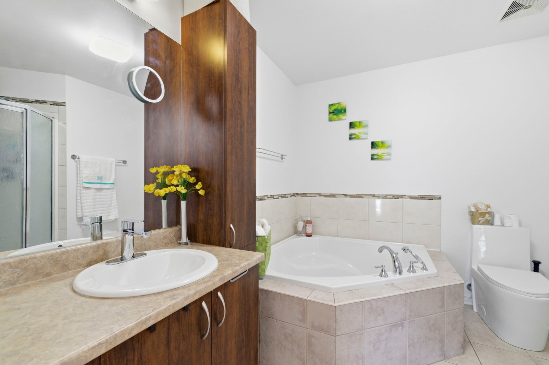 Stunning 3-level condo offering space, natural light, and comfort in a prime Laval location. Features 3 bedrooms upstairs + 1 in the basement. Modern kitchen with center island, bright south-facing living room. Fully finished basement with family room and 2nd full bathroom. Private fenced yard with terrace, 3 parking spaces in front (including 2 under temporary shelters). Peaceful, family-friendly neighborhood near schools, parks, shops, Cartier metro & major highways. A true turnkey property -- a must-see!