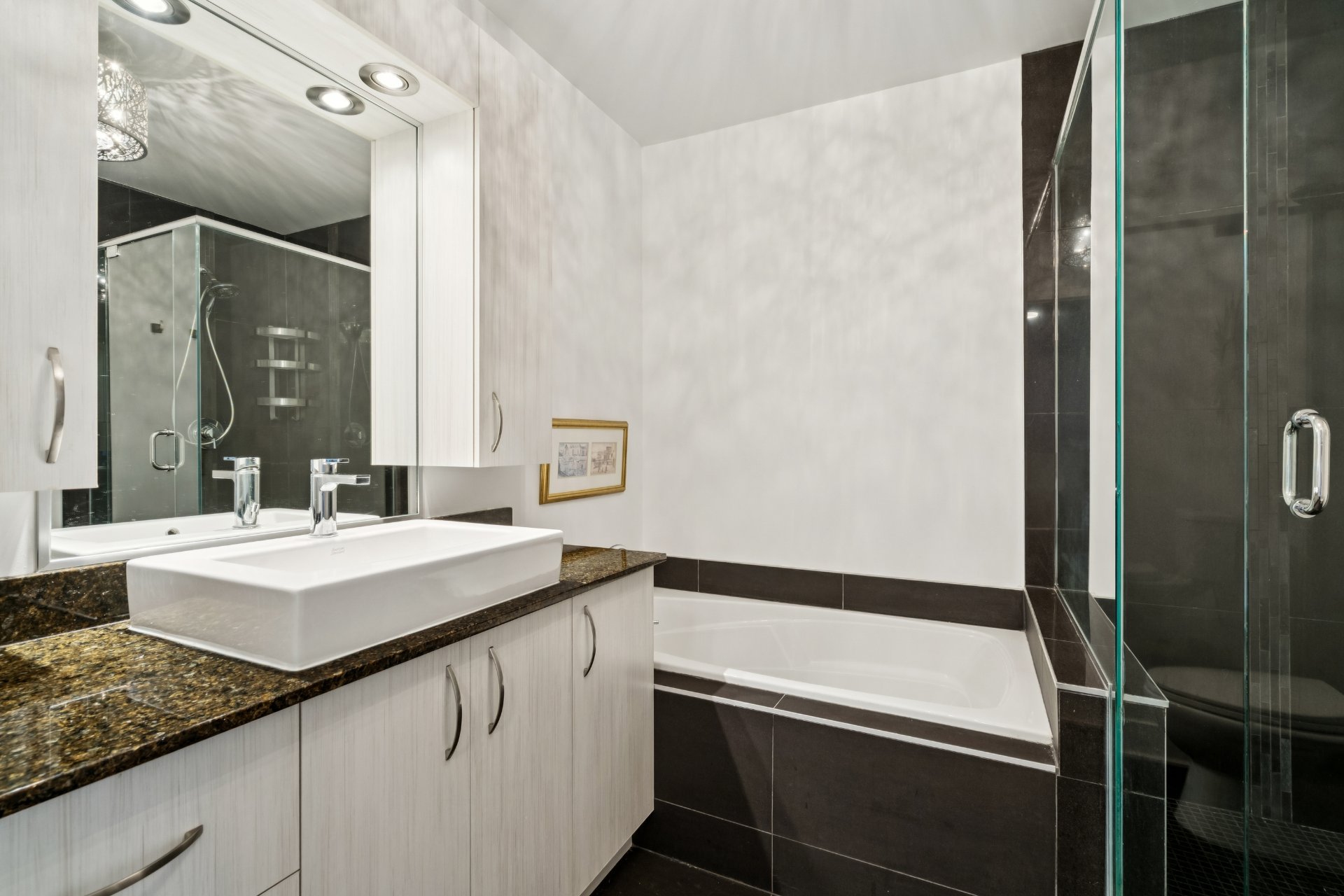 moderne, grand lavabo et une vanité offrant beaucoup de