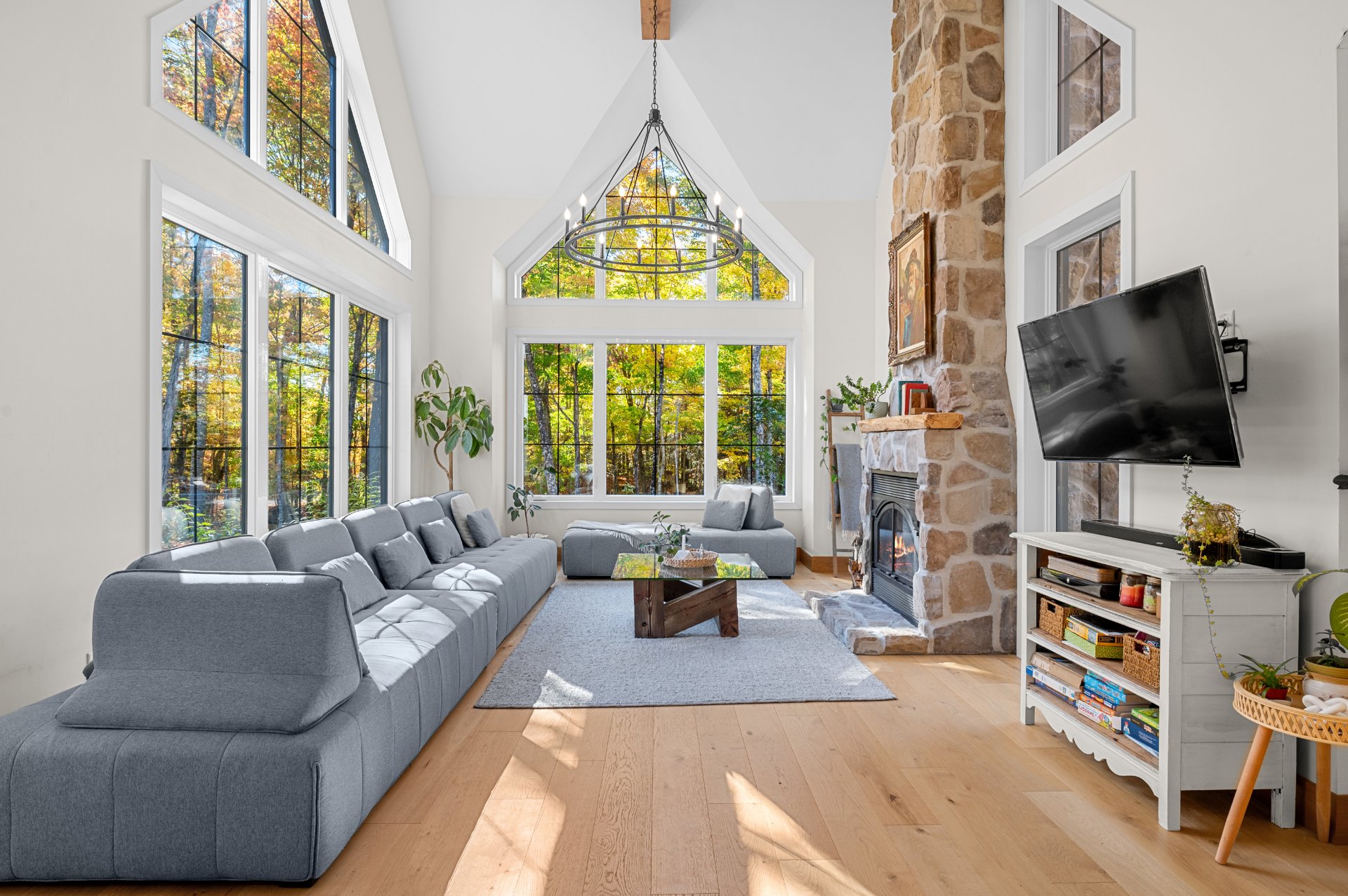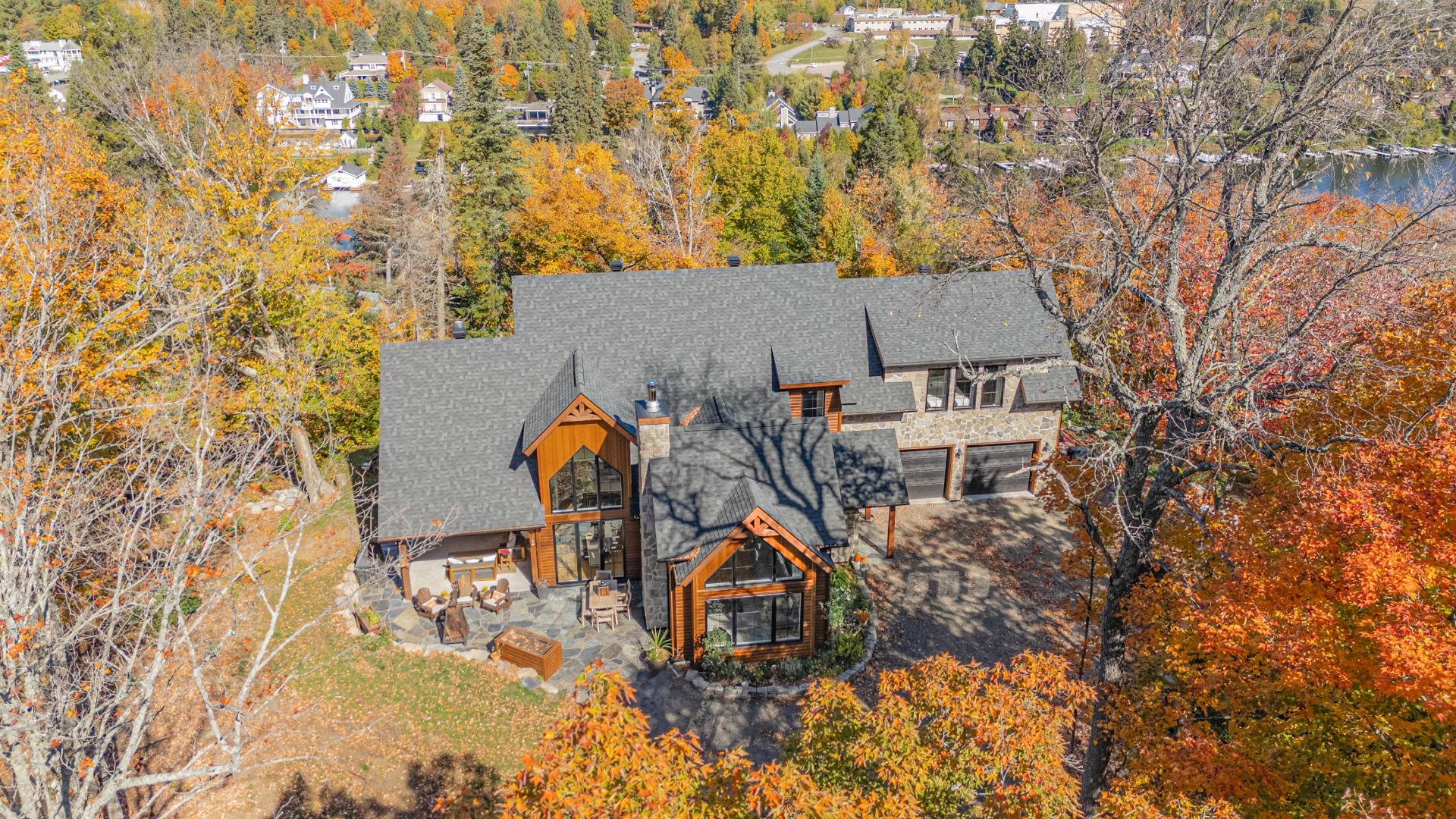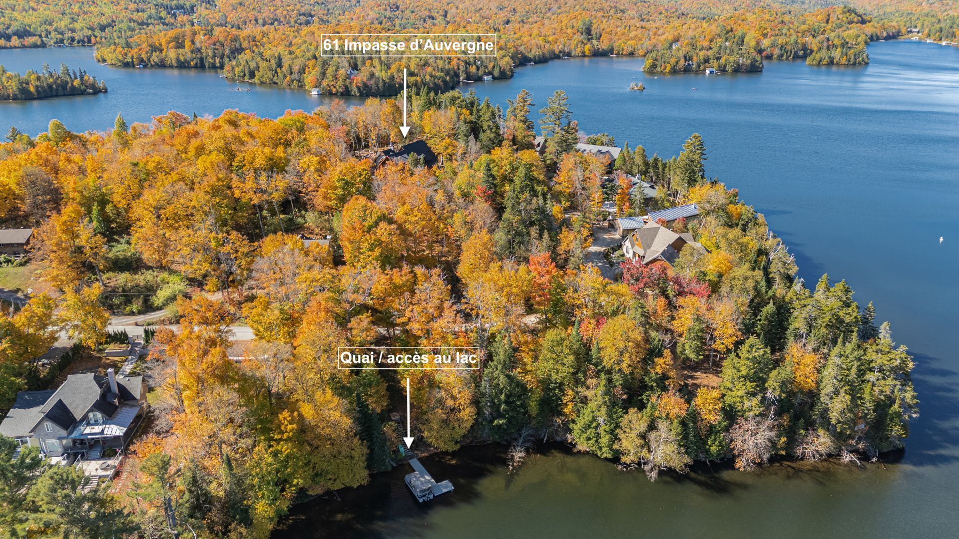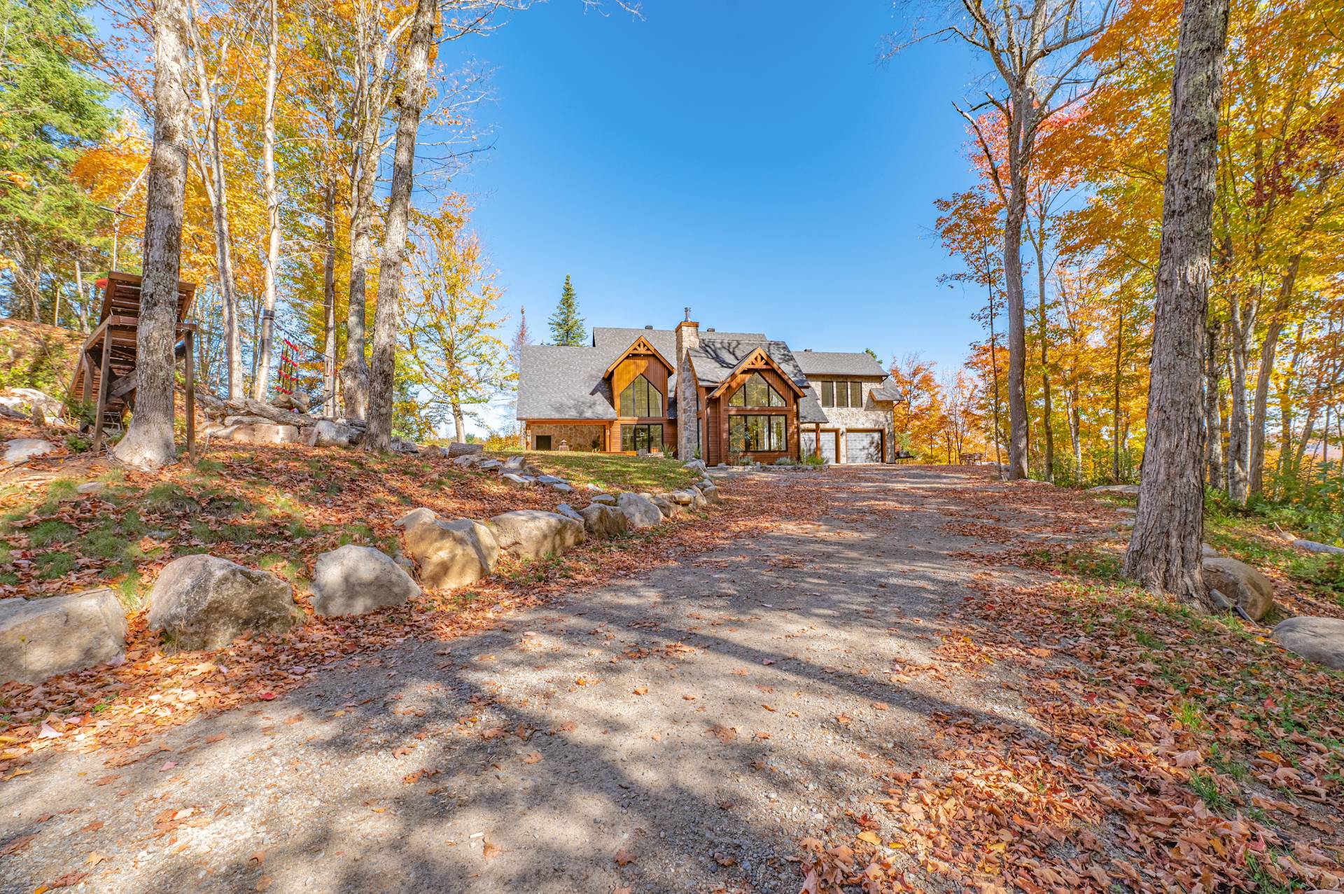 Magnificent property perched on the mountainside, within a private estate composed of four distinct lots. Its unique architecture combines the elegance of stone and the warmth of wood, blending seamlessly with its natural surroundings. Expansive windows flood the interior with light and highlight the cathedral ceilings. Featuring 4 bedrooms on the same level, 2 bathrooms, a double garage, and a private lakeside lot on Lac des Sables with a dock nestled in a peaceful and secluded bay.