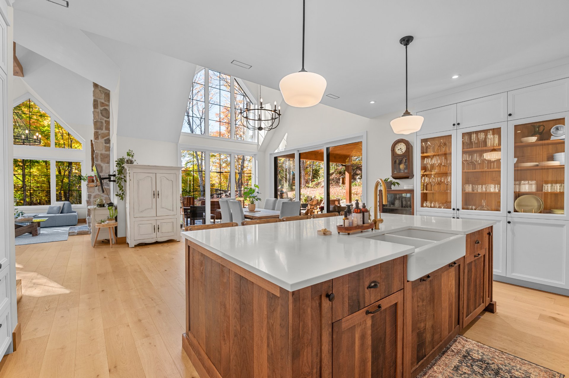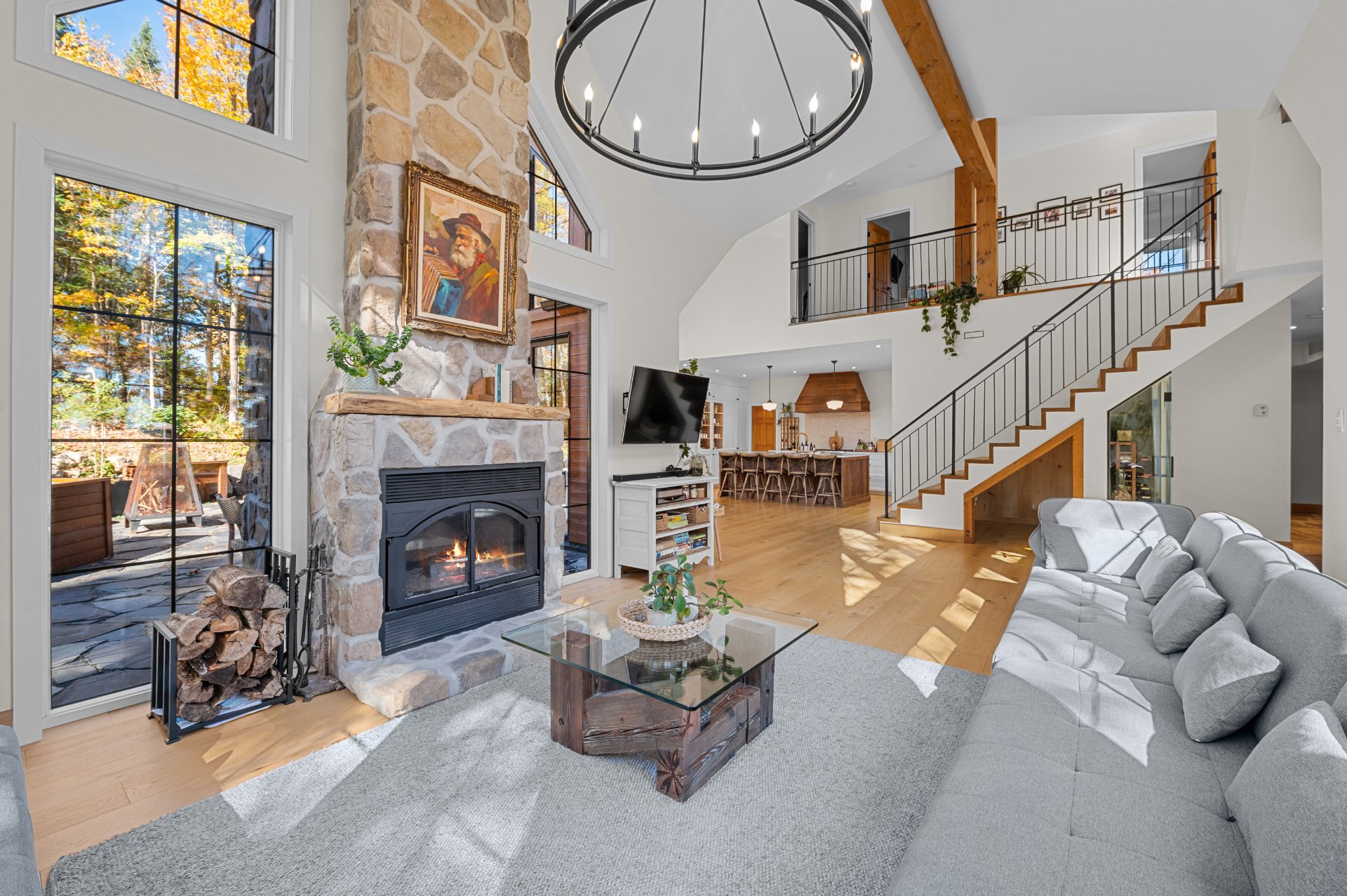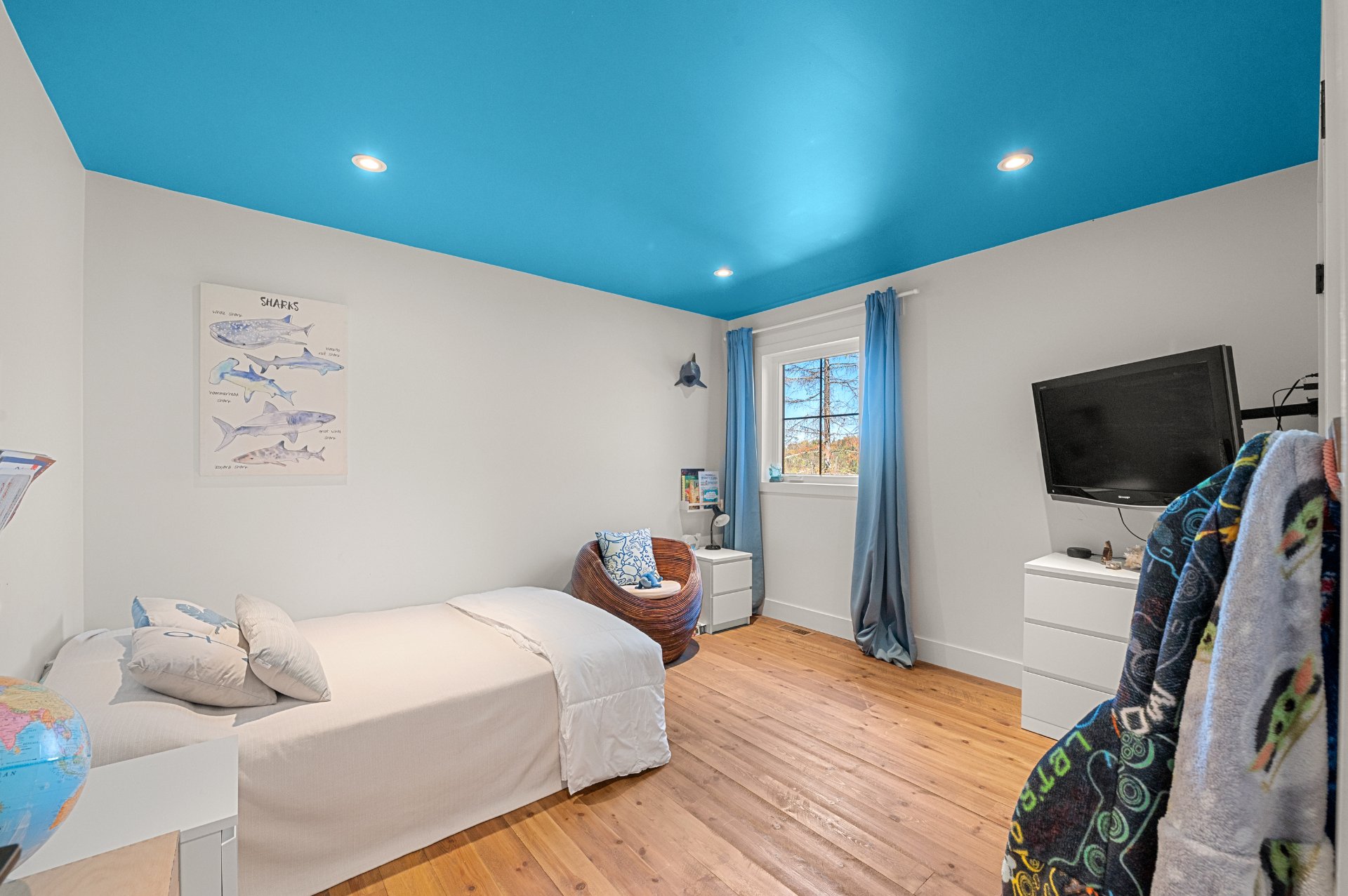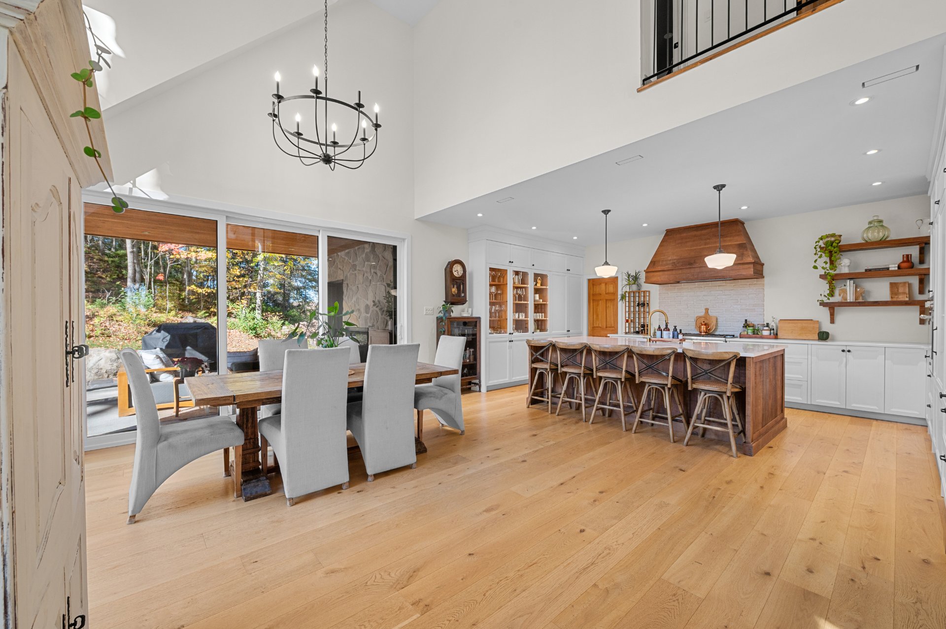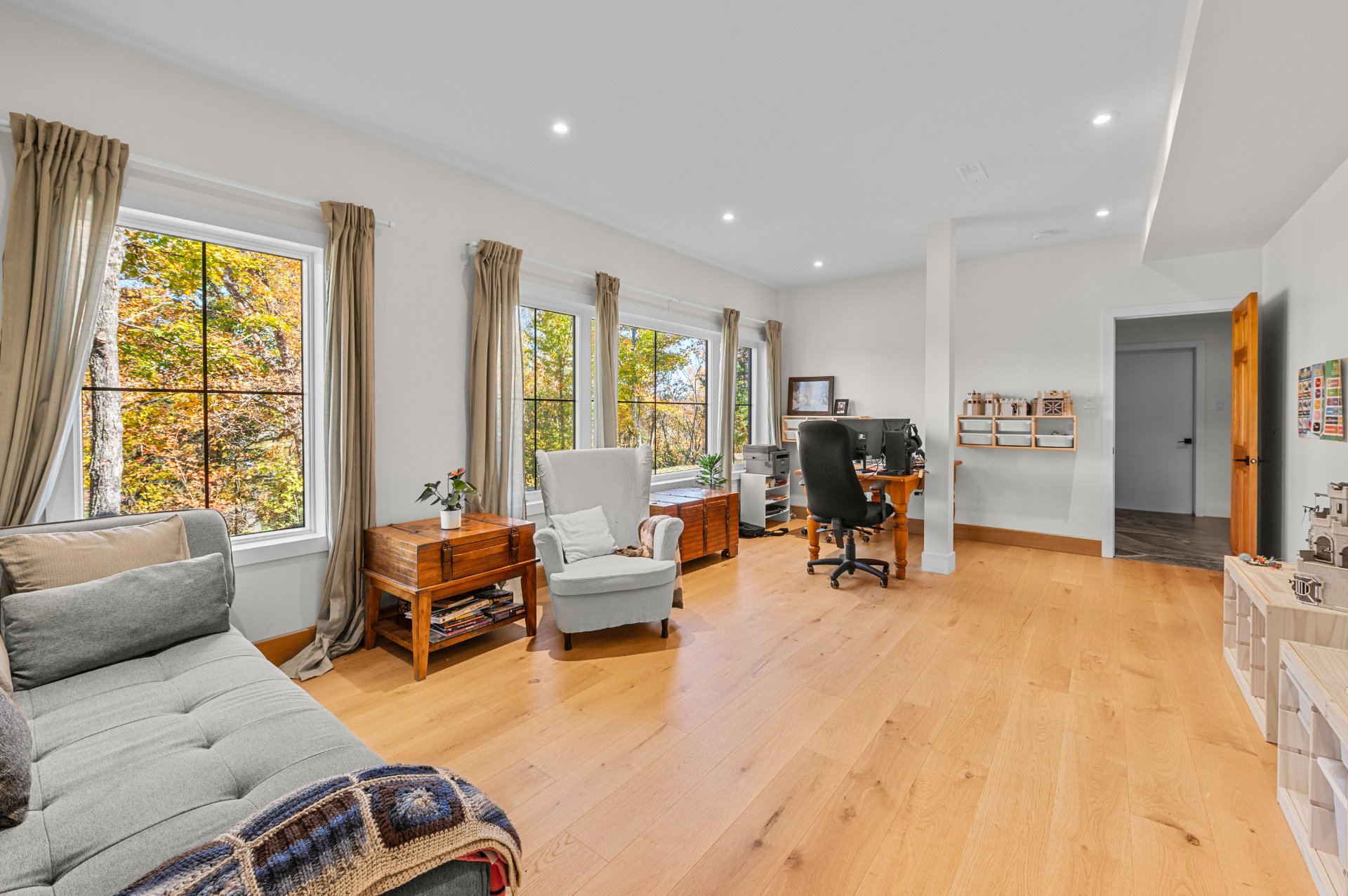 Magnificent property perched on the mountainside, within a private estate composed of four distinct lots. Its unique architecture combines the elegance of stone and the warmth of wood, blending seamlessly with its natural surroundings. Expansive windows flood the interior with light and highlight the cathedral ceilings. Featuring 4 bedrooms on the same level, 2 bathrooms, a double garage, and a private lakeside lot on Lac des Sables with a dock nestled in a peaceful and secluded bay.