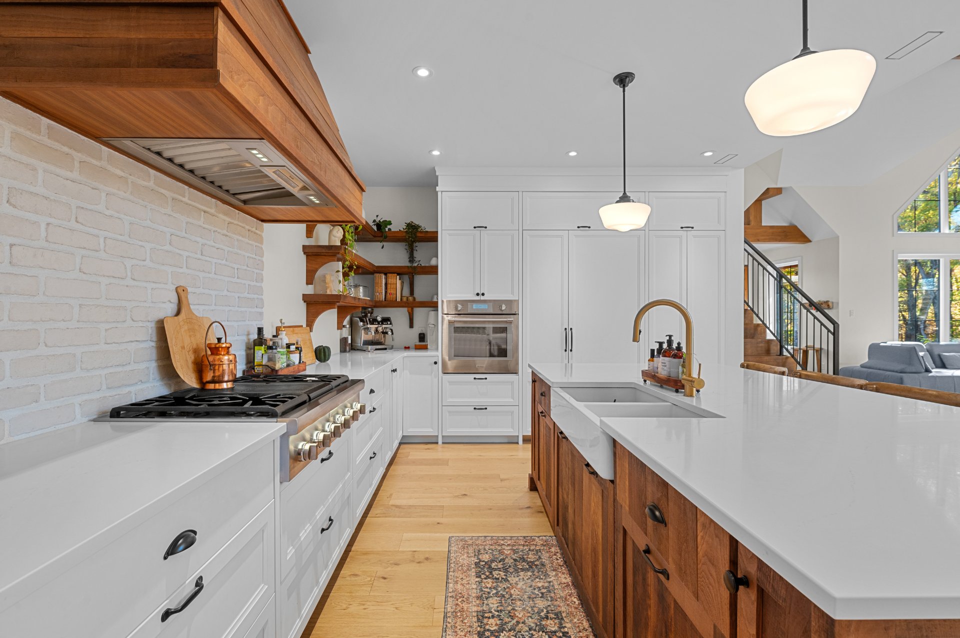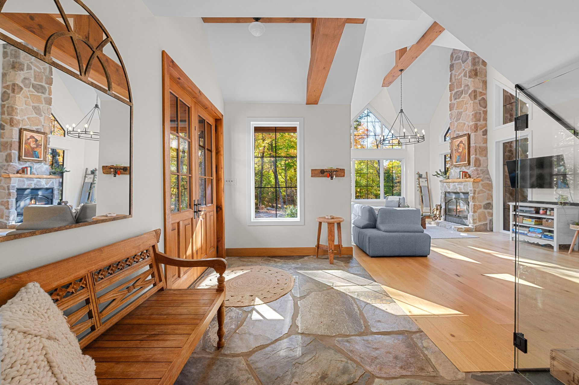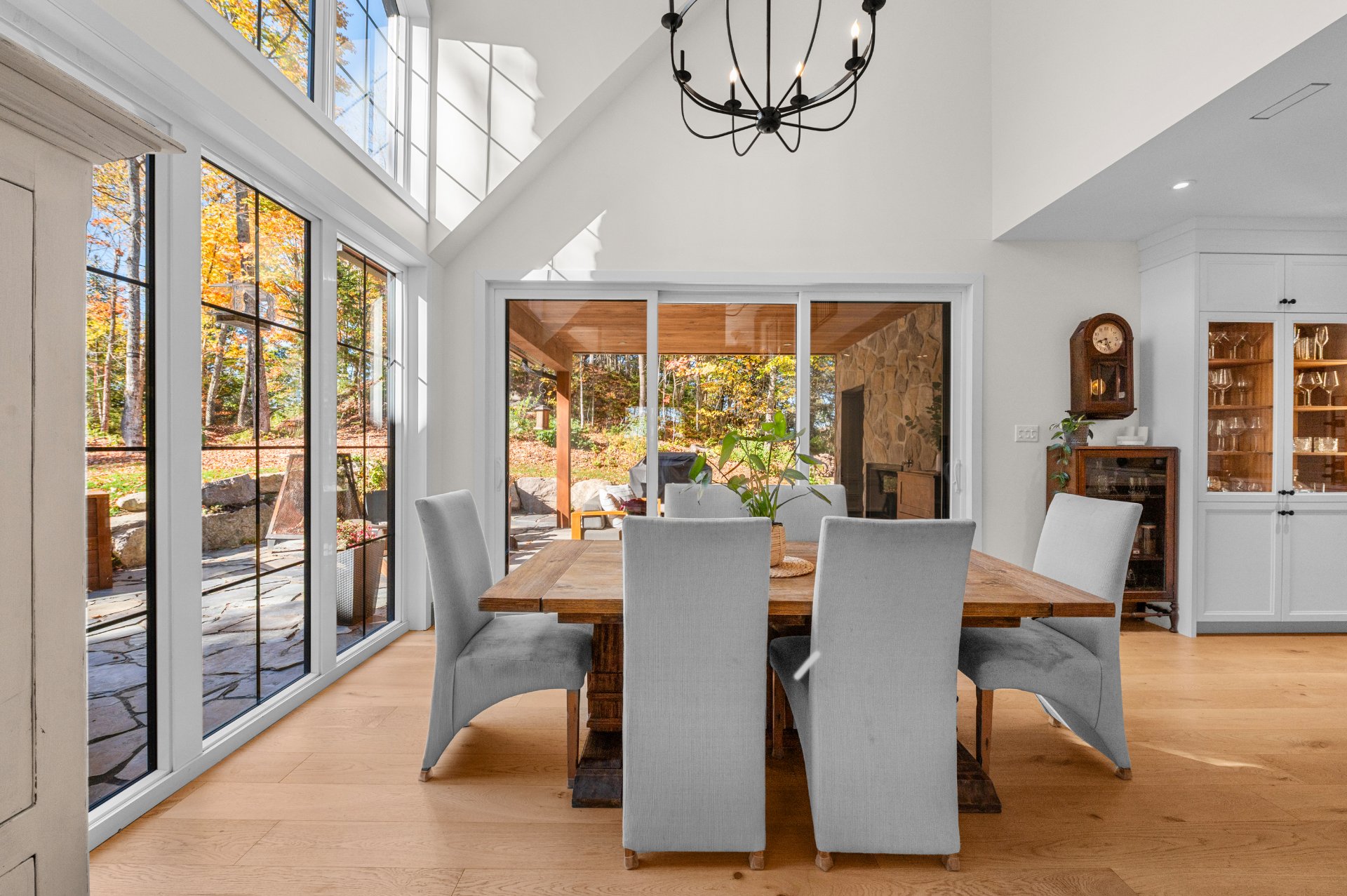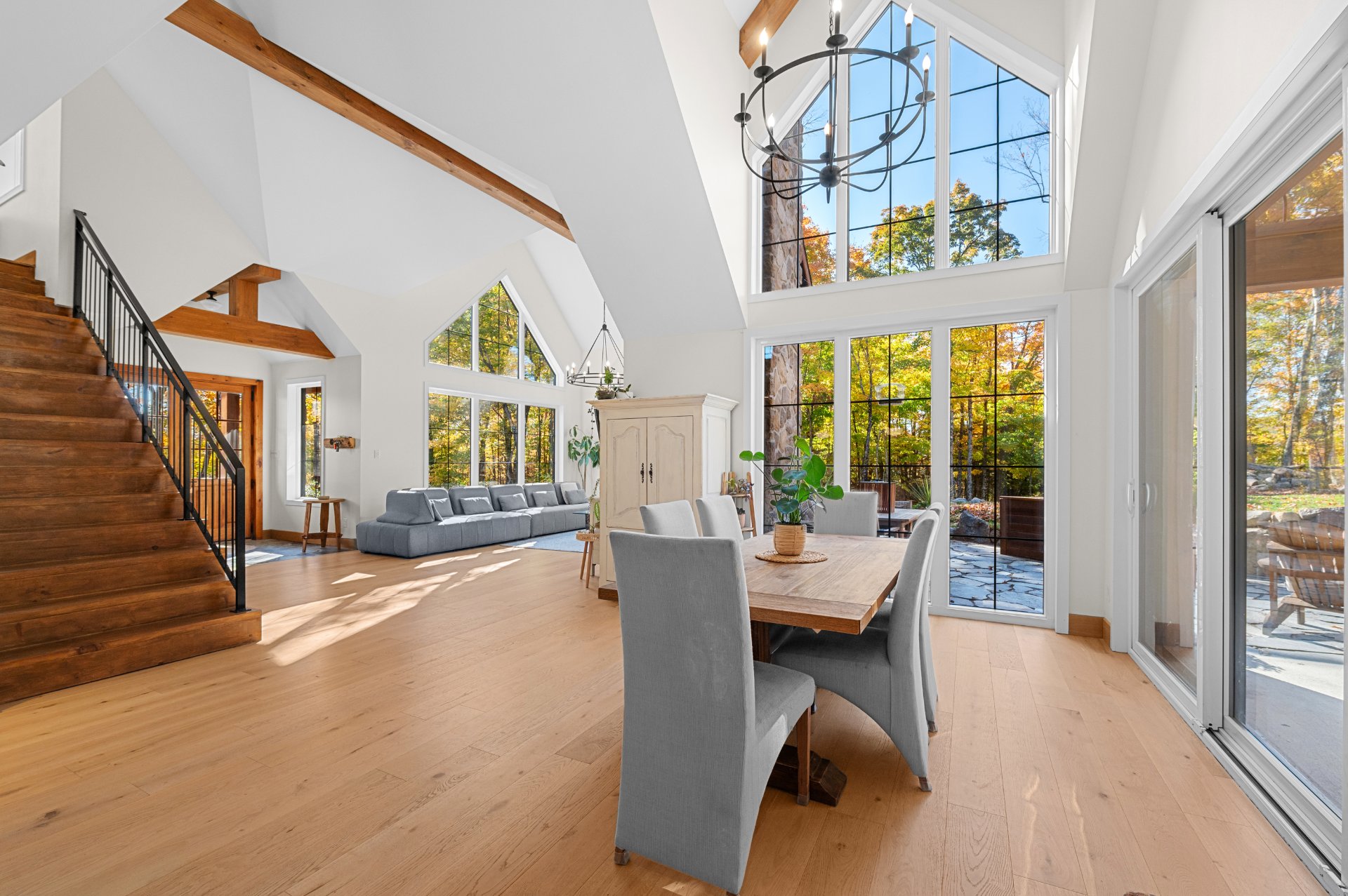 Magnificent property perched on the mountainside, within a private estate composed of four distinct lots. Its unique architecture combines the elegance of stone and the warmth of wood, blending seamlessly with its natural surroundings. Expansive windows flood the interior with light and highlight the cathedral ceilings. Featuring 4 bedrooms on the same level, 2 bathrooms, a double garage, and a private lakeside lot on Lac des Sables with a dock nestled in a peaceful and secluded bay.